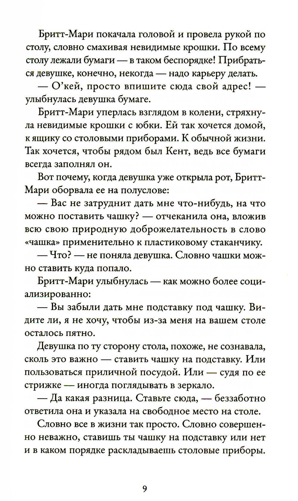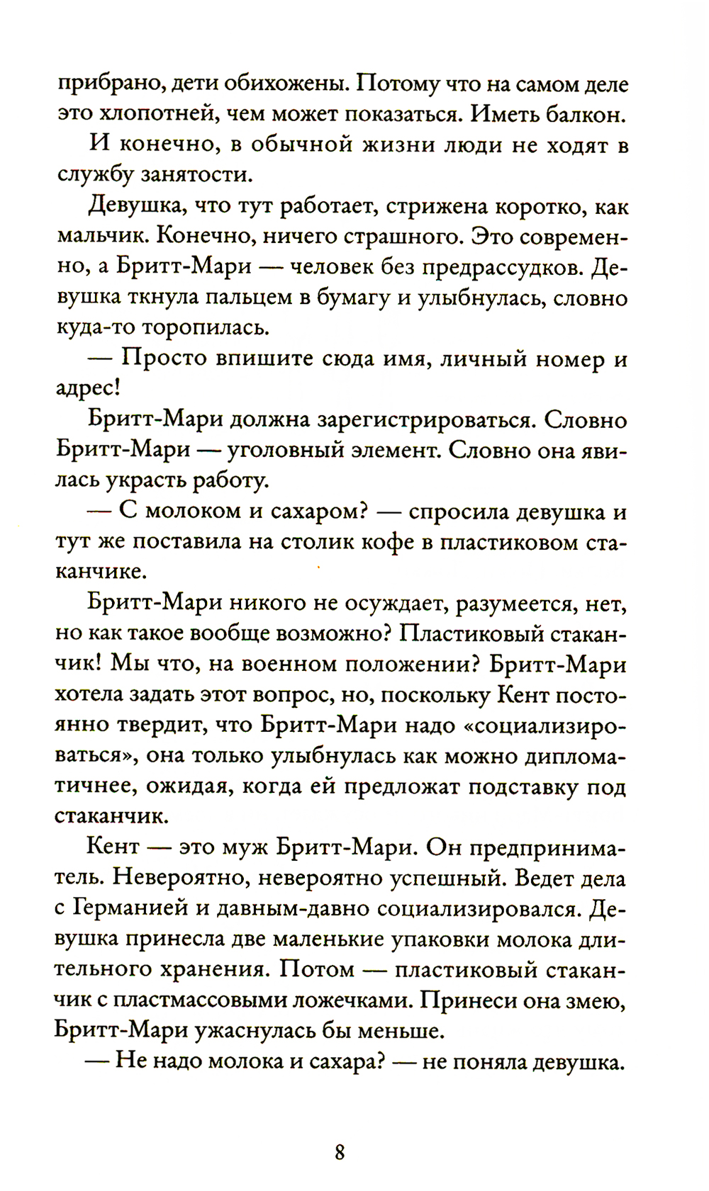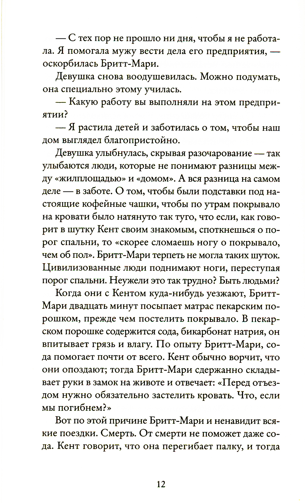 Бритт-Мари - не самый легкий в общении человек. Не то чтобы она была как-то особенно упряма, капризна или придирчива - просто свято уверена, что всегда, везде и во всем должен быть абсолютный порядок. Но весь порядок рушится в одно мгновение, когда Бритт-Мари узнает, что Кент, с которым они сорок лет прожили в образцовом браке, изменил ей. Она принимает удивительное для самой себя решение - собрать чемодан и уехать куда глаза глядят. В захолустном провинциальном городишке с не очень приветливым населением Бритт-Мари придется налаживать новую жизнь. Которая окажется совершенно непохожей на прежнюю.| Издательство | Синдбад |