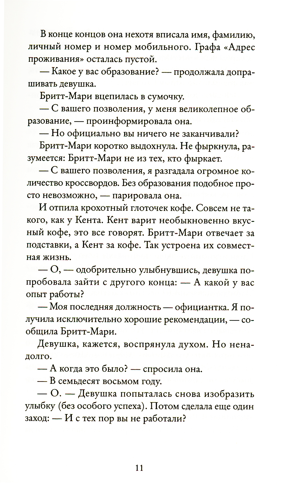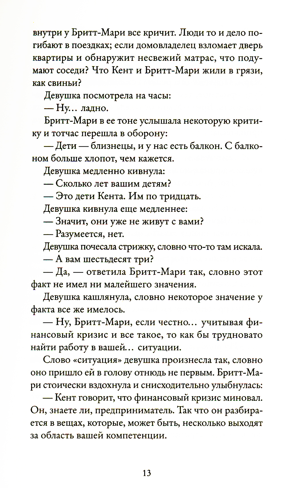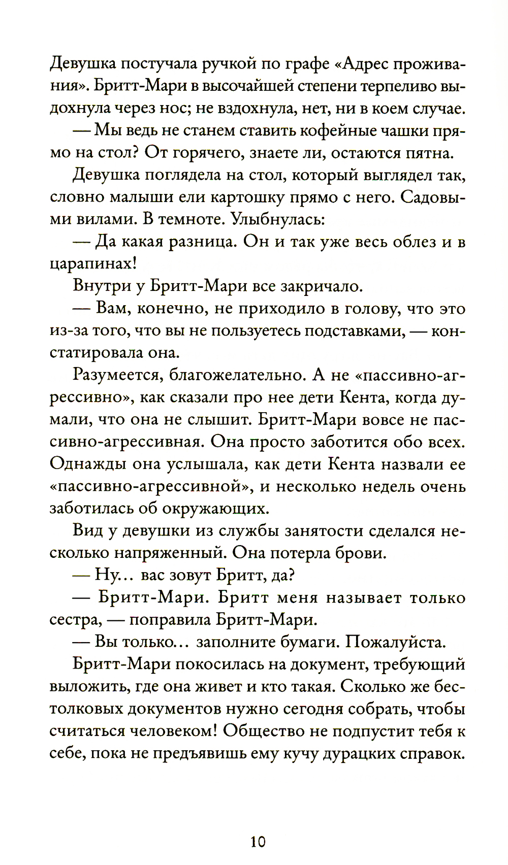 Бритт-Мари - не самый легкий в общении человек. Не то чтобы она была как-то особенно упряма, капризна или придирчива - просто свято уверена, что всегда, везде и во всем должен быть абсолютный порядок. Но весь порядок рушится в одно мгновение, когда Бритт-Мари узнает, что Кент, с которым они сорок лет прожили в образцовом браке, изменил ей. Она принимает удивительное для самой себя решение - собрать чемодан и уехать куда глаза глядят. В захолустном провинциальном городишке с не очень приветливым населением Бритт-Мари придется налаживать новую жизнь. Которая окажется совершенно непохожей на прежнюю.| Издательство | Синдбад |