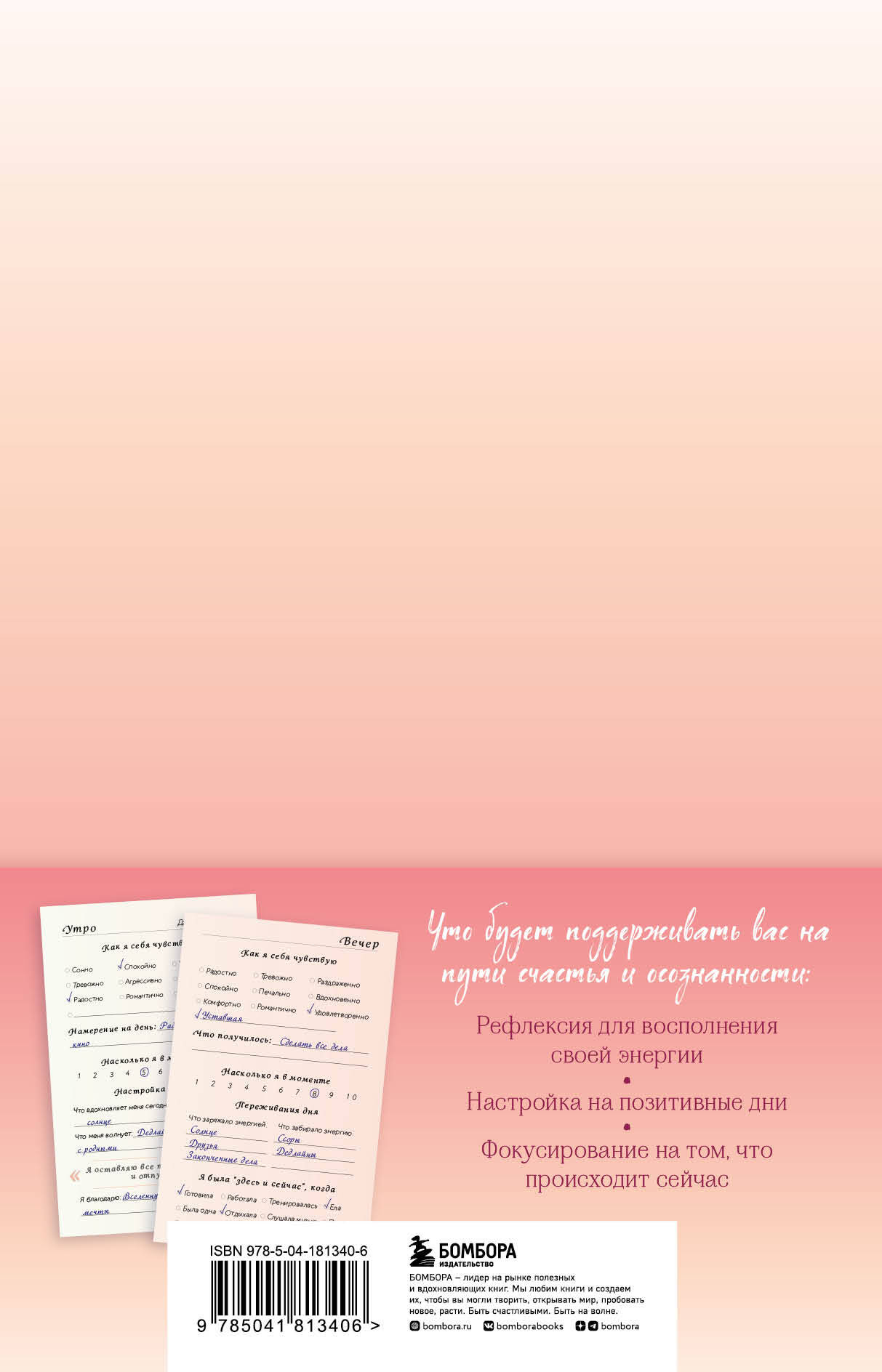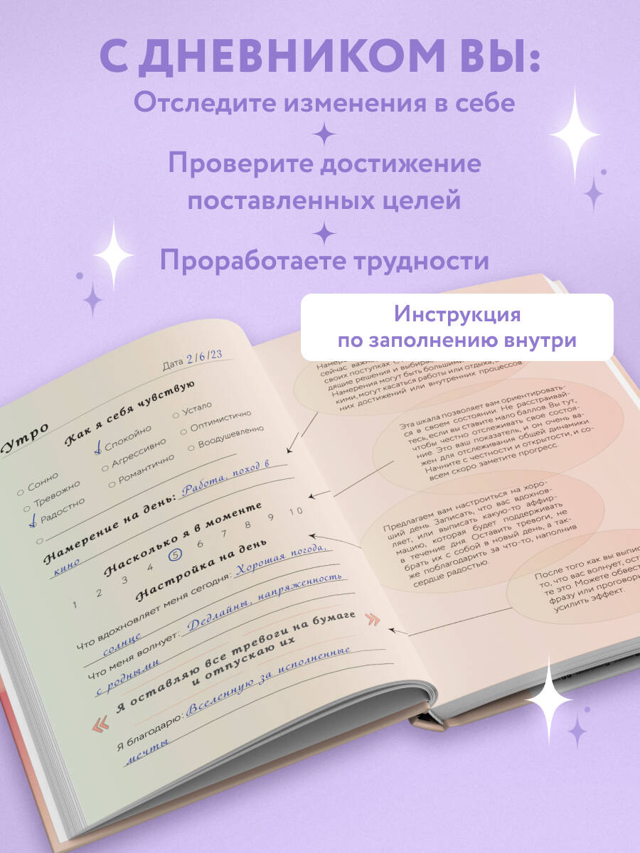 Этот блокнот - чудесная компания для всех, кто хочет оставаться «здесь и сейчас», всегда хорошо себя чувствовать и улучшать качество жизни. Внутри удобная сетка для дневной и вечерней рефлексии, которая позволяет отслеживать свои цели, держать фокус на важном и находить время для восстановления и отдыха. В нашем плотном ежедневном графике легко потерять фокус на настоящем моменте и на том, что для нас действительно важно. В этом блокноте найдется место для записи ваших мыслей и чувств. Ежедневная запись позволит отслеживать ваше состояние в динамике и видеть, какие события и сферы жизни как влияют на ваше здоровье и эмоциональное состояние - и регулировать присутствие тех или иных вещей в своей жизни, постепенно восполнять ресурс своей энергии и поддерживать его на высоком уровне. Что будет поддерживать вас на пути к осознанности: • Отслеживание своего самочувствия. • Рефлексия и работа с энергозатратными событиями. Поможет включаться в жизнь и внимательно наблюдать за тем, что приносит вам силы, а что забирает их. • Утренняя настройка, чтобы каждый день был наполнен позитивом. • Постоянное отслеживание своей включенности в события. • Планирование и подведение итогов позволит всегда держать в фокусе самое важное и не забывать о том, что вам ценно развивать и поддерживать в жизни. • Внутри бережная инструкция, чтобы заполнение блокнота приносило только приятные эмоции!| Издательство | ООО "Издательство "Эксмо" |