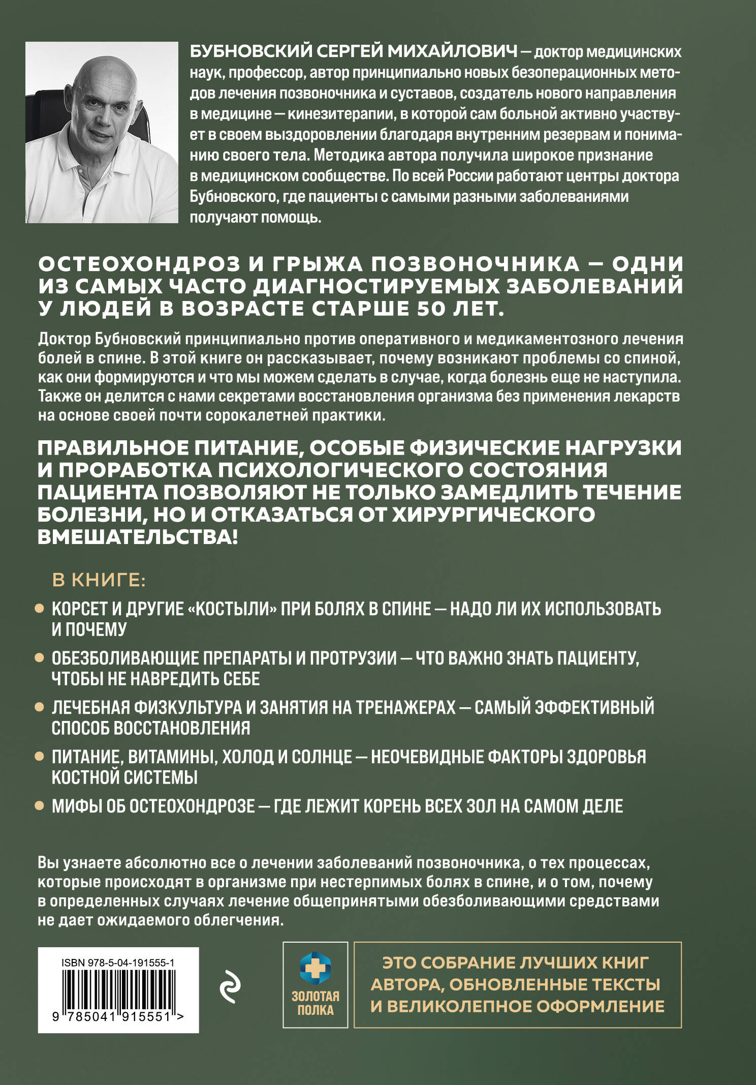 Что такое боль в спине? Как быть со страхами, возникающими у человека при диагнозе «грыжа позвоночника» или «остеохондроз»? Какой путь выбрать для борьбы с этими проблемами? Из новой книги доктора Бубновского вы узнаете, почему на самом деле диагноз «грыжа позвоночника» - это уловка, махинация, а не настоящее заболевание. Поймете, какие причины приводят к болям в спине, и определите для себя реальные физические упражнения, способные улучшить состояние без лекарств и операции. А полезные и мотивирующие истории других пациентов подарят надежду и хорошее настроение, ведь чужой пример выздоровления - это всегда еще и новые идеи, новый опыт. Нужен ли корсет при болях в спине? Что такое правильное движение? Как преодолеть страх перед зарядкой? Что есть, чтобы восстановить костную массу при остеохондрозе? На эти и другие вопросы отвечает доктор Бубновский, имеющий за плечами более тридцати лет работы с самыми тяжелыми случаями болезни и умеющий справляться с ними без хирургических вмешательств.| Издательство | ООО "Издательство "Эксмо" |