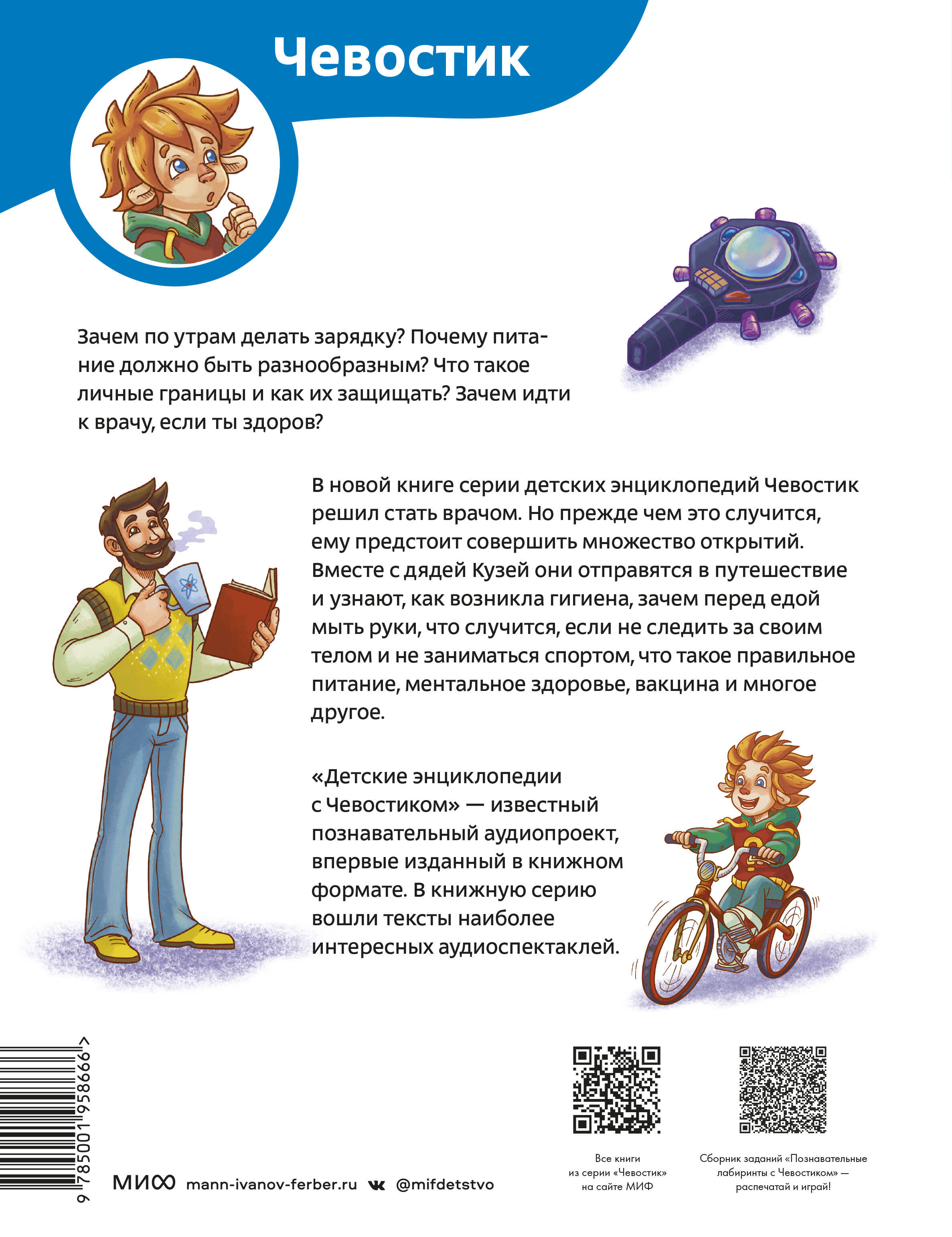 Энциклопедия о здоровье человека. Она расскажет ребенку о полезных привычках и зачем они нужны, ответит на вопросы о правильном питании и спорте и научит заботиться о себе. В новой книге серии детских энциклопедий Чевостик решил стать врачом. Но сначала ему предстоит совершить множество открытий. Вместе с дядей Кузей они отправятся в путешествие и узнают, как возникла гигиена и зачем перед едой мыть руки, почему нужно делать зарядку, правильно питаться и заниматься спортом, что такое ментальное здоровье и как заботиться о нем. Маленькие читатели узнают много интересного и полезного о здоровом образе жизни и поймут, почему следить за своим здоровьем нужно с детства. Кто такой Чевостик? Чевостик - симпатичный герой из известного аудиопроекта. Сегодня ребята знают его по энциклопедиям. В серии продолжают выходить книги, которые объясняют детям устройство мира. Дети гораздо лучше воспринимают информацию, когда о мире им рассказывает какой-нибудь сказочный персонаж. Именно поэтому девчонки и мальчишки так любят подобные энциклопедии. Чевостик вместе с дядей Кузей совершает удивительные путешествия в мир наук: физики, химии, астрономии, анатомии, геологии и других. Он рассказывает детям о великих географических открытиях, покорении космоса и волшебных химических превращениях. Для кого эта книга: Для любознательных детей в возрасте от 6 лет. Для всех-всех фанатов Чевостика. Для младших школьников.| Издательство | МАНН, ИВАНОВ И ФЕРБЕР ООО |