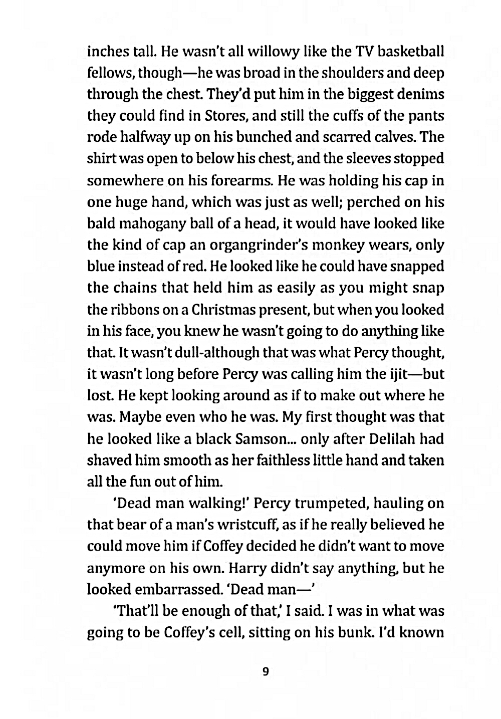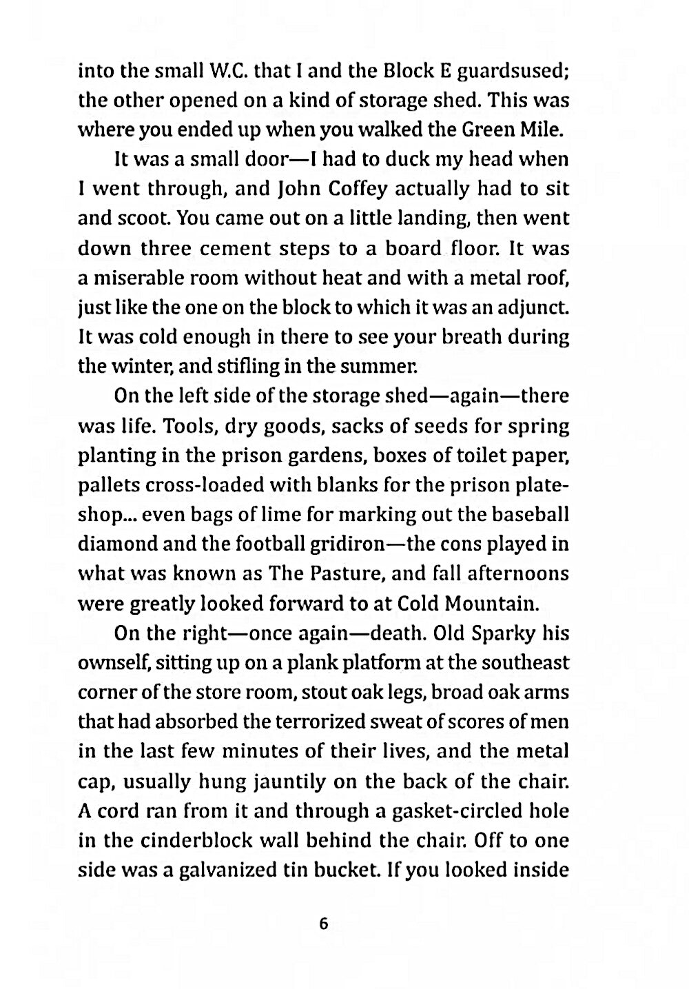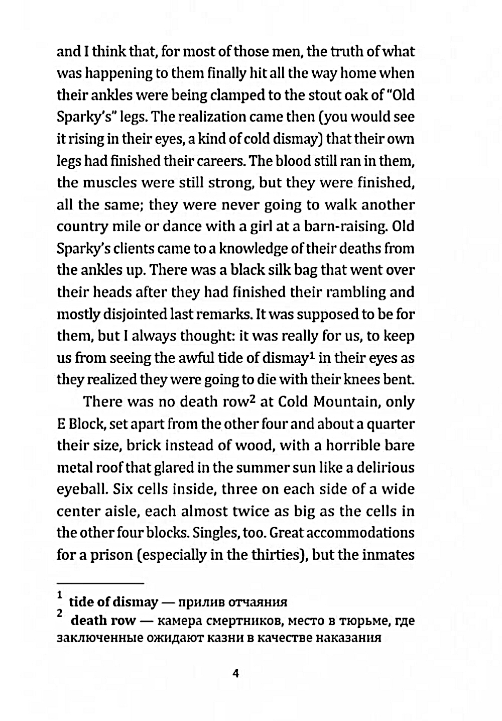 Те, кто прошел «зеленую милю» тюрьмы «Холодная гора», не возвращаются, потому что в конце этого пути стоит электрический стул, и пройти этот путь можно только в одну сторону... Трудно какому бы то ни было произведению сравниться с этим неоднозначным, уникальным, пронзительным романом. Это история с чудесными и отвратительными героями, с невероятным в своей несправедливости сюжетом. История, наполненная отчаянием и болью тех, кто находится на пороге смерти. И несмотря ни на что, это история о Чуде, наполненная любовью и надеждой. Текст публикуется с незначительными сокращениями.| Издательство | Каро |