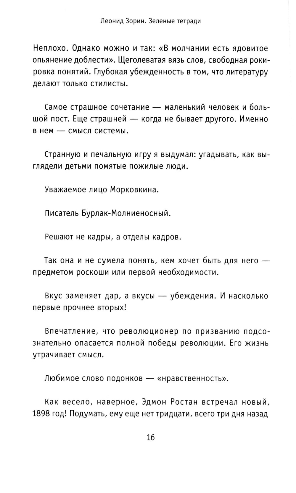 В книгу выдающегося драматурга и прозаика Леонида Зорина (1924-2020) вошли записи, охватывающие более чем полувековой период, начиная с 1950-х и по 1999 год. По словам автора, «Зеленые тетради» - это биография мысли: здесь собраны его размышления, наблюдения, юмористические пассажи и «словечки». Разбитые по десятилетиям, эти записи, в которые включены драматические вставки, представляют собой диалог Леонида Зорина с временем. Блестящий интеллект, независимость суждений, остроумие и эрудиция автора, внимательно вслушивающегося в разноголосицу эпохи, делают книгу не только уникальным комментарием к ней, но и литературным событием. Первое издание этой книги, выпущенной «Новым литературным обозрением» (1999), стало библиографической редкостью.| Издательство | Новое литературное обозрение |