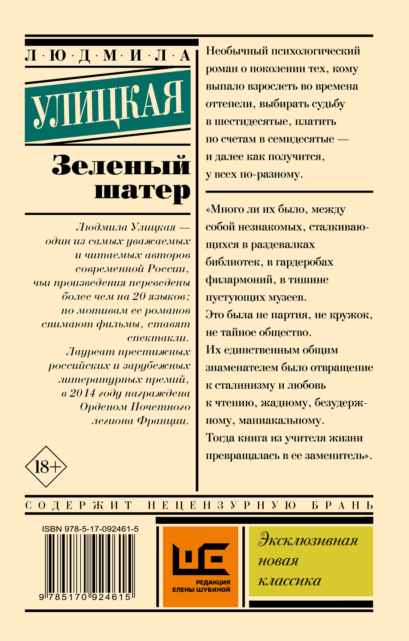Людмилу Улицкую не раз называли очень внимательным свидетелем эпохи, ее цепким наблюдателем и интерпретатором. Пожалуй, более всего это относится к роману "Зеленый шатер". Роману о поколении тех, кому выпало взрослеть во времена оттепели, выбирать судьбу в шестидесятые, платить по счетам в семидесятые и далее… как получится, у всех по-разному. Калейдоскоп судеб от смерти Сталина до смерти Бродского, хор голосов и сольные партии, переплетение исторических реалий и художественного вымысла…