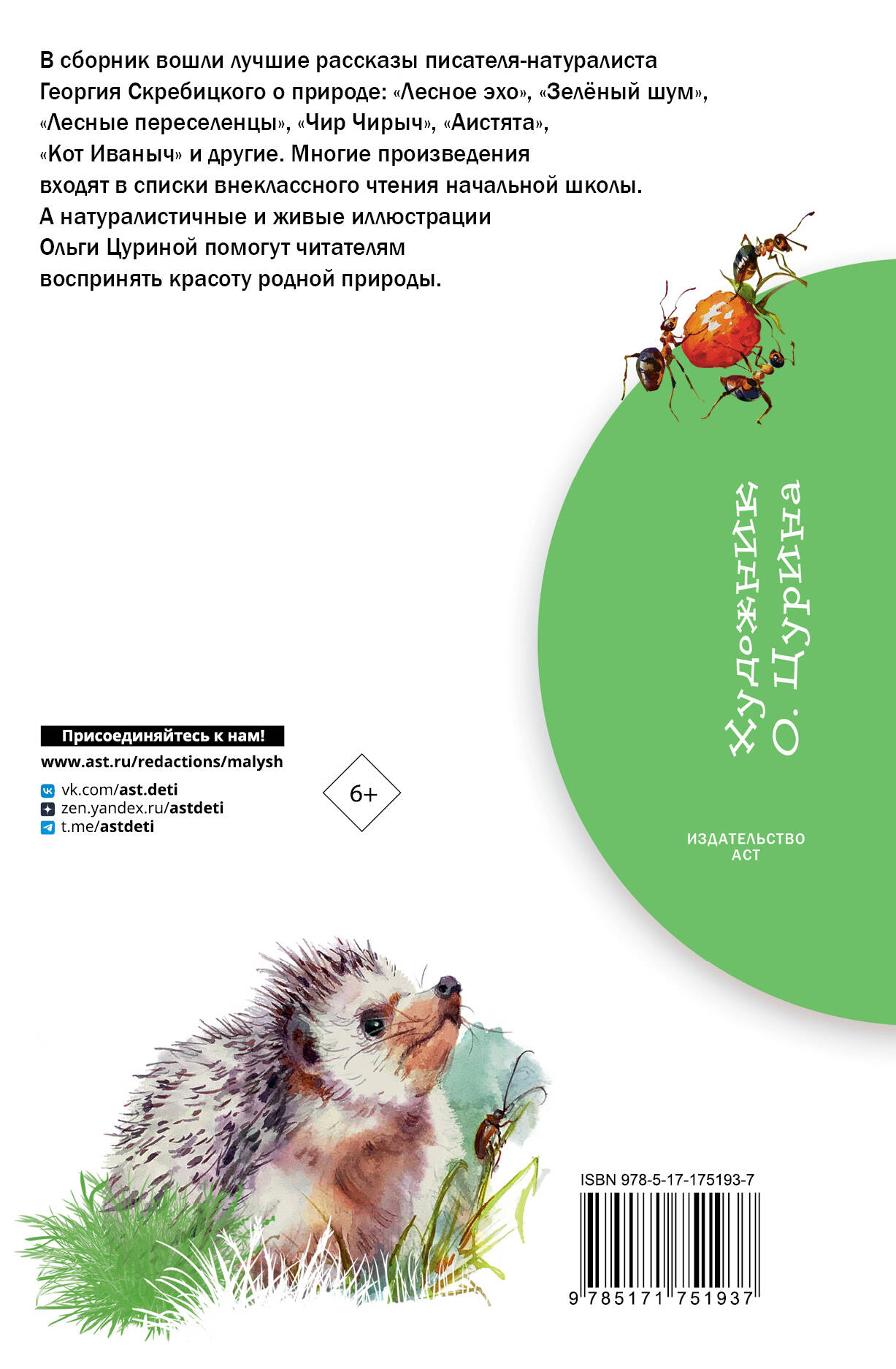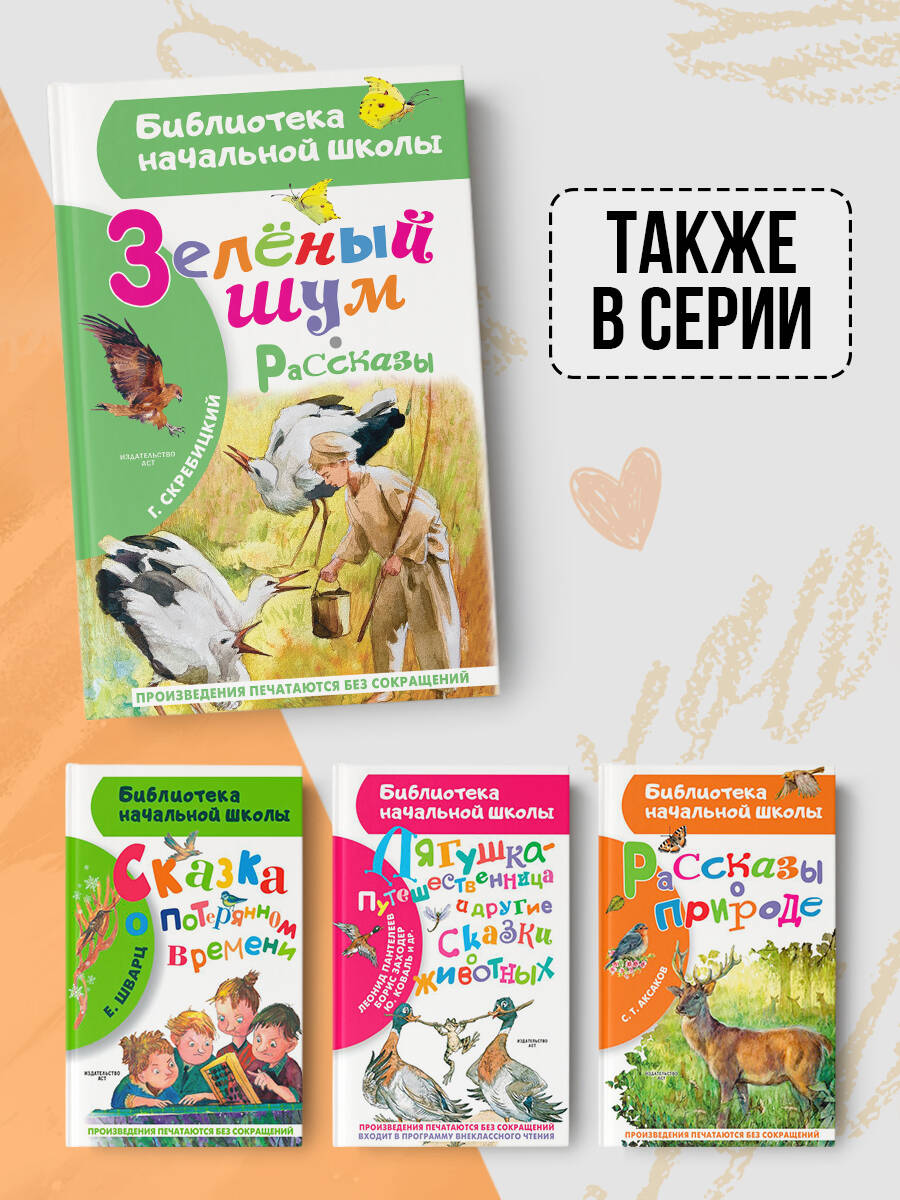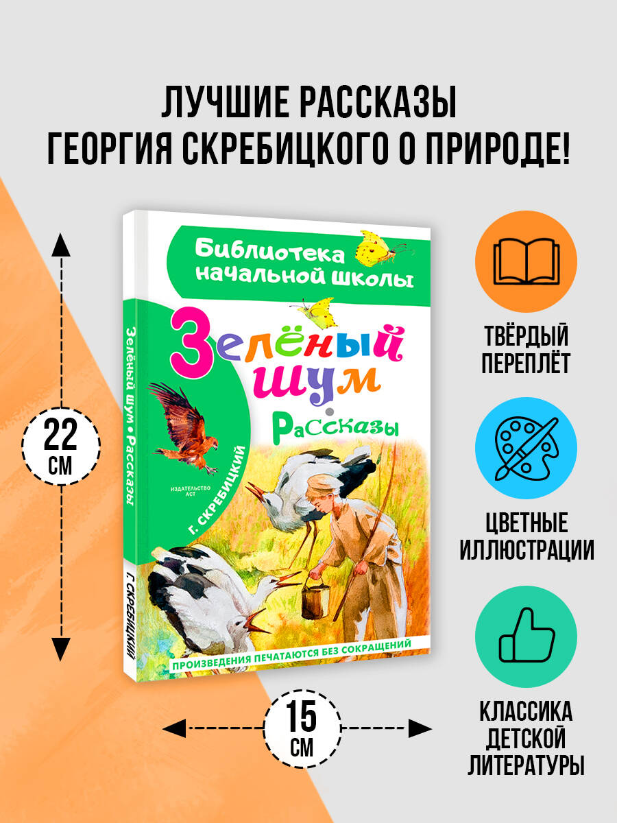 Причины приобрести книгу Георгия Скребицкого «Зеленый шум» Рассказы Георгия Алексеевича о родной природе настолько интересны и красочны, что по ним сделано несколько мультфильмов «Лесные путешественники» (1951) и «В лесной чаще» (1954) (в соавторстве с Верой Чаплиной). Также они часто встречаются в списках внеклассного чтения, так что сборник поможет младшеклассникам. Произведения добрые и душевные, ненавязчиво показывают ребенку как прекрасна его страна и разнообразна ее природа. Особый колорит сборнику придают уникальные, красочные и в то же время натуралистичные иллюстрации Ольги Цуриной.| Издательство | Издательство "АСТ" |