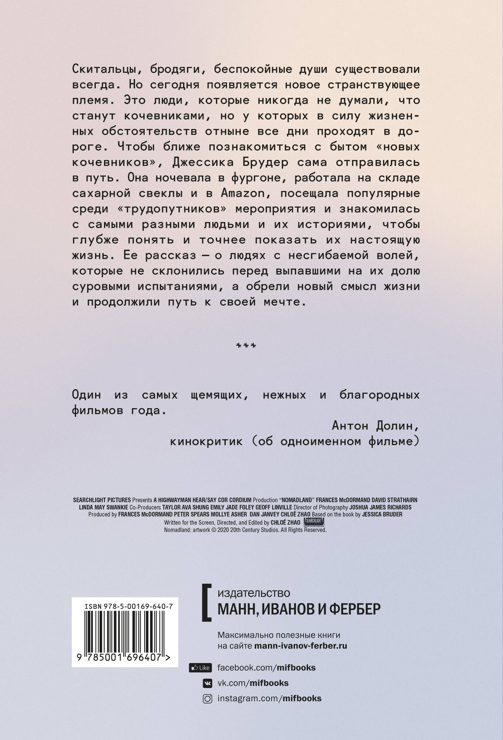 Джессика Брудер рассказывает истории тех, кто вынужден скитаться по дорогам Америки, параллельно раскрывая подноготную американской экономики. Автор встретила бывшего профессора, вице-президента McDonald's, министра, администратора колледжа и полицейского на мотоциклах, а также среди многих других - 60-летнюю Линду Мэй, успевшую побывать официанткой, клерком Home Depot и генеральным подрядчиком, но оставшуюся без работы и дома. Их выбор ― погрузить свой небогатый скарб в фургон и стать одними из племени современных кочевников. Окунувшись в этот уникальный образ жизни, Брудер рассказывает истории людей, у которых есть настоящая выдержка, которые адаптируются, устойчивы, и полны решимости осуществить свои мечты. "Земля кочевников" переведена на 11 языков. По книге вышел фильм, который стал обладателем "Золотого льва" Венецианского кинофестиваля, "Золотого глобуса", приза зрительских симпатий на Международном кинофестивале в Торонто и одним из основных претендентов на Оскар-2021. Главную роль играет актриса Фрэнсис Макдорманд. Антон Долин назвал фильм "одним из самых щемящих, нежных и благородных фильмов года".| Издательство | МАНН, ИВАНОВ И ФЕРБЕР ООО |