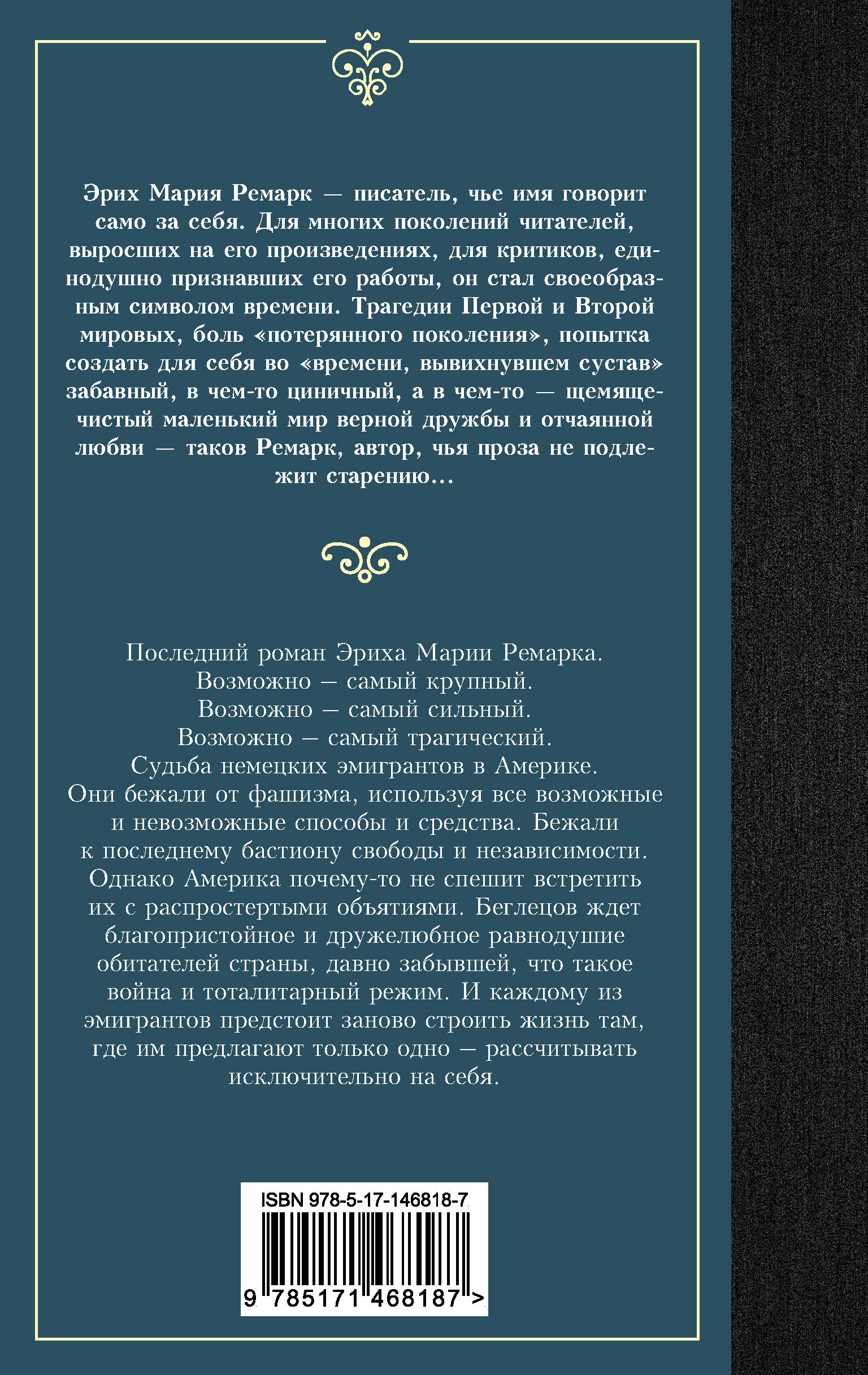 Последний роман Эриха Марии Ремарка. Возможно - самый крупный. Возможно - самый сильный. Возможно - самый трагический. Судьба немецких эмигрантов в Америке. Они бежали от фашизма, используя все возможные и невозможные способы и средства. Бежали к последнему бастиону свободы и независимости. Однако Америка почему-то не спешит встретить их с распростертыми объятиями. Беглецов ждет благопристойное и дружелюбное равнодушие обитателей страны, давно забывшей, что такое война и тоталитарный режим. И каждому из эмигрантов предстоит заново строить жизнь там, где им предлагают только одно - рассчитывать исключительно на себя.| Издательство | АСТ |