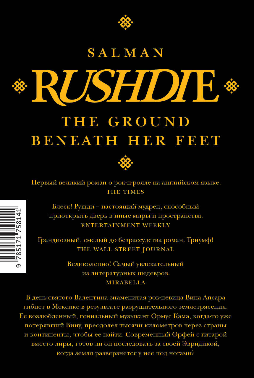 - Салман Рушди - один из самых известных и необычных современных писателей, критик, публицист, гуманист и защитник свободы слова. За заслуги в литературе королева Елизавета II в 2007 году посвятила Салмана Рушди в рыцари. - За свои произведения Рушди получил множество литературных наград, в том числе семь раз был номинирован на престижную Букеровскую премию. Он получил награду в 1981 году за свой самый знаменитый роман «Дети полуночи» и за эту же книгу дважды был отмечен «Букером Букеров» - к 25-летию премии и к ее 40-летию. - «Земля под ее ногами» - это смесь магического реализма, альтернативной истории, любовного романа и политической сатиры. Книга по праву считается одним из лучших романов Салмана Рушди, в котором в полной мере раскрылись все основные черты его творчества. - В книге «Земля под ее ногами» Салман Рушди предлагает необычную и захватывающую интерпретацию древнегреческого мифа об Орфее и Эвридике. Роман понравится поклонникам интеллектуальной прозы, основанной на переосмыслении классических сюжетов. - Главный герой книги «Земля под ее ногами» - гениальный музыкант. Газета The Times назвала произведение «первым великим романом о рок-н-ролле». - Всемирно известная группа U2 положила слова из романа на музыку. Песня The Ground Beneath Her Feet стала одной из самых популярных композиций коллектива.| Издательство | Издательство "АСТ" |
