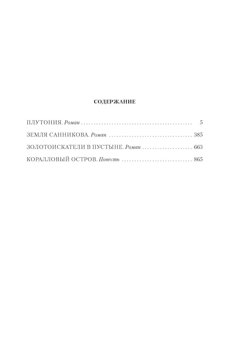 Владимир Обручев - советский ученый с мировым именем, географ, геолог, исследователь Сибири и Средней Азии. Однако широкому кругу он известен прежде всего как автор научно-фантастических и приключенческих романов, вошедших в сокровищницу советской литературы. Идея «Плутонии» (1924) родилась у Обручева после прочтения «Путешествия к центру Земли» Жюля Верна - романа увлекательного, но не выдерживающего критики с научной точки зрения. И Владимир Афанасьевич, хотя и не верил в гипотезу «полой Земли», решил написать книгу с похожим сюжетом, только избавленную от несуразиц. Второй роман, «Земля Санникова» (1926), был основан на другой научной гипотезе, которая представлялась ученому более реальной. В 1811 году зверобой Яков Санников обнаружил «обширную землю», настоящий оазис в Восточно-Сибирском море. Это дало основания думать, что та земля тепла и плодородна, возможно, благодаря вулканам. Исследовать эту землю отправляется отряд первопроходцев. Приключенческий роман «Золотоискатели в пустыне» (1949) переносит читателя в джунгарские горы, богатые золотоносным кварцем. Добыть драгоценный металл нелегко, а уберечь добычу еще труднее - ведь действие происходит в XIX веке на западной окраине китайской империи, переживающей нелегкие времена гражданских войн, восстаний и смуты. В настоящее издание вошла также повесть «Коралловый остров» (1947). Как и «Плутония», это тоже своего рода дань уважения таланту Жюля Верна. Только теперь на таинственный остров попадает экипаж американского военного гидросамолета, летевшего в атакованный японцами Перл-Харбор... В оформлении издания ипользованы иллюстрации Георгия Никольского и работы европейских и американских художников.| Издательство | Азбука |
