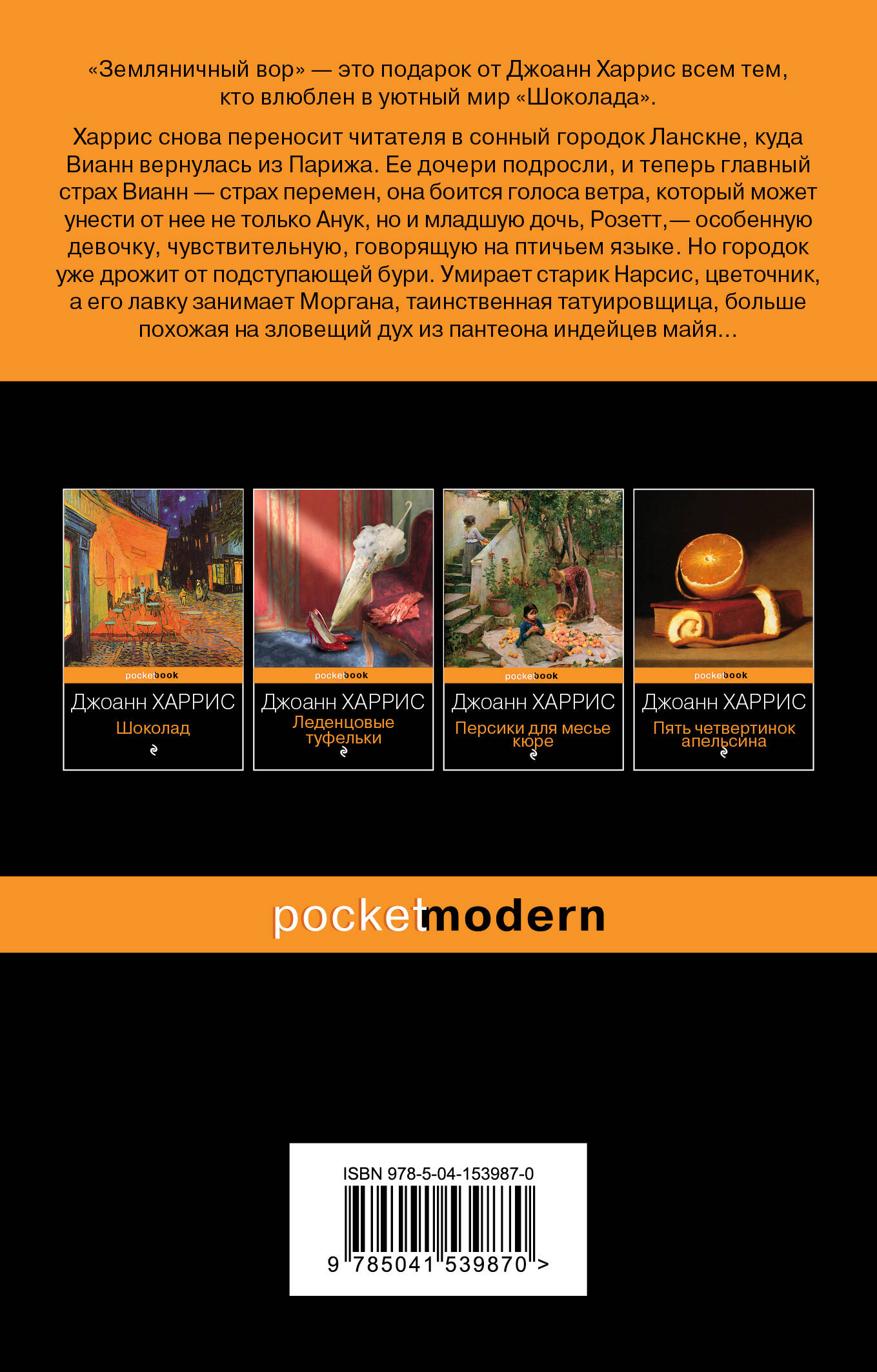 «Земляничный вор» - это подарок от Джоанн Харрис всем тем, кто влюблен в уютный мир «Шоколада». Харрис снова переносит читателя в сонный городок Ланскне, куда Вианн вернулась из Парижа. Ее дочери подросли, и теперь главный страх Вианн - страх перемен, она боится голоса ветра, который может унести от нее не только Анук, но и младшую дочь, Розетт, - особенную девочку, чувствительную, говорящую на птичьем языке. Но городок уже дрожит от подступающей бури. Умирает старик Нарсис, цветочник, а его лавку занимает Моргана, таинственная татуировщица, больше похожая на зловещий дух из пантеона индейцев майя... Не пропустите финальный роман о героях легендарного «Шоколада»!| Издательство | ООО "Издательство "Эксмо" |