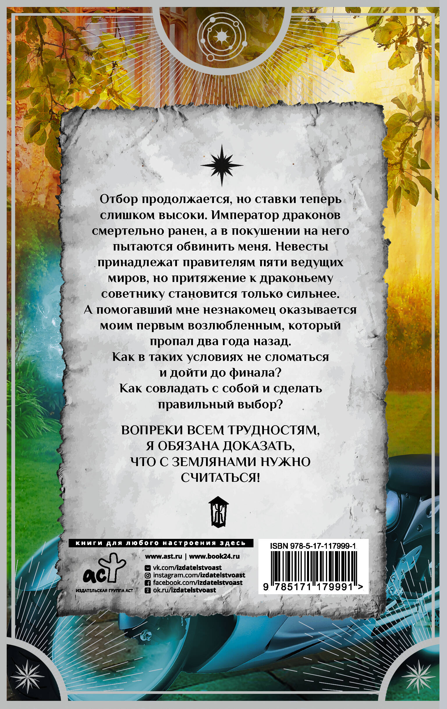 Отбор продолжается, но ставки теперь слишком высоки. Император драконов смертельно ранен, а в покушении на него пытаются обвинить меня. Невесты принадлежат правителям пяти ведущих миров, но притяжение к драконьему советнику становится только сильнее. А помогавший мне незнакомец оказывается моим первым возлюбленным, который пропал два года назад. Как в таких условиях не сломаться и дойти до финала? Как совладать с собой и сделать правильный выбор? Вопреки всем трудностям я обязана доказать, что с землянами нужно считаться!| Издательство | ИЗДАТЕЛЬСТВО "АСТ" |