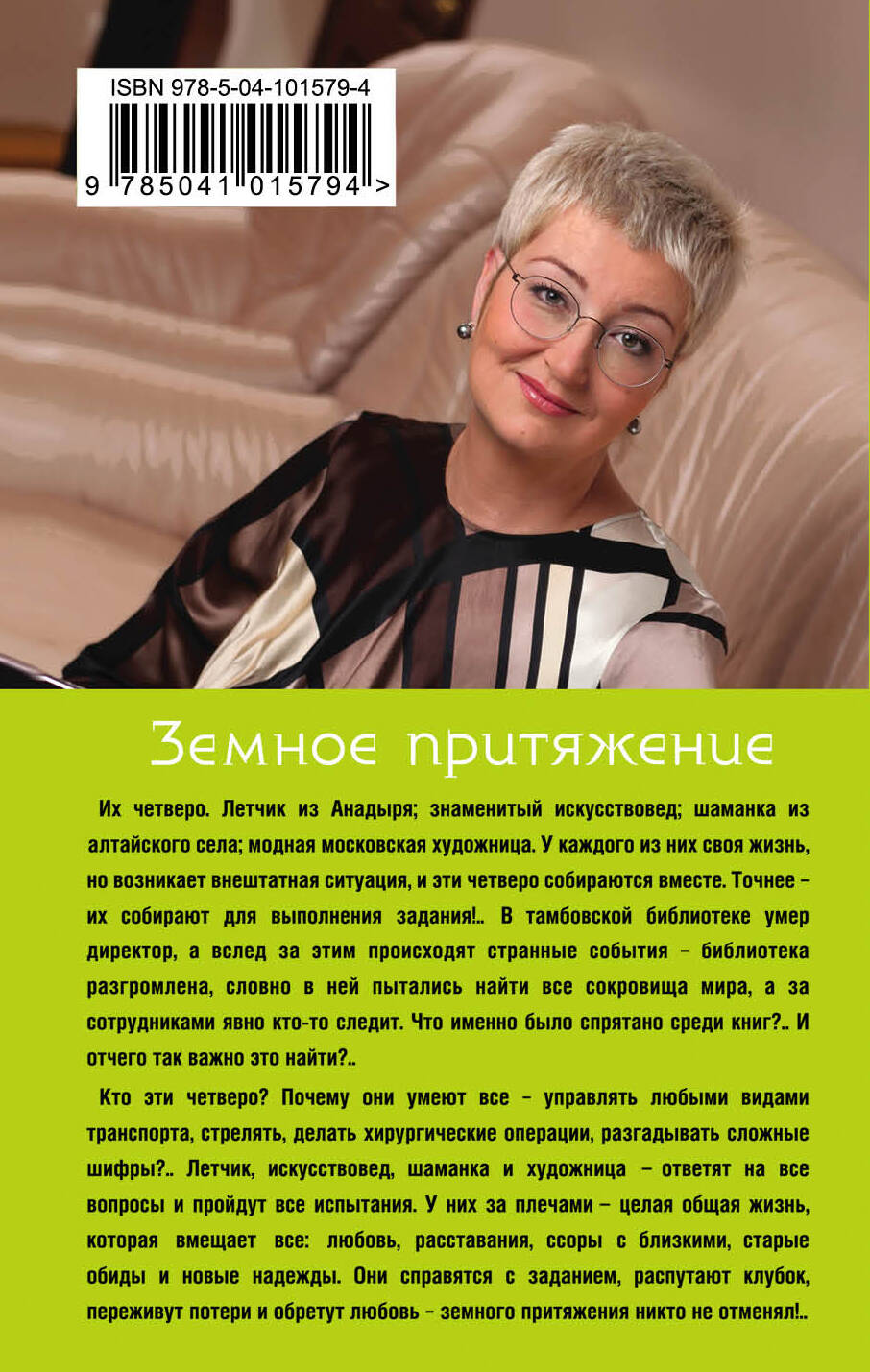 Их четверо. Летчик из Анадыря; знаменитый искусствовед; шаманка из Алтайского села; модная московская художница. У каждого из них своя жизнь, но возникает внештатная ситуация, и эти четверо собираются вместе. Точнее - их собирают для выполнения задания!.. В Тамбовской библиотеке умер директор, а вслед за этим происходят странные события - библиотека разгромлена, словно в ней пытались найти все сокровища мира, а за сотрудниками явно кто-то следит. Что именно было спрятано среди книг?.. И отчего так важно это найти?.. Кто эти четверо? Почему они умеют всё - управлять любыми видами транспорта, стрелять, делать хирургические операции, разгадывать сложные шифры?.. Летчик, искусствовед, шаманка и художница ответят на все вопросы и пройдут все испытания. У них за плечами - целая общая жизнь, которая вмещает всё: любовь, расставания, ссоры с близкими, старые обиды и новые надежды. Они справятся с заданием, распутают клубок, переживут потери и обретут любовь - земного притяжения никто не отменял!.. Татьяна Устинова - один из топовых авторов современной российской прозы, обладатель двух премий «Электронная буква», лауреат «ТЭФИ» в номинации «Сценарист телевизионного фильма». «Первая среди лучших» - так называют Татьяну Витальевну, и это не просто остроумный эпитет, а звание, подтвержденное десятками написанных романов, успешными экранизациями и, конечно, любовью многочисленных поклонников ее творчества.| Издательство | ООО "Издательство "Эксмо" |
