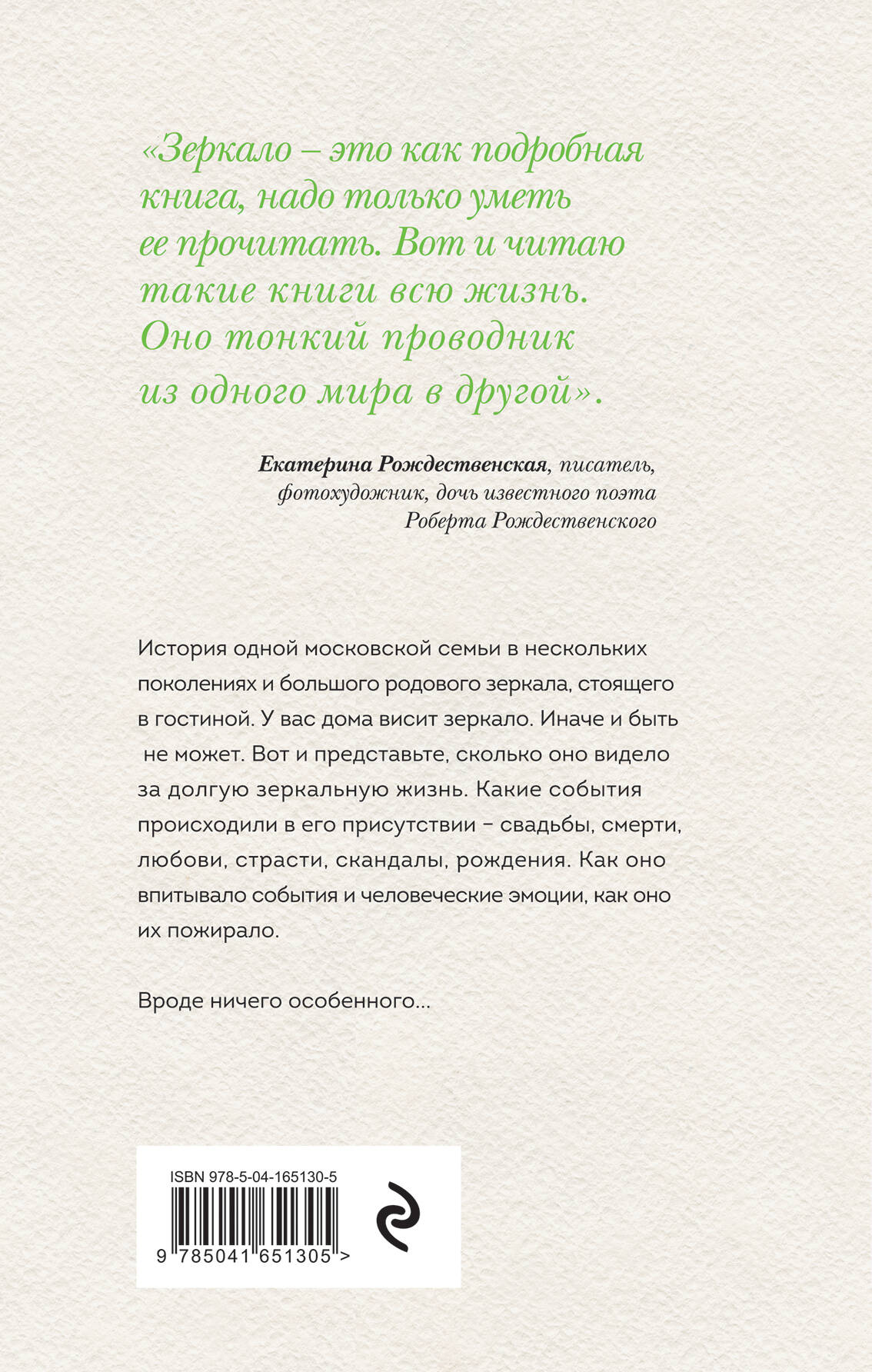 Роман Екатерины Рождественской цепляет тем, что история семьи в нескольких поколениях рассказана простым, уютным и спокойным языком. С явной симпатией к старой интеллигенции - семьям, в которых превыше всего ставилось хорошее воспитание, традиции и уважение друг к другу. Очень атмосферное чтение, охватывающее период с конца 19-го века по начало 21-го века. Свидетелем событий становится старинное зеркало, передающееся по наследству. Легкий мистический оттенок придает повествованию изящество и сюжетную искру. Екатерина Рождественская - дочь классика русской поэзии Роберта Рождественского, яркой звезды времен «шестидесятников», светившей наравне со звездой Евтушенко, Вознесенским и Окуджавой.| Издательство | Эксмо |
