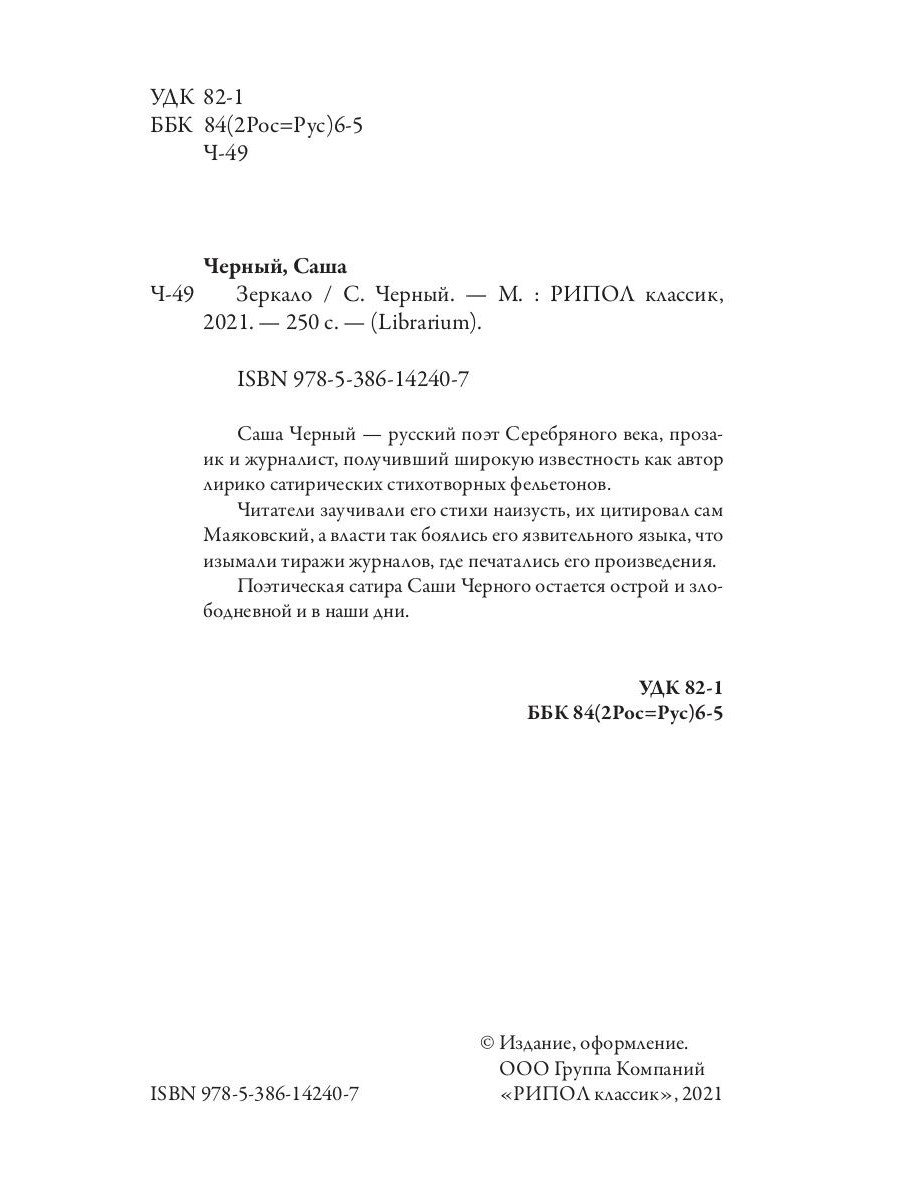 Саша Чёрный - русский поэт Серебряного века, прозаик и журналист, получивший широкую известность как автор лирико сатирических стихотворных фельетонов. Читатели заучивали его стихи наизусть, их цитировал сам Маяковский, а власти так боялись его язвительного языка, что изымали тиражи журналов, где печатались его произведения. Поэтическая сатира Саши Чёрного остается острой и злободневной и в наши дни.| Издательство | РИПОЛ классик Группа Компаний ООО |