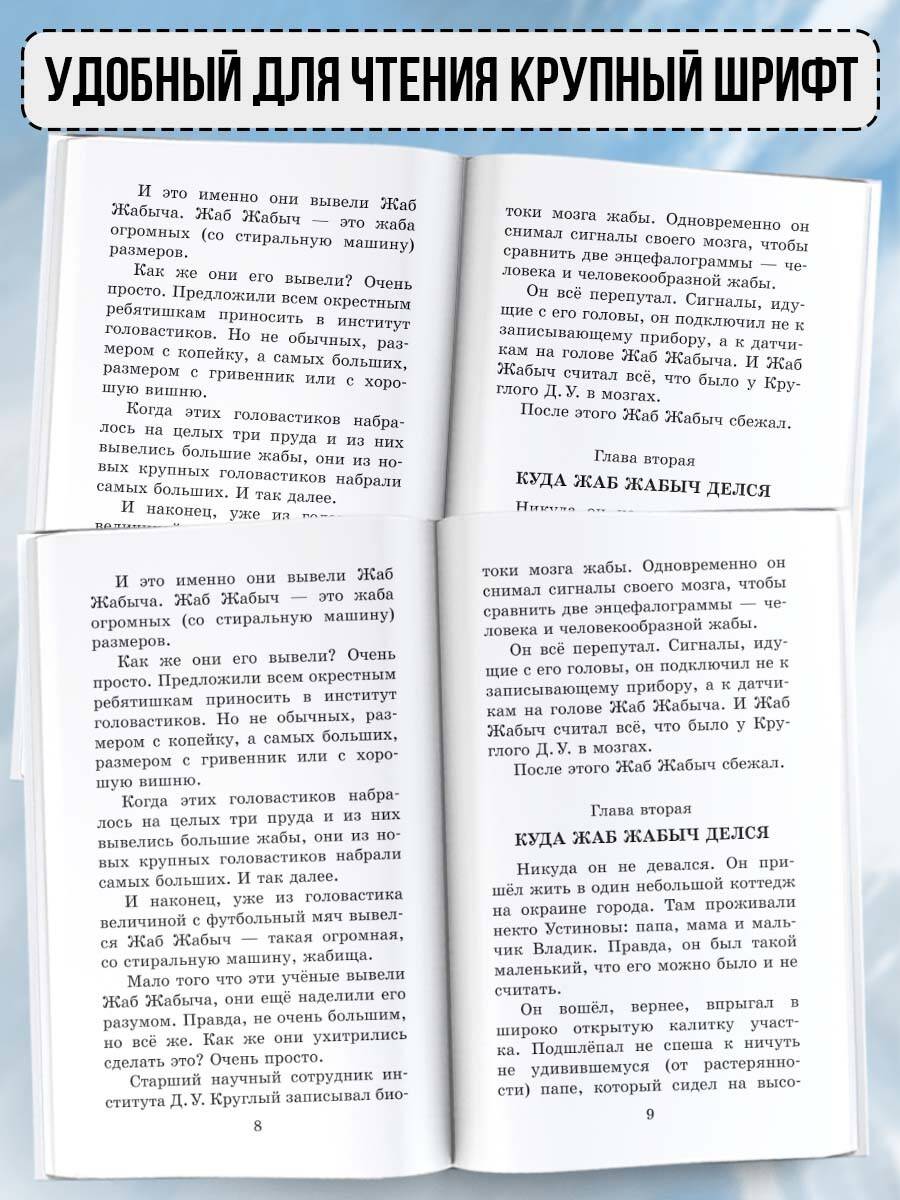Жаб Жабыч родился не в родном болоте, а в стенах научного института. Можно сказать, в пробирке. И вырос из малюсенького лягушонка в здоровенного лягуха размером со стиральную машинку. Но и в голове у него кое-что было, во всяком случае, чтобы сбежать из лаборатории и попроситься жить в хорошую семью. Даже мама полюбила это некрасивое по человеческим меркам существо за простодушие, доброту и умение ладить с детьми.| Издательство | ИЗДАТЕЛЬСТВО "АСТ" |