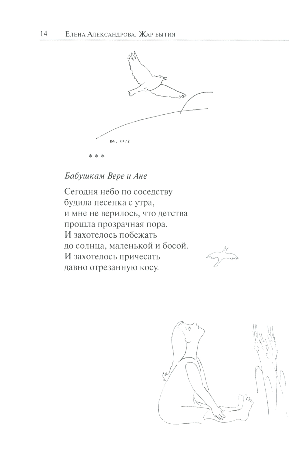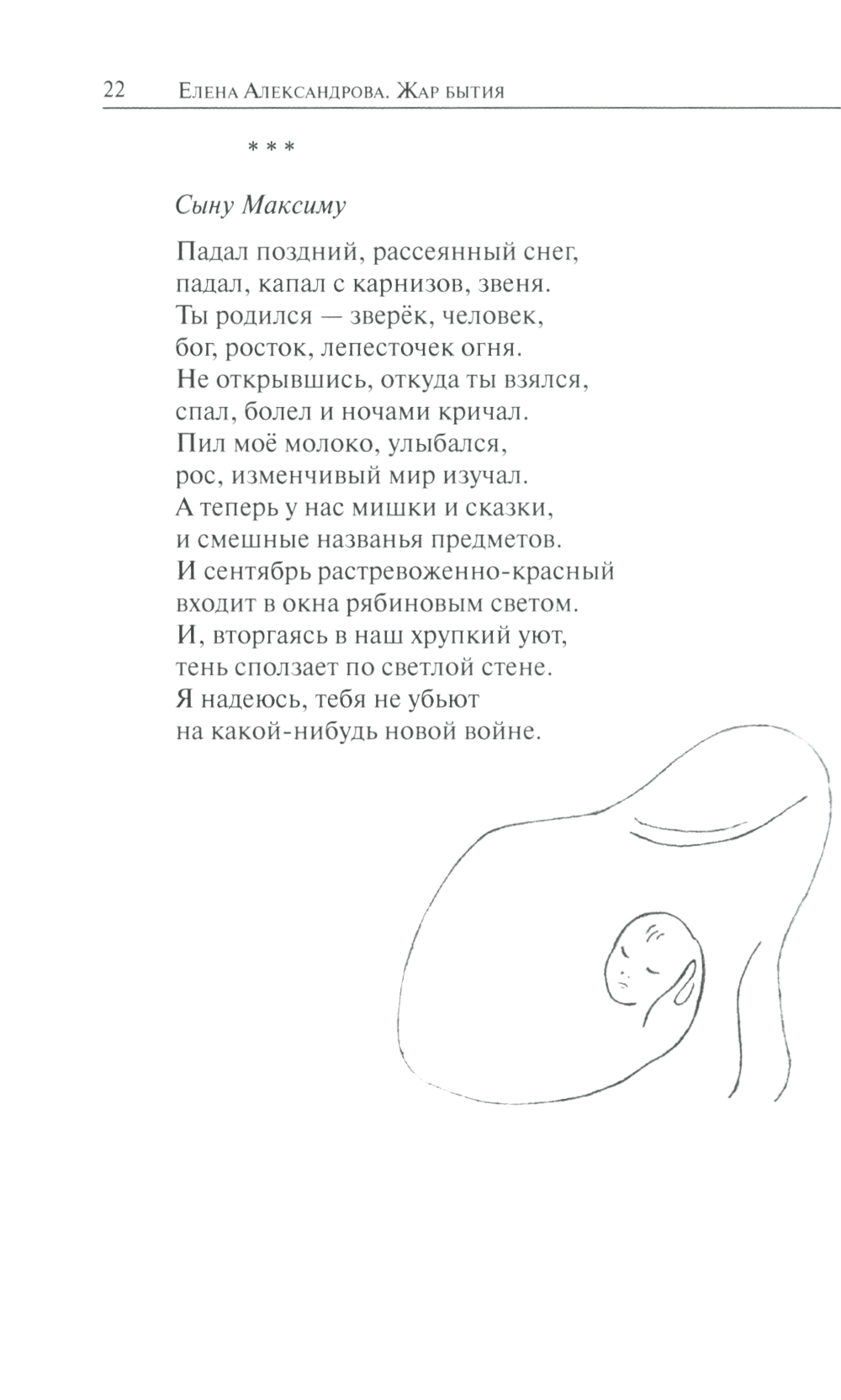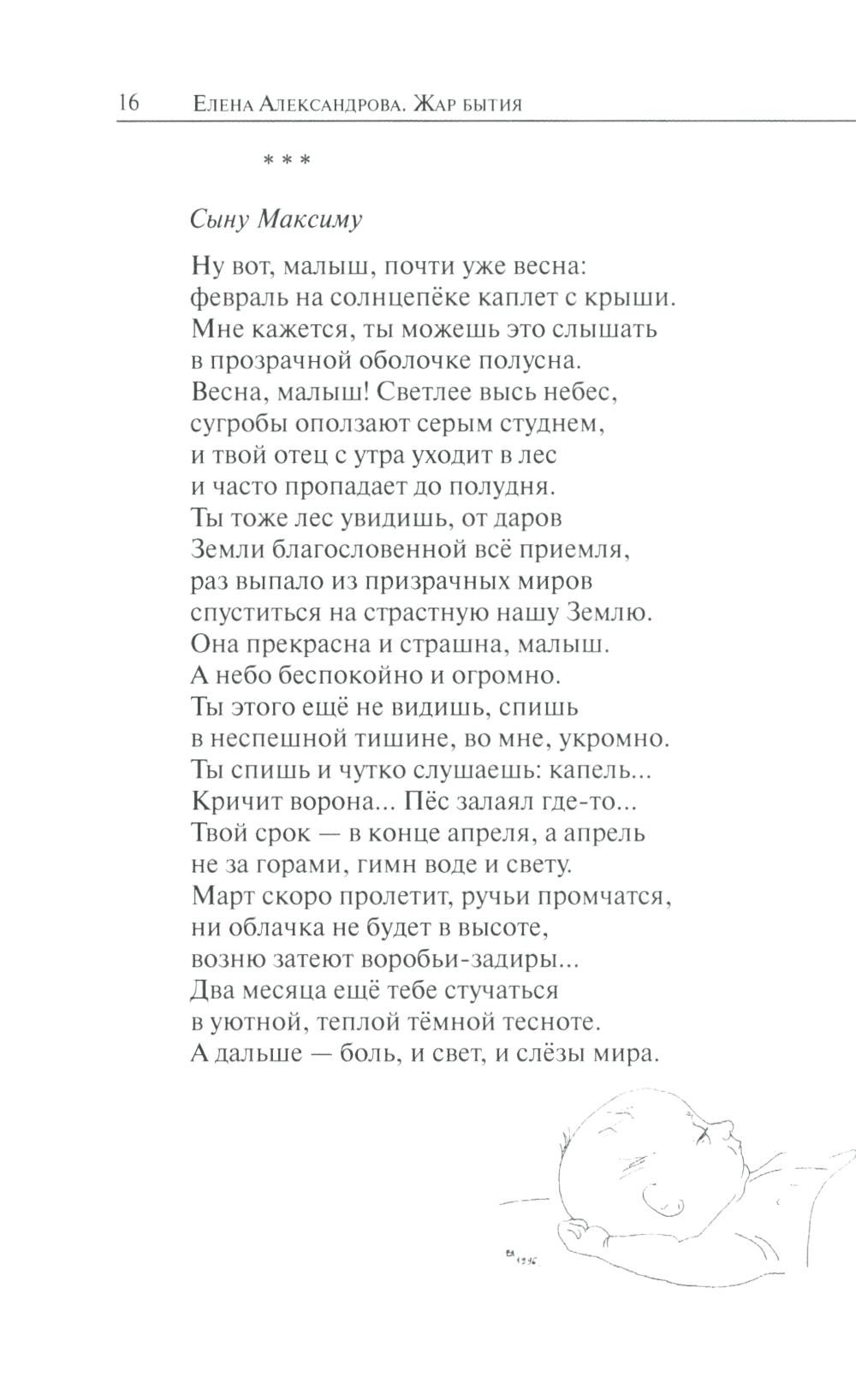 Книга избранных стихов поэта и художника Елены Александровой представляет собой «выжимку» из всего её творчества в течение трёх десятилетий. Поэт вообще, если верить Борису Пастернаку, всегда говорит только об одном - о Жизни и Смерти.Это верно и в отношении творчества Елены Александровой, но с поправкой на то, что она - женщина, и главный разговор, пишет ли она о жизни или смерти, ведёт всё же о Любви. О любви к мужчине, детям, родителям, земле, на которой родилась, ко всем бесчисленным «ликам творения». О любви счастливой и дной, блистательной и отчаянной. И значит, эти стихи имеют шанс найти отклик в душе любого читателя, которому знакомо это чувство.Поэзия Елены составляет неразрывный сплав с её графикой: пластичной и удивительно содержательной при предельном аскетизме средств.Этой книгой издательство «Академический проект» открывает серию книг современных российских поэтов.