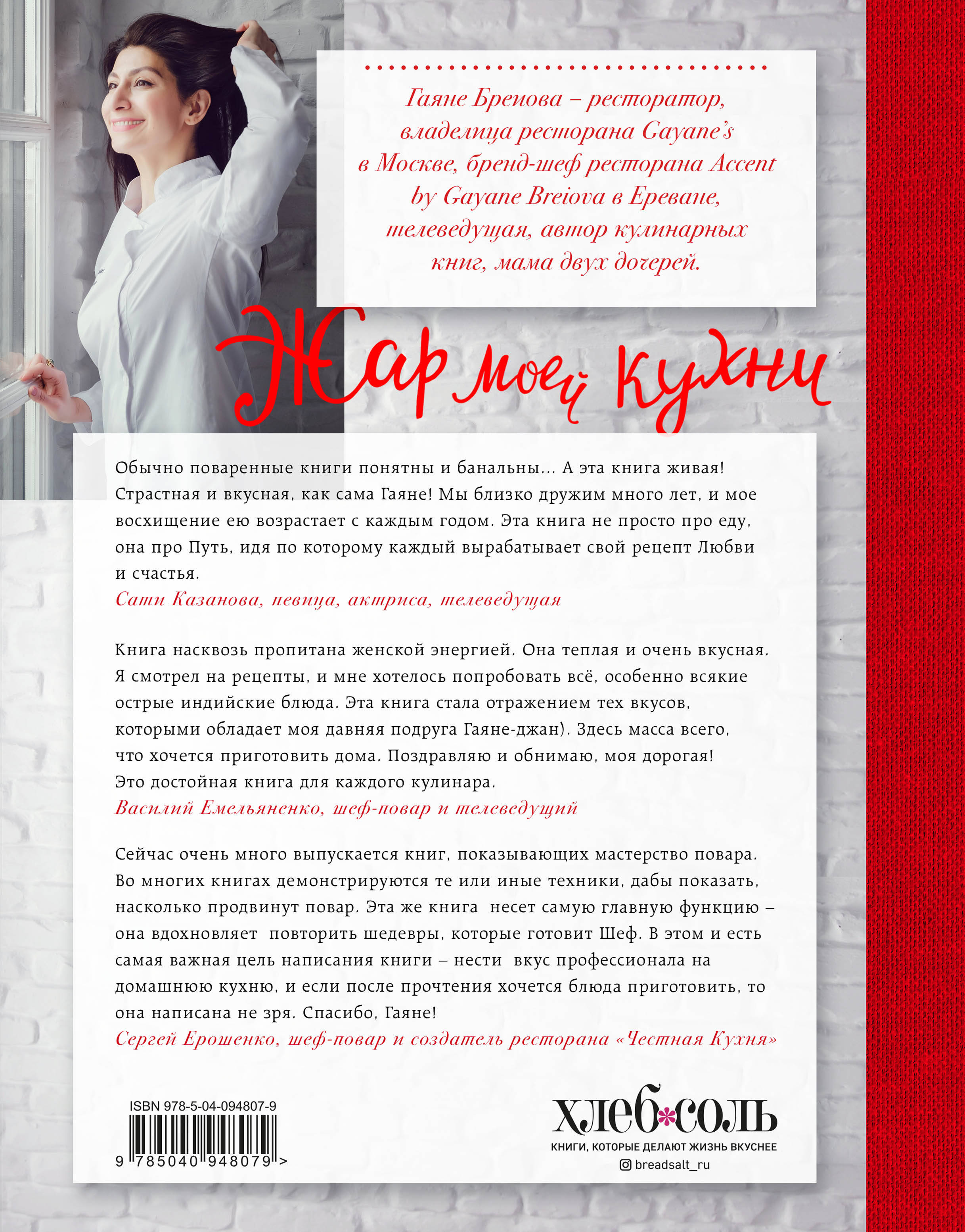 У Гаяне Бреиовой в Москве два рядом стоящих ресторанчика: «Понаехали» и «Gayane's». Она любит и хочет открывать новые рестораны, чтобы побольше людей узнавали, что же такое настоящая домашняя еда с национальным колоритом. Гаяне - армянка и обожает свой Ереван, но она давно живет в Москве и по-настоящему любит ее. И блюда ее кухни - не только армянские, с мясом, сытные и ароматные, но и вегетарианские, легкие и полезные. Она поразительно умеет сочетать эти противоположные направления в кулинарии. Вот и в ее новой книге представлены очень разноплановые рецепты, чтобы каждый мог выбрать себе по самочувствию и настроению. В книге много эмоциональных дополнений как в тексте, так и в чудесных фото.| Издательство | ООО "Издательство "Эксмо" |