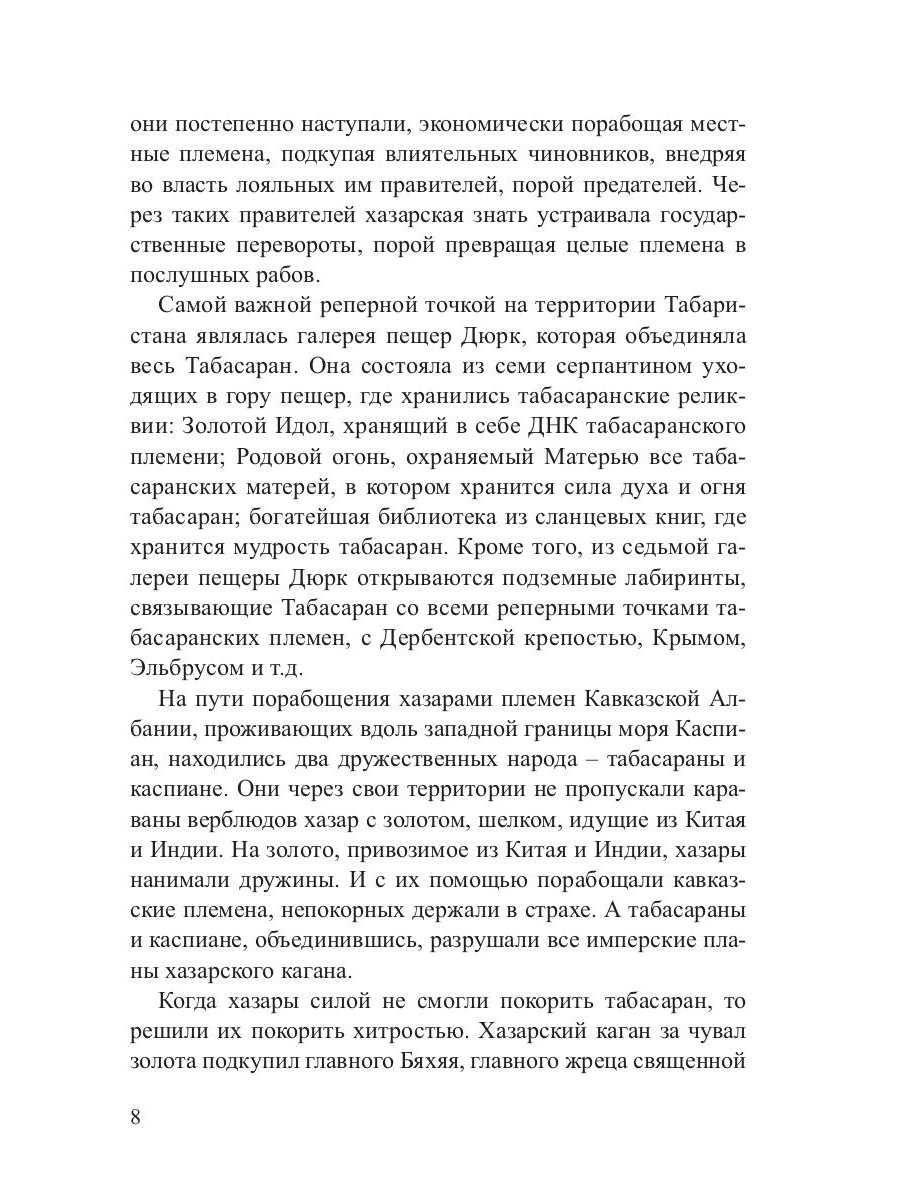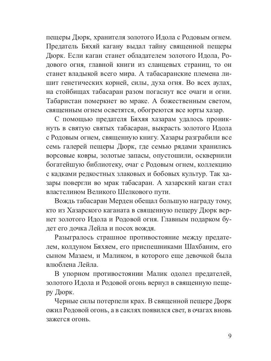 Хазарскому кагану контроль над ним позволял осуществить монополию над торговлей на Кавказе. Хазары подкупом чиновников в значимых местах территории кавказских племен устанавливали опорные пункты. Самой важной точкой Табаристана является священная пещера Дюрк. Она состоит из семи пещер, серпантином уходящих в гору. Там хранились Золотой Идол, несущий в себе ДНК табасаранского племени, Родовой огонь, дающий свет, богатейшая библиотека из сланцевых книг, где хранится мудрость табасаран. Хазарский каган подкупил главного жреца священной пещеры Дюрк Бяхяя, хранителя золотого Идола с Родовым огнем. Хазары проникли в пещеру Дюрк, выкрали золотого Идола с Родовым огнем, опустошили библиотеку, коллекцию с кадками редкостных злаковых и бобовых культур. Разыгралось противостояние между колдуном Бяхяем и хазарами с одной стороны, вождем племени табасаран Мерденом и борцом сил Света Маликом - с другой. Малик вернул золотого Идола. В священной пещере Дюрк ожил Родовой огонь. А в саклях табасаран появился свет.