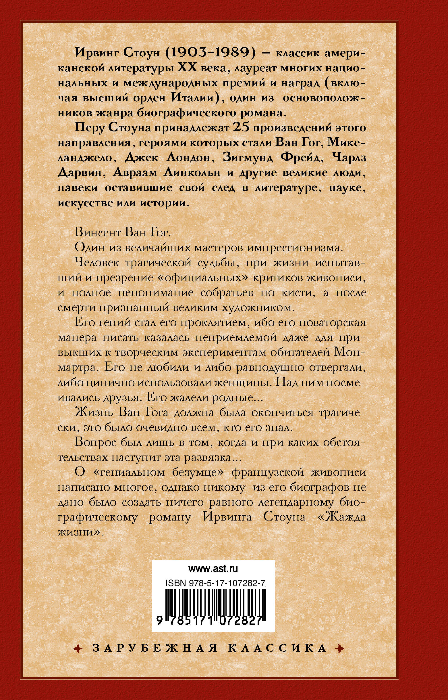 Винсент Ван Гог. Один из величайших мастеров импрессионизма. Человек трагической судьбы, при жизни испытавший и презрение "официальных" критиков живописи, и полное непонимание собратьев по кисти, а после смерти признанный великим художником. Его гений стал проклятием, ибо его новаторская манера писать казалась неприемлемой даже для привыкших к творческим эксперимен-там обитателей Монмартра. Его не любили и либо равнодушно отвергали, либо цинично использовали женщины. Над ним посмеивались друзья. Его жалели родные… Жизнь Ван Гога должна была окончиться трагически, это было очевидно всем, кто его знал. Вопрос лишь в том, когда и при каких обстоятельствах наступит эта развязка… О "гениальном безумце" французской живописи написано многое, однако никому из его биографов не дано было создать ничего равного легендарному биографическому роману Ирвинга Стоуна "Жажда жизни".