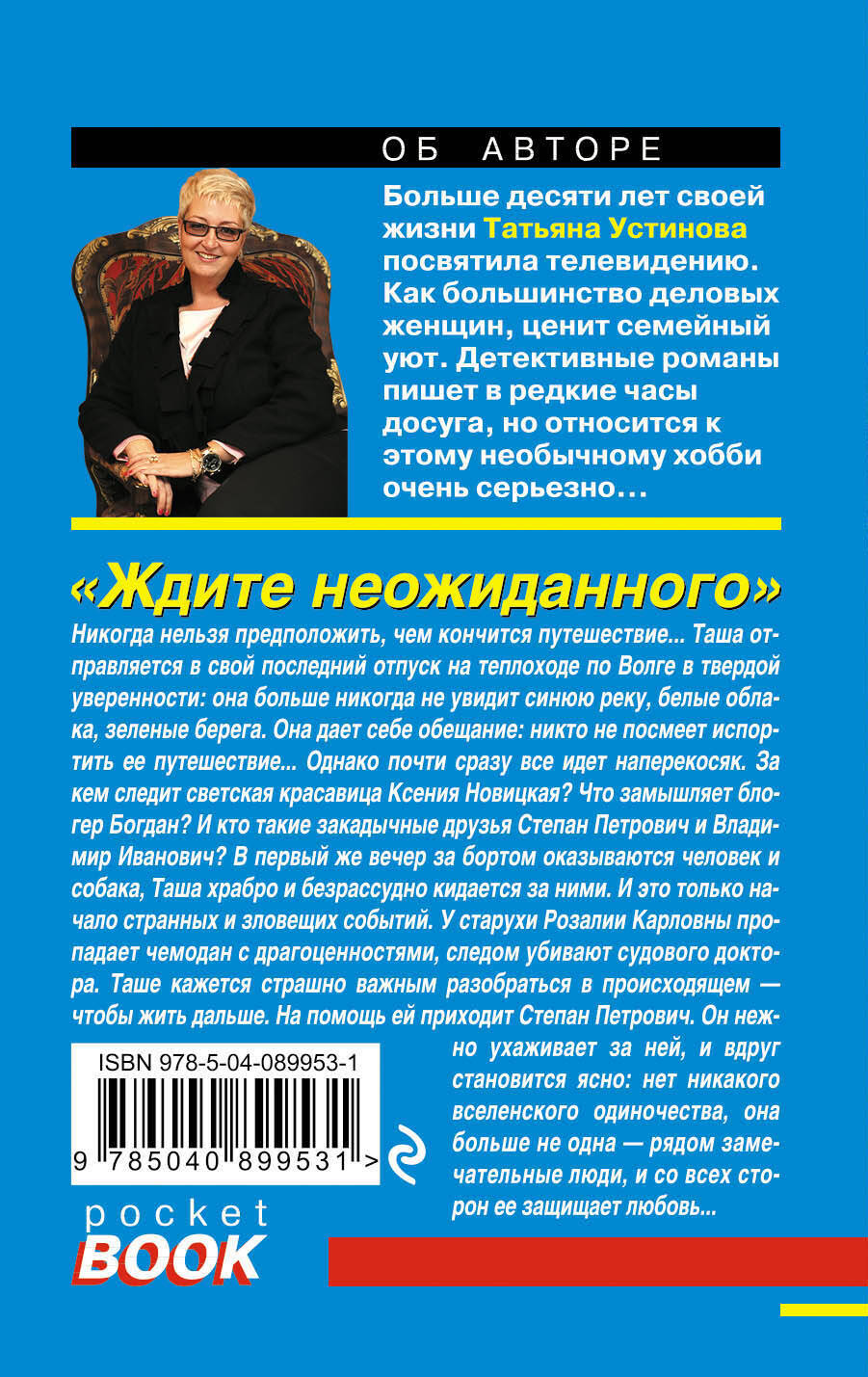 Никогда нельзя предположить, чем кончится путешествие... Таша отправляется в свой последний отпуск на теплоходе по Волге в твердой уверенности: она больше никогда не увидит синюю реку, белые облака, зеленые берега. Она дает себе обещание: никто не посмеет испортить ее путешествие… Однако почти сразу все идет наперекосяк. За кем следит светская красавица Ксения Новицкая? Что замышляет блогер Богдан? И кто такие закадычные друзья Степан Петрович и Владимир Иванович? В первый же вечер за бортом оказываются человек и собака, Таша храбро и безрассудно кидается за ними. И это только начало странных и зловещих событий. У старухи Розалии Карловны пропадает чемодан с драгоценностями, следом убивают судового доктора. Таше кажется страшно важным разобраться в происходящем - чтобы жить дальше. На помощь ей приходит Степан Петрович. Он нежно ухаживает за ней, и вдруг становится ясно: нет никакого вселенского одиночества, она больше не одна - рядом замечательные люди, и со всех сторон ее защищает любовь… Татьяна Устинова - один из топовых авторов современной российской прозы, обладатель двух премий «Электронная буква», лауреат «ТЭФИ» в номинации «Сценарист телевизионного фильма». «Первая среди лучших» - так называют Татьяну Витальевну, и это не просто остроумный эпитет, а звание, подтвержденное десятками написанных романов, успешными экранизациями и, конечно, любовью многочисленных поклонников ее творчества.| Издательство | ООО "Издательство "Эксмо" |