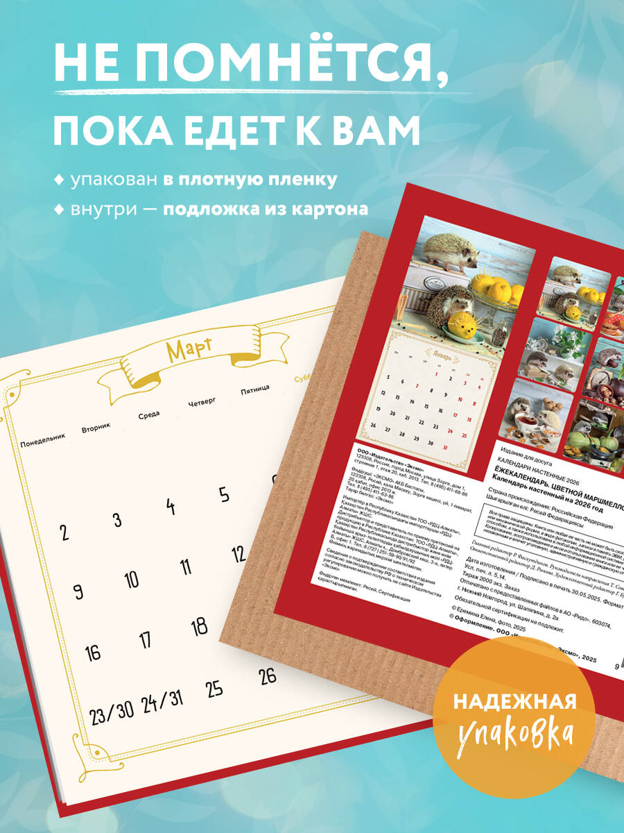 О серии: Наши настенные календари отличаются высоким качеством исполнения! Тщательно подобранные иллюстрации, напечатанные на глянцевой бумаге высочайшего качества, станут настоящим украшением дома, а в календарной сетке найдется место для ваших планов: большие клетки позволят делать записи и организовать свой год! В календаре также отмечены все государственные праздники. В серии настенных календарей издательства «ЭКСМО» каждый найдет тему по вкусу: великие художники, великолепные подборки с самыми знаменитыми произведениями искусства, легендарные кинематографические саги и игры, главные книжные авторы и бестселлеры, фотографии и иллюстрации любимых животных и многое-многое другое! О календаре: Планируйте дела ЁЖЕдневно, не забывая о праздничных и выходных днях, которые отмечены в календаре! Каждый месяц - новая фотография славного ежиного семейства, удобная календарная сетка и хорошее настроение! Для кого: Большой настенный календарь с уникальными сюжетами из забавной жизни ежей украсит любой интерьер и станет прекрасным подарком для всех поклонников колючих, но таких милых существ! Технические параметры: - Тип календаря - настенный перекидной. - Год - 2026. - Календарная сетка - с разбивкой по месяцам. - Вид скрепления - скрепка. - Внутренний блок - мелованная бумага 115 г/м2. - Подложка - плотный гофрокартон для поддержания формы. - Индивидуальная упаковка в плотный целлофановый пакет.| Издательство | ООО "Издательство "Эксмо" |