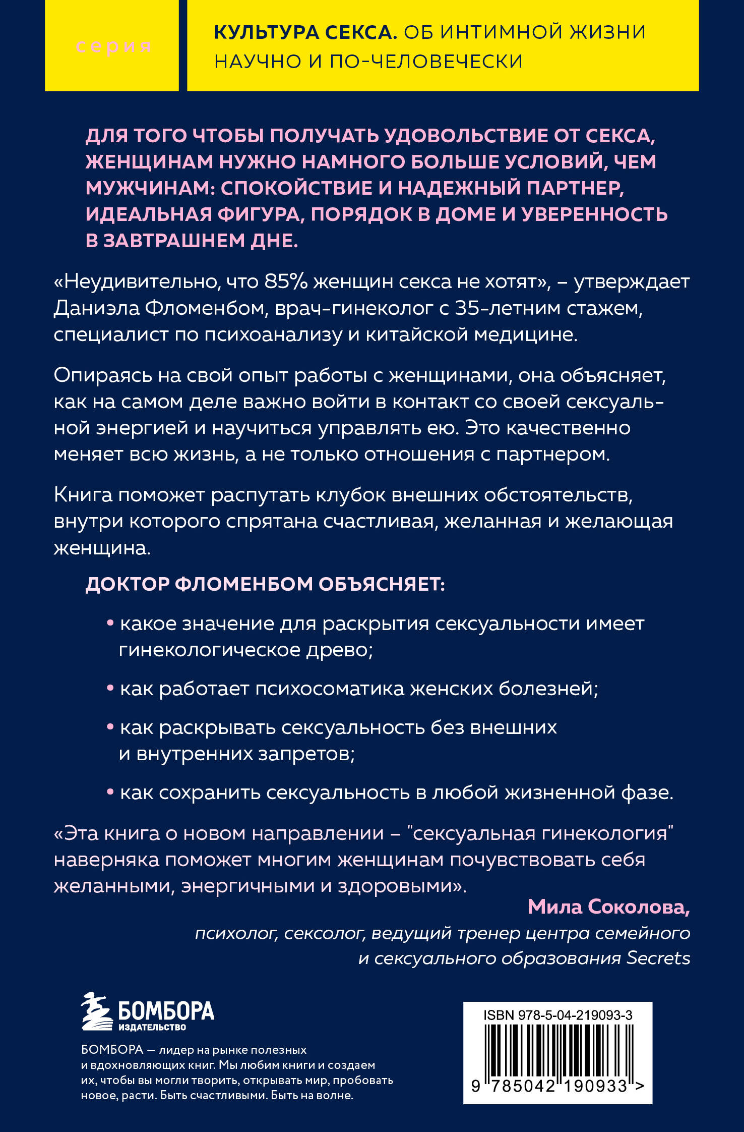 Для того, чтобы получать удовольствие от секса, женщинам нужно намного больше условий, чем мужчинам: спокойствие и надежный партнер, идеальная фигура, порядок в доме и уверенность в завтрашнем дне. Не удивительно, что 85% женщин секса не хотят, - утверждает Даниэла Фломенбом, врач-гинеколог с 35-летним стажем, специалист по психоанализу и китайской медицине. Опираясь на свой опыт работы с женщинами, она объясняет, как на самом деле важно войти в контакт со своей сексуальной энергией и научиться управлять ею. Это качественно меняет всю жизнь, а не только отношения с партнером. Книга поможет распутать клубок внешних обстоятельств, внутри которого спрятана счастливая, желанная и желающая женщина. Доктор Фломенбом объясняет: • какое значение для раскрытия сексуальности имеет гинекологическое древо; • как работает психосоматика женских болезней; • как раскрывать сексуальность без внешних и внутренних запретов; • как сохранить сексуальность в любой жизненной фазе.| Издательство | ООО "Издательство "Эксмо" |