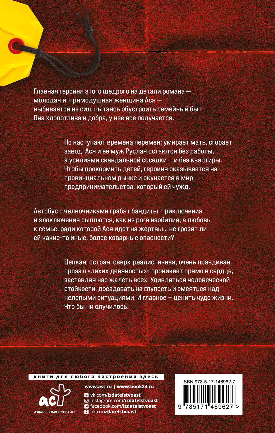 Главная героиня этого щедрого на детали романа - молодая и прямодушная женщина Ася - выбивается из сил, пытаясь обустроить семейный быт. Она хлопотлива и добра, у нее все получается. Но наступают времена перемен: умирает мать, сгорает завод, Ася и её муж Руслан остаются без работы, а усилиями скандальной соседки - и без квартиры. Чтобы прокормить детей, героиня оказывается на провинциальном рынке и окунается в мир предпринимательства, который ей чужд. Автобус с челночниками грабят бандиты, приключения и злоключения сыплются, как из рога изобилия, а любовь к семье, ради которой Ася идет на жертвы… не грозят ли ей какие-то иные, более коварные опасности? Цепкая, острая, сверх-реалистичная, очень правдивая проза о «лихих девяностых» проникает прямо в сердце, заставляя нас жалеть всех. Удивляться человеческой стойкости, досадовать на глупость и смеяться над нелепыми ситуациями. И главное - ценить чудо жизни. Что бы ни случилось.| Издательство | АСТ |