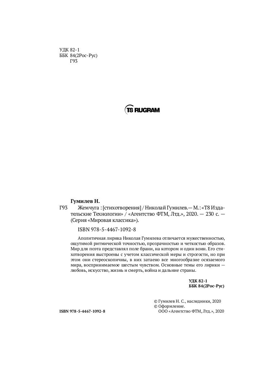 Аполитичная лирика Николая Гумилева отличается мужественностью, ощутимой ритмической точностью, прозрачностью и четкостью образов. Мир для поэта представлял поле брани, на котором и один воин. Его стихотворения выстроены с учетом классической меры и строгости, но при этом они стереоскопичны, в них затаено все многообразие осязаемого мира, воспринимаемое шестым чувством. Основные темы его лирики - любовь, искусство, жизнь и смерть, война и дальние страны.| Издательство | Т8 RUGRAM |