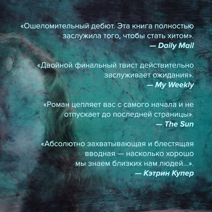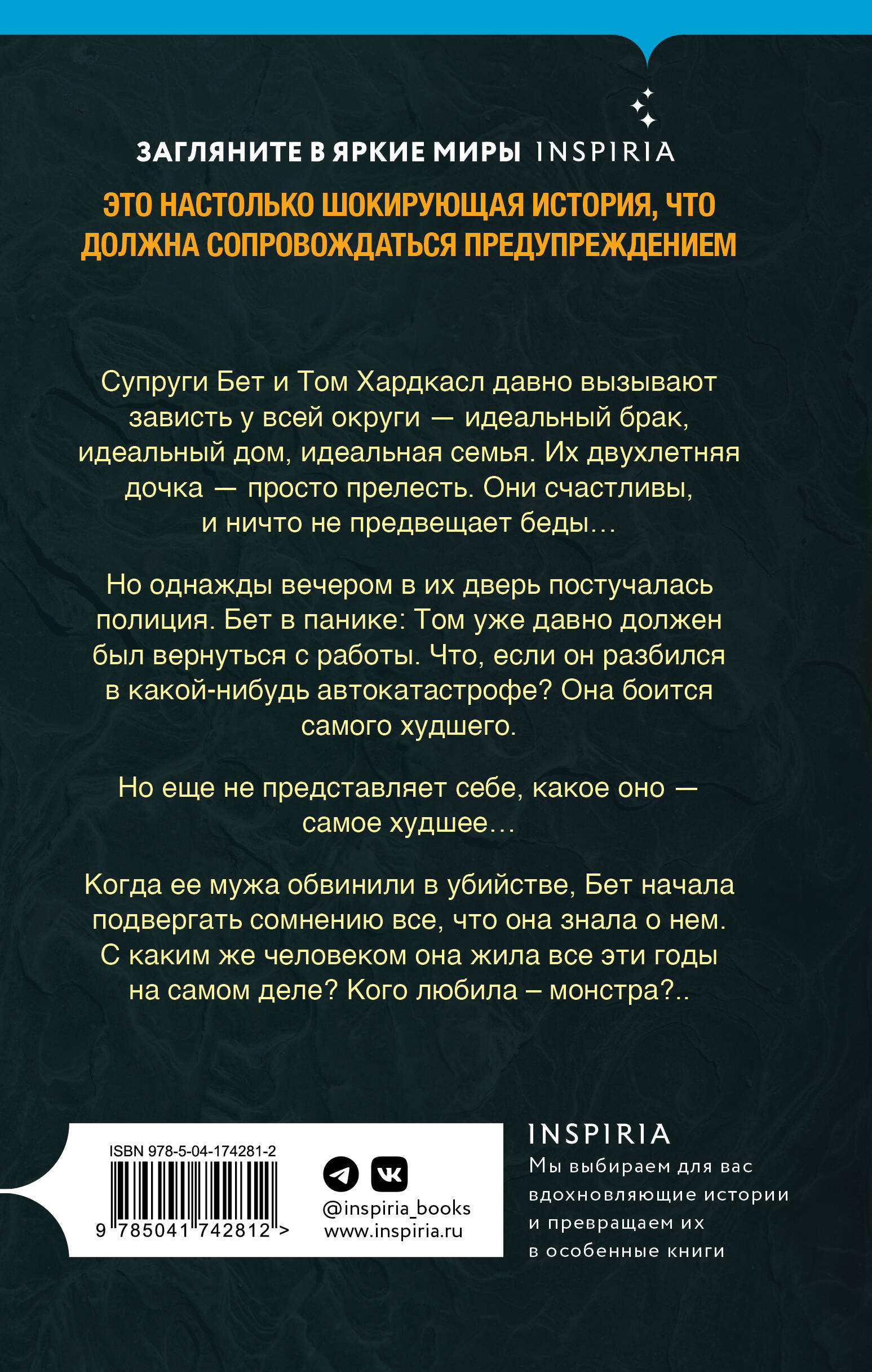 НАЦИОНАЛЬНЫЙ БЕСТСЕЛЛЕР БРИТАНИИ. ЭТО НАСТОЛЬКО ШОКИРУЮЩАЯ ИСТОРИЯ, ЧТО ДОЛЖНА СОПРОВОЖДАТЬСЯ ПРЕДУПРЕЖДЕНИЕМ. Все говорят, что он - монстр. И что она - знала об этом… Супруги Бет и Том Хардкасл давно вызывают зависть у всей округи - идеальный брак, идеальный дом, идеальная семья. Их двухлетняя дочка - просто прелесть. Они счастливы, и ничто не предвещает беды… Но однажды вечером в их дверь постучалась полиция. Бет в панике: Том уже давно должен был вернуться с работы - что, если он разбился в какой-нибудь автокатастрофе? Она боится самого худшего. Но еще не представляет себе, какое оно - самое худшее… Когда ее мужа обвинили в убийстве, Бет начала подвергать сомнению все, что она знала о нем. С каким же человеком она жила все эти годы на самом деле? Кого любила - монстра?.. -------------------------------------------------------------------------------------------------------- «Ошеломительный дебют. Эта книга полностью заслужила того, чтобы стать хитом». - Daily Mail «Двойной финальный твист действительно заслуживает ожидания». - My Weekly «Роман цепляет вас с самого начала и не отпускает до последней страницы». - The Sun «Абсолютно захватывающая и блестящая вводная - насколько хорошо мы знаем близких нам людей…». - Кэтрин Купер| Издательство | ООО "Издательство "Эксмо" |