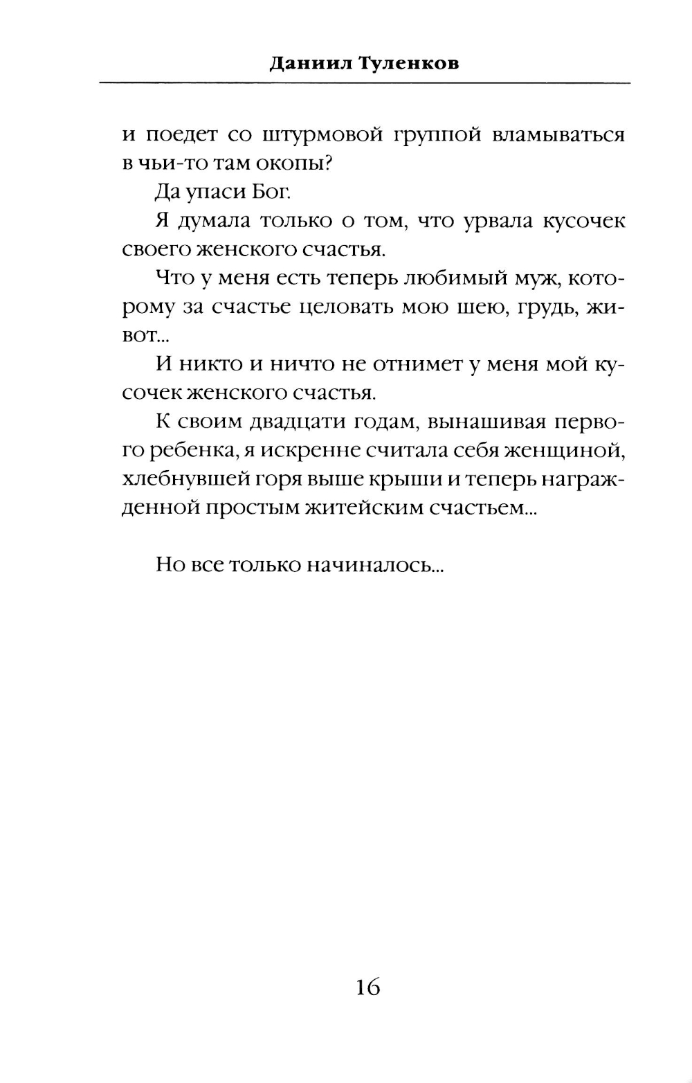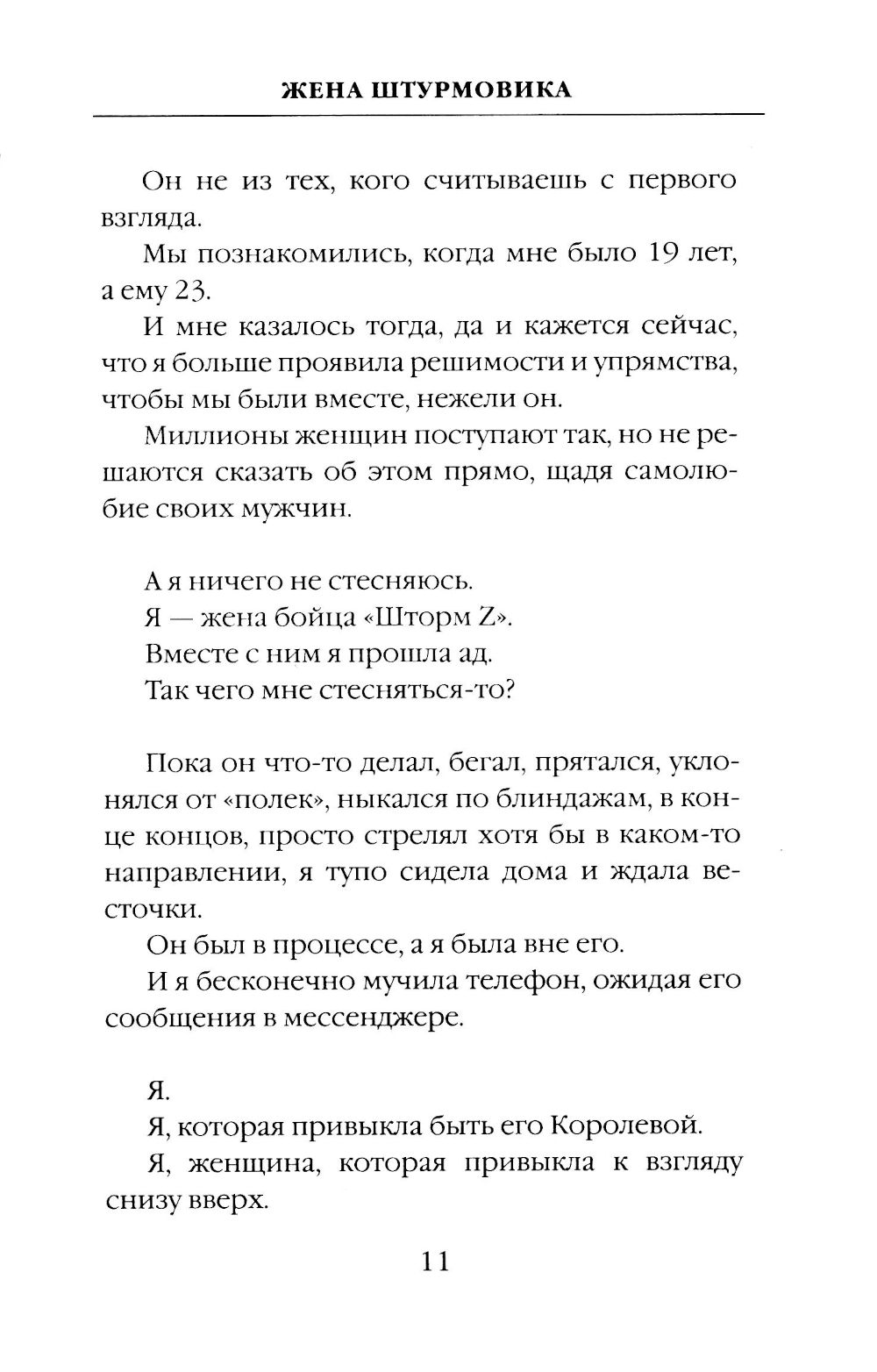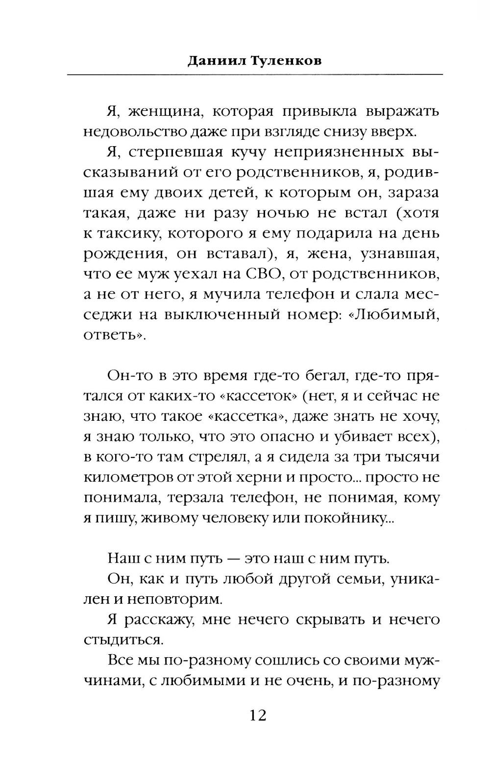 Даниил Юрьевич Туленков, - участник СВО (Запорожское направление), ветеран боевых действий, писатель, предприниматель, волонтёр с Урала. Автор книг «Последний осенний цветок» и «Шторм Z. У вас нет других нас». Выпускник исторического факультета УрГУ. «Жена штурмовика» - короткая исповедь женщины, чей муж, волею судеб, прошел через горнило тюрьмы и войны, прежде чем воссоединиться с семьей. На фоне ее бесхитростного рассказа мозаикой рассыпаны людские судьбы и сюжеты, фрагменты писем и сообщений с фронта, тюремные дневники. «Жена штурмовика» - возможно, первая попытка обратиться к оборотной стороне СВО, обрисовать тяжелый путь женщин, незримо связанных с бойцами на фронте, ждущих их и верящих в их возвращение.| Издательство | Яуза-каталог |