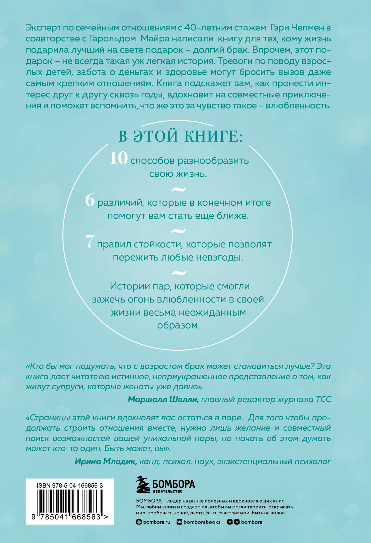 Эксперт по семейным отношениям с 40-летним стажем Гэри Чепмен в соавторстве с Гарольдом Майра написали книгу для тех, кому жизнь подарила лучший на свете подарок - долгий брак. Впрочем, этот подарок - не всегда такая уж легкая история. Тревоги по поводу взрослых детей, забота о деньгах и здоровье, отсутствие общих тем для разговора могут бросить вызов даже самым крепким отношениям. Книга подскажет вам, как пронести интерес друг к другу сквозь года, вдохновит на совместные приключения и поможет вспомнить, что же это за чувство такое - влюбленность. В этой книге: - 10 способов разнообразить свою жизнь. - 6 различий, которые в конечном итоге помогут вам стать еще ближе. - 7 правил стойкости, которые позволят пережить любые невзгоды. - Истории пар, которые смогли зажечь огонь влюбленности в своей жизни весьма неожиданным образом. «Кто бы мог подумать, что с возрастом брак может становиться лучше? Гэри Чепмен и Гарольд Майра дают читателю истинное, неприукрашенное представление о том, как живут супруги, которые женаты уже давно». - Маршалл Шелли, главный редактор журнала «TCC» «Эта книга вдохновит вас остаться в паре, даже если вы разочаровались в браке, потому что кроме вдохновляющих историй вполне довольных своей непростой жизнью пар вы найдете в ней множество идей, как преодолеть семейные трудности. Ведь разрушить легко, а для того, чтобы продолжать строить вместе, нужно лишь желание и совместный поиск возможностей вашей уникальной пары, но начать об этом думать может кто-то один. Быть может, вы». - Ирина Млодик, канд.псих.наук, экзистенциальный психолог| Издательство | Эксмо |