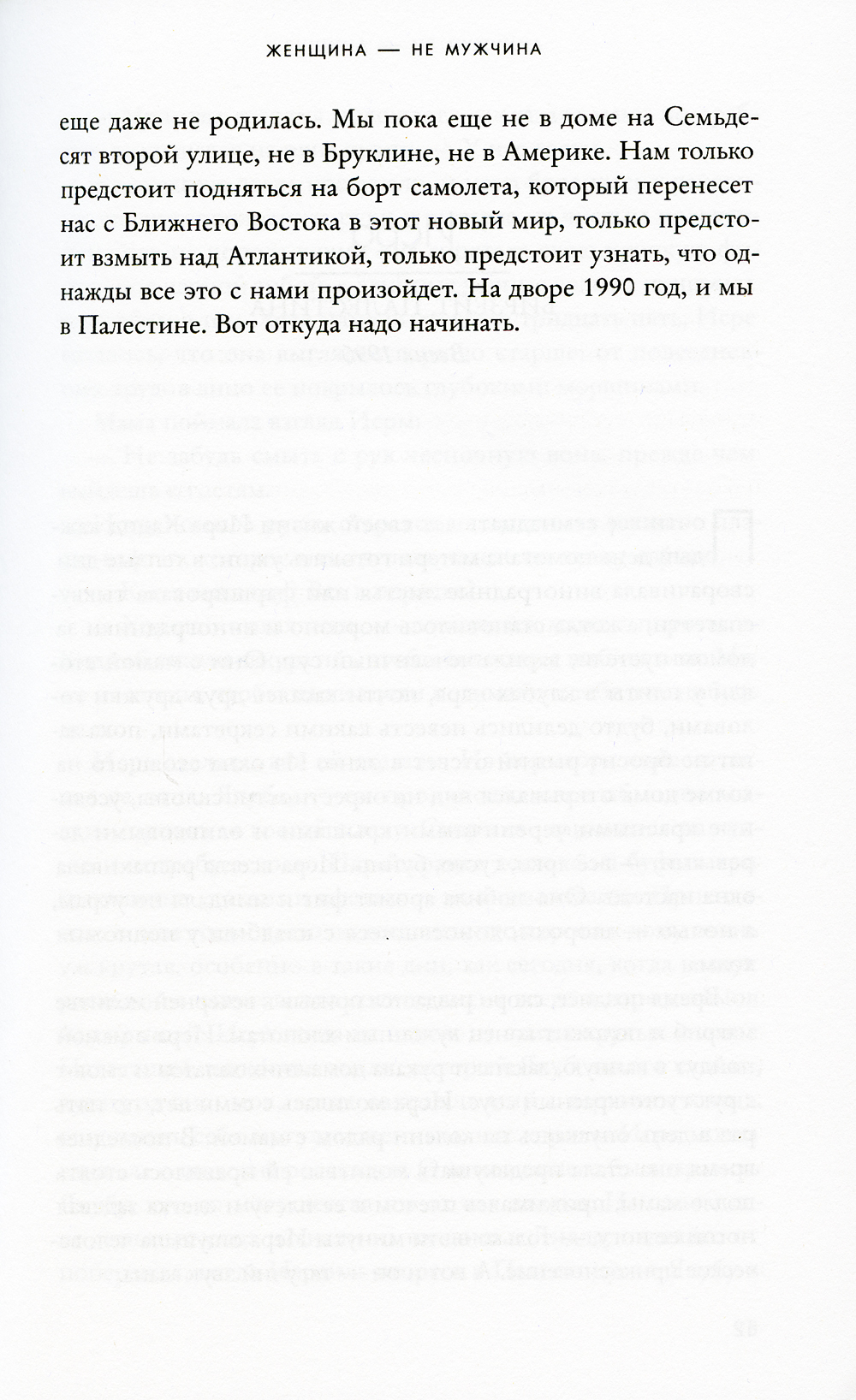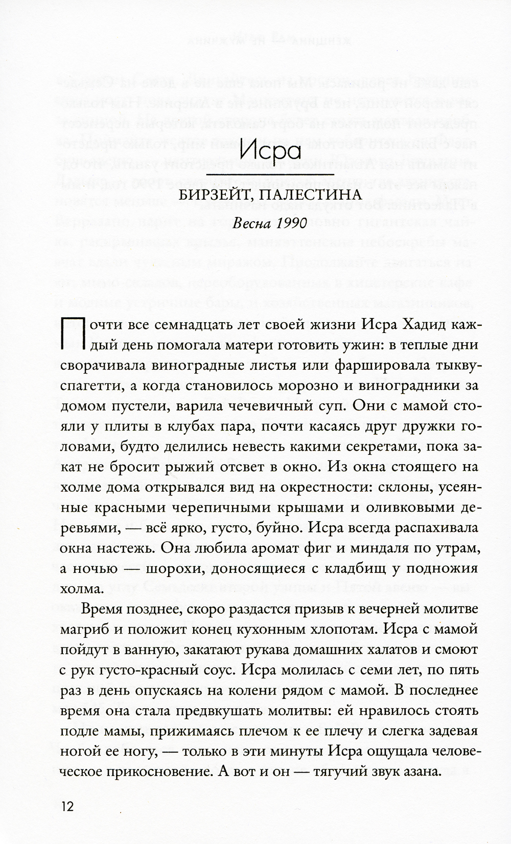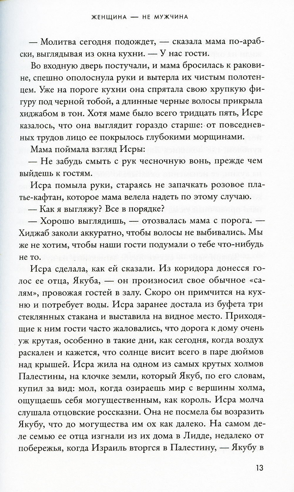 Дейа Раад родилась и живет в Бруклине, Нью-Йорк. Как только ей исполнилось восемнадцать, родные начали подыскивать ей мужа, хотя сама она мечтает не о замужестве, а об университете. Но бабушка с дедушкой уже все решили за внучку - она повторит судьбу своей матери, которую тоже не спрашивали, а в возрасте семнадцати лет выдали замуж и отправили из Палестины в Америку. Родители погибли в автомобильной аварии, когда Дейа с сестрами были совсем маленькими, - так она считала до тех пор, пока не получила однажды письмо от неизвестной женщины, не пожелавшей назвать свое имя, но хорошо знающей семью Дейи. Это послание поставило под сомнение все, что Дейа знает о своих близких и собственном прошлом... «Женщина - не мужчина» - роман о трех поколениях палестинских американок, разрывающихся между строгими нравами традиционного семейного уклада и желанием самостоятельно определять свою судьбу.| Издательство | Синдбад |