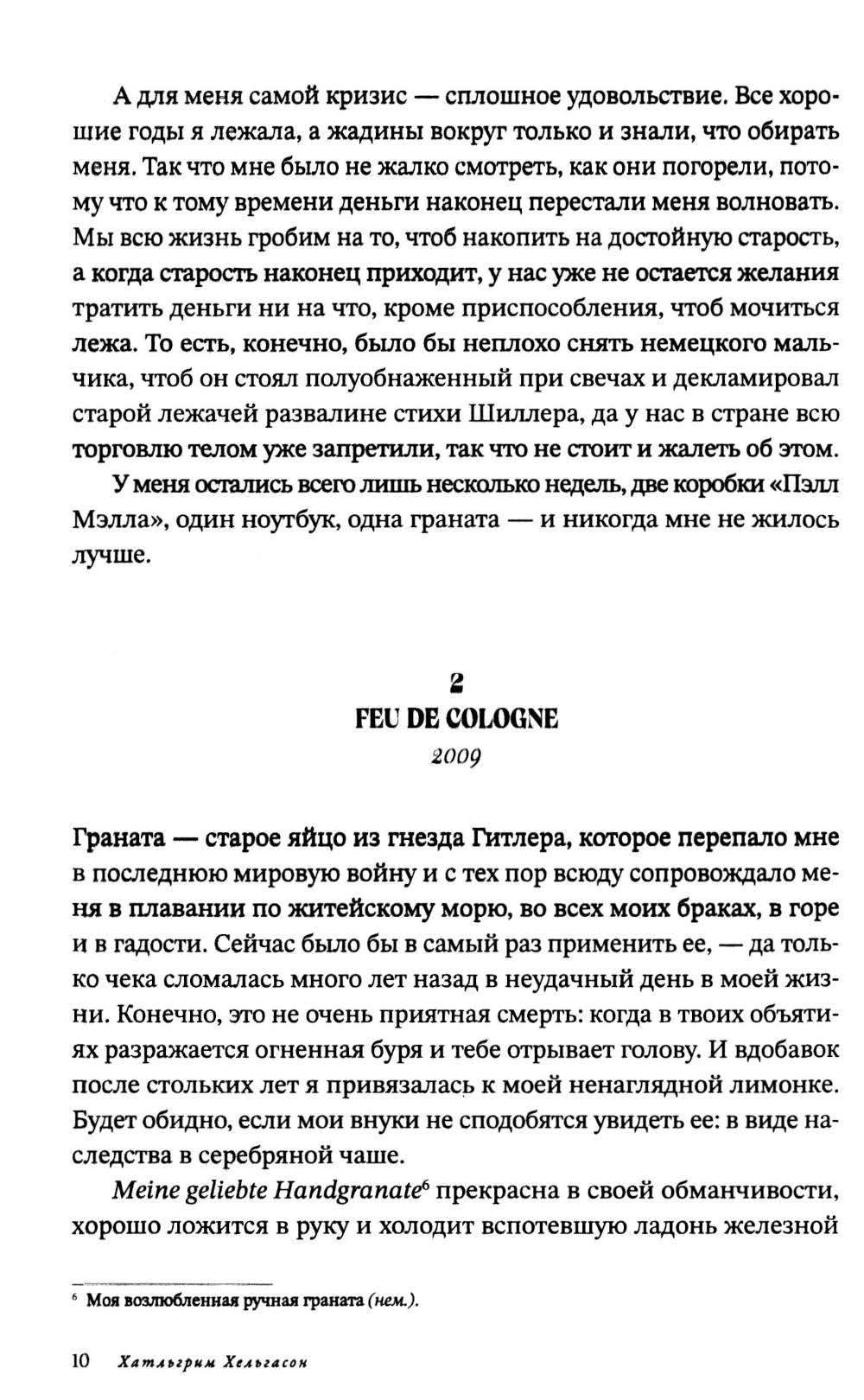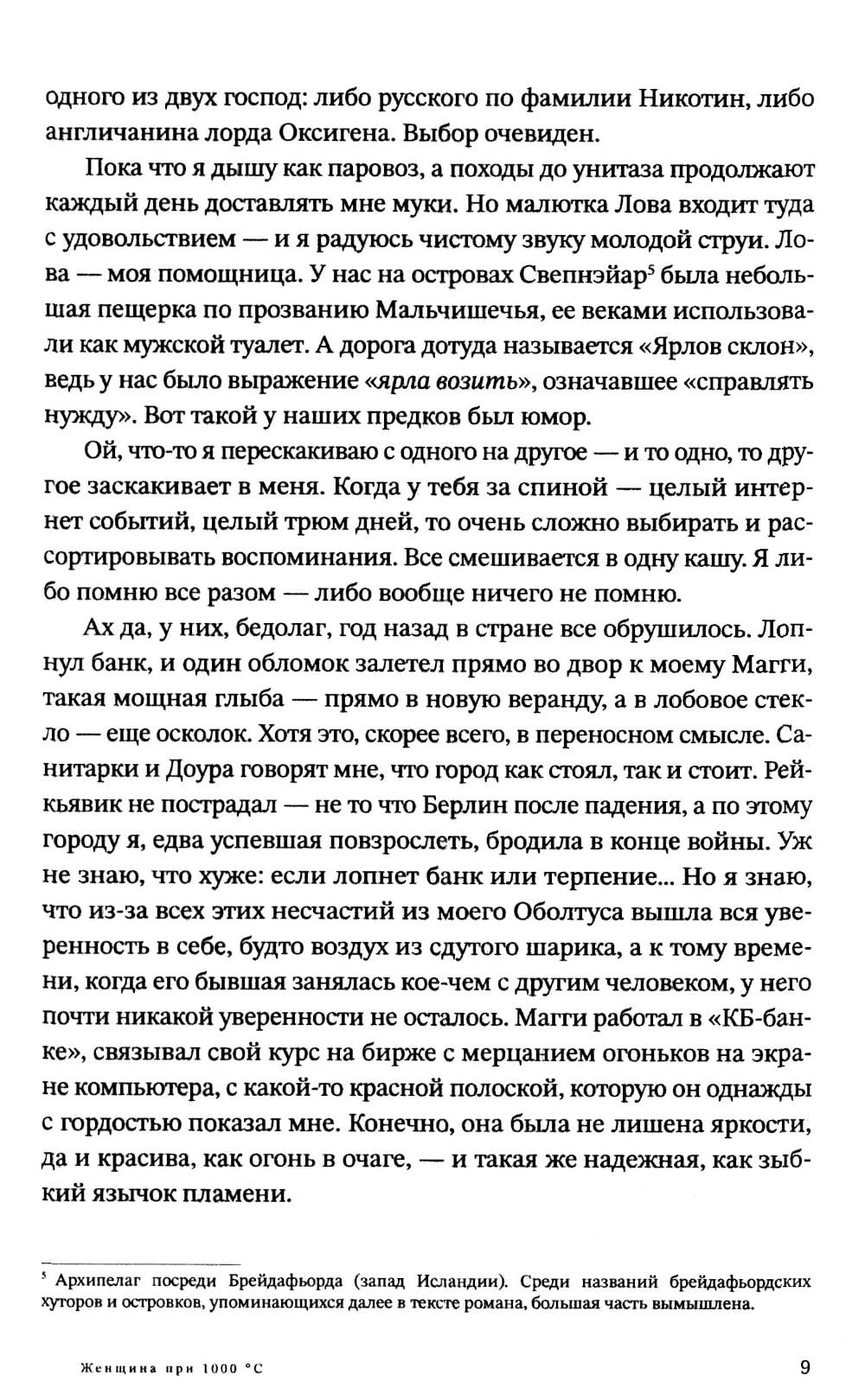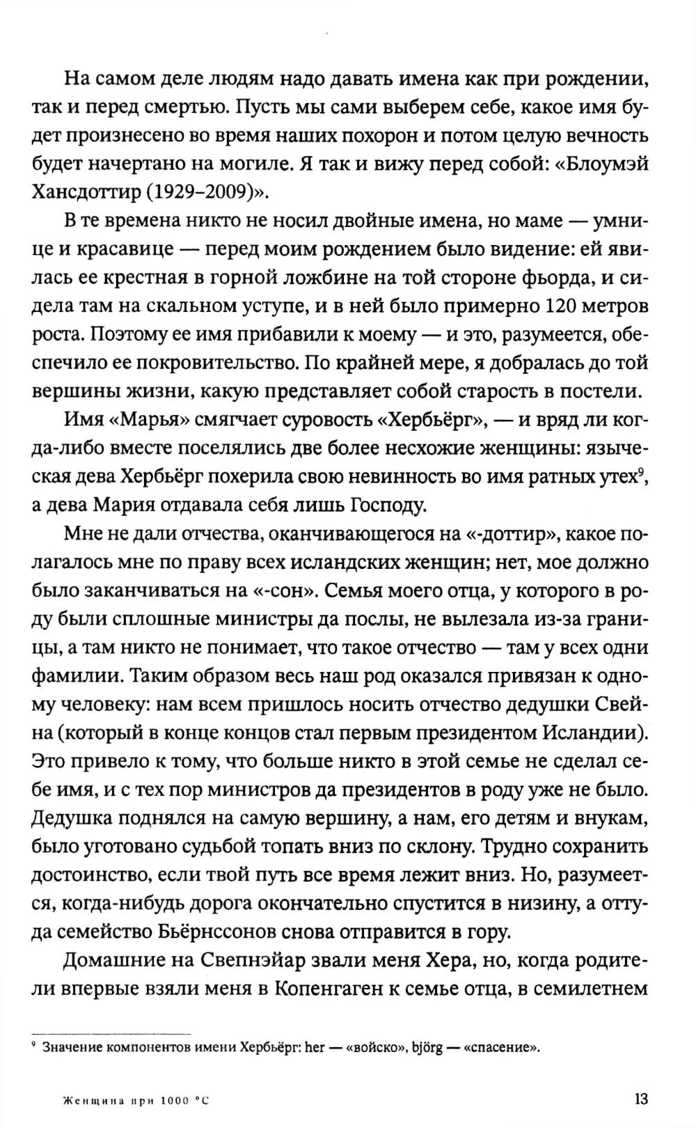 «Женщина при 1000 °C» - это искрометная исповедь восьмидесятилетней исландки по имени Хербьёрг Бьёрнссон, которая живет в одиночестве в гараже в восточной части Рейкьявика, ведет активную переписку по интернету и вспоминает свою насыщенную событиями жизнь. История, вдохновлённая мемуарами внучки первого президента Исландии, повествует о семейных радостях и невероятных поворотах судьбы, о трагедиях и потрясениях ХХ века, в том числе о Второй мировой войне в Дании и Германии. Эмоциональный регистр романа очень широк - от высокого трагизма и тончайшей лиричности до едкой сатиры на современное исландское общество, а стиль автора лишен шаблонности - совсем как биография рассказчицы. Роман «Женщина при 1000 °C» был номинирован на литературную премию Северного совета (2012) и стал бестселлером во многих европейских странах. Книга выходит на русском языке во второй раз в новой редакции.| Издательство | Городец |