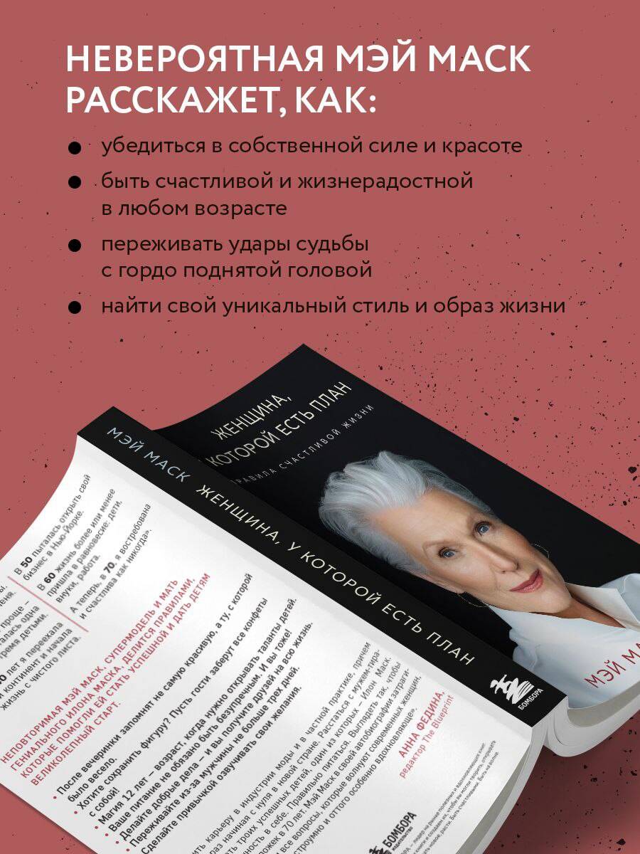 БЕСТСЕЛЛЕР! В РОССИИ ПРОДАНО БОЛЕЕ 179 000 ЭКЗЕМПЛЯРОВ! «Мои 20 были ужасны. Муж унижал и бил меня. Мои 30 были не проще - я развелась и осталась одна с тремя детьми. В 40 лет я переехала на другой континент и начала жизнь с чистого листа. В 50 пыталась открыть свой бизнес в Нью-Йорке. В 60 жизнь более или менее пришла в равновесие: дети, внуки, работа. А теперь, в 70, я востребована и счастлива как никогда». Неповторимая Мэй Маск, супермодель и мать гениального Илона Маска, делится Правилами, которые помогли ей стать успешной и дать детям великолепный старт. • После вечеринки запомнят не саму красивую, а ту, с которой было весело. • Хотите сохранить фигуру? Пусть гости заберут все конфеты с собой! • Магия 12 лет - возраст, когда нужно открывать таланты детей. • Ваше питание не обязано быть безупречным. И вы тоже! • Делайте добрые дела - и вы получите друзей на всю жизнь. • Переживайте из-за мужчины не больше трех дней. • Превратите в привычку всегда озвучивать свои желания вслух.| Издательство | ООО "Издательство "Эксмо" |
