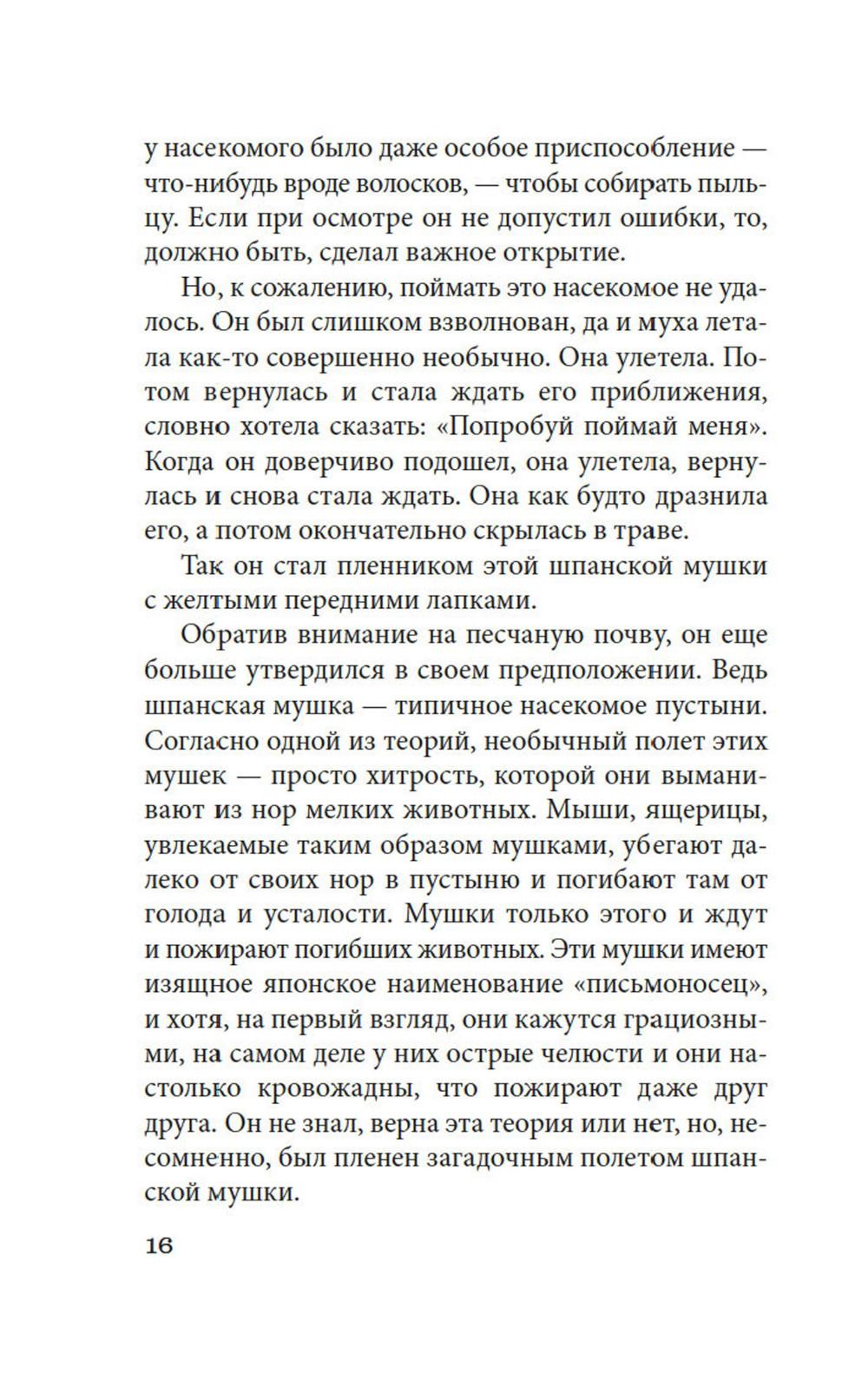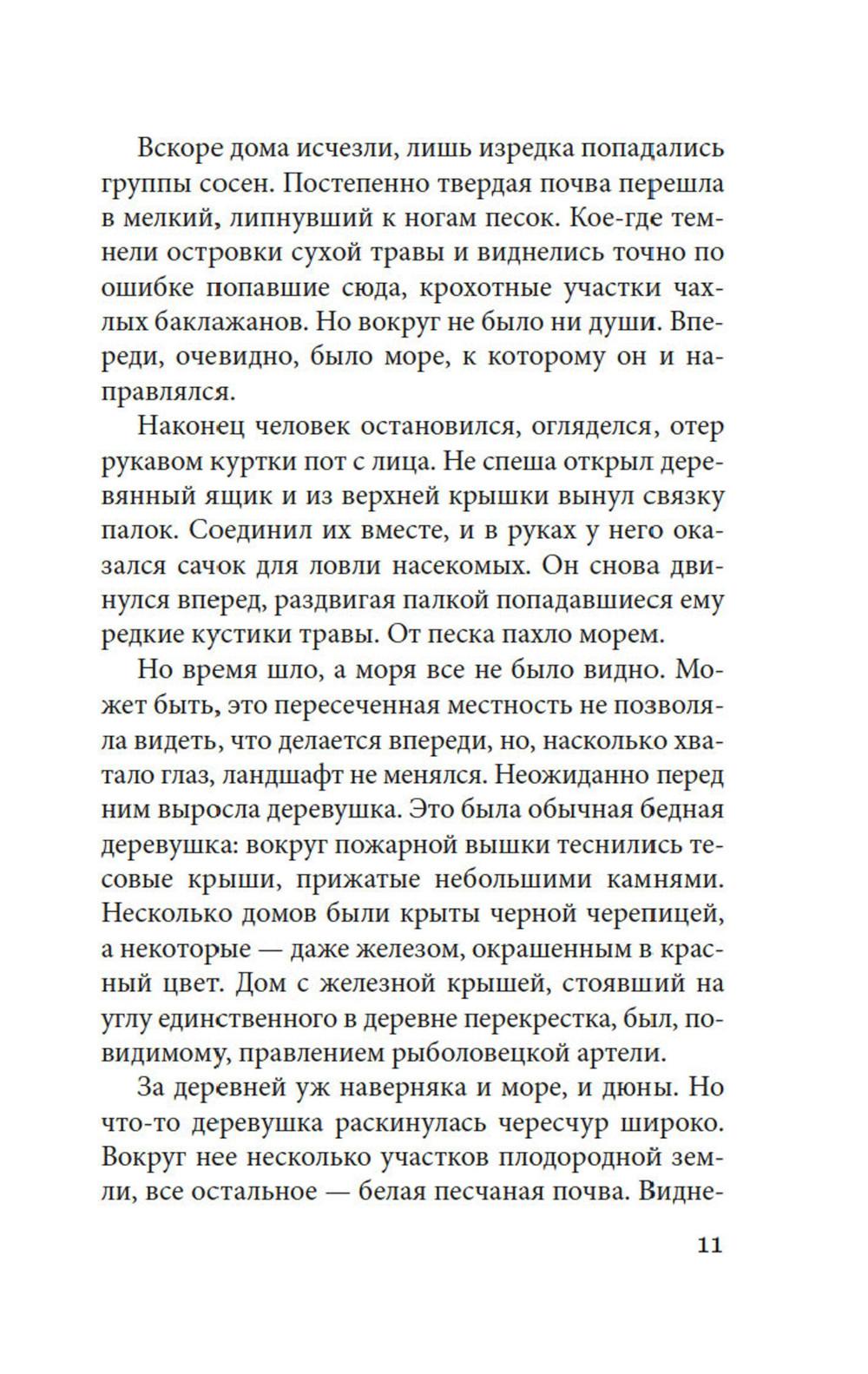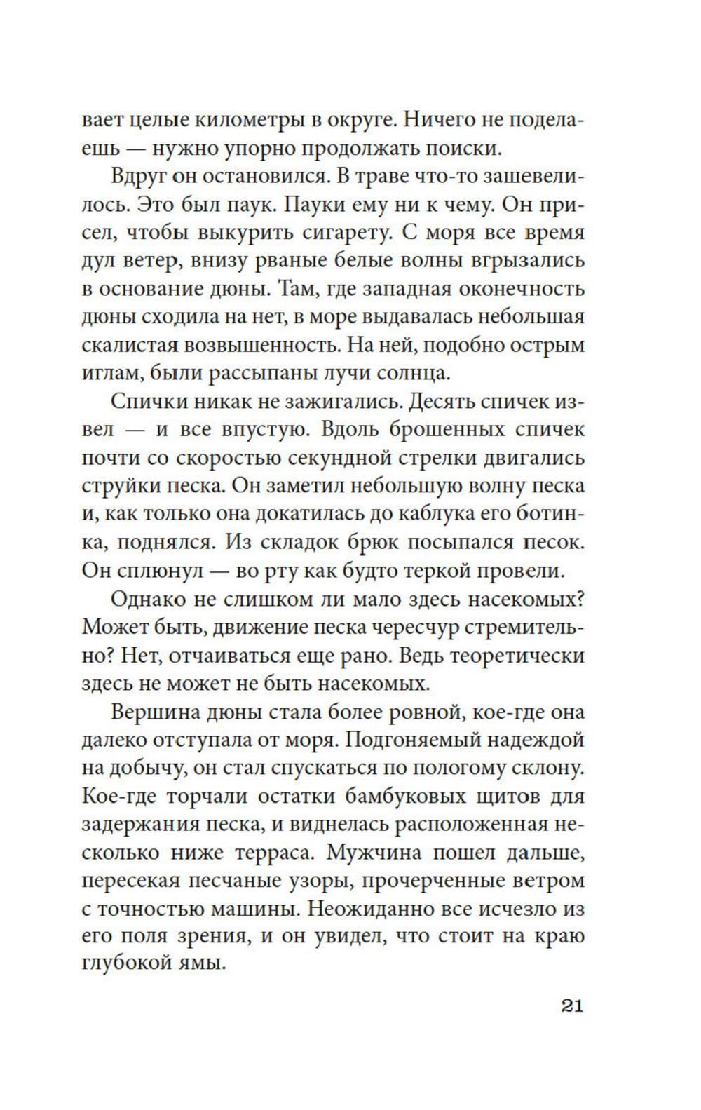 Ники Дзюмпей, скромный энтомолог-любитель, хотел провести на побережье три дня отпуска и пополнить свою коллекцию жуков и бабочек. Вместо этого он оказался в ловушке - в яме среди безбрежных песков, в доме, построенном на песке. Здесь живет женщина, которая день и ночь сражается с этим неумолимым песком, грозящим засыпать дом. Этот песок - словно сама смерть, сама безысходность, он стирает в пыль всякую надежду, но требует ежедневной битвы с собой. И в его глубине таится жизнь-вода... «Женщина в песках» - культовое произведение знаменитого японского прозаика и драматурга Кобо Абэ. Притча, фантастика, гротеск, философское размышление, психологический эксперимент, метафорическая исповедь органично слились в этом простом и лаконичном повествовании, затягивающем, как зыбучий песок.| Издательство | Азбука |