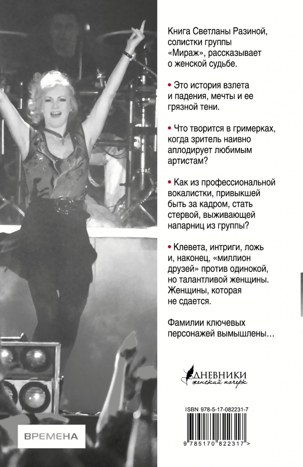 Книга Светланы Разиной, солистки группы «Мираж», рассказывает о женской судьбе. Это история взлета и падения, мечты и ее грязной тени. Что творится в гримёрках, когда зритель наивно аплодирует любимым артистам? Как из профессиональной вокалистки, привыкшей быть за кадром, стать стервой, выживающей напарниц из группы? Клевета, интриги, ложь и, наконец, «миллион друзей» против одинокой, но талантливой женщины. Женщины, которая не сдается.