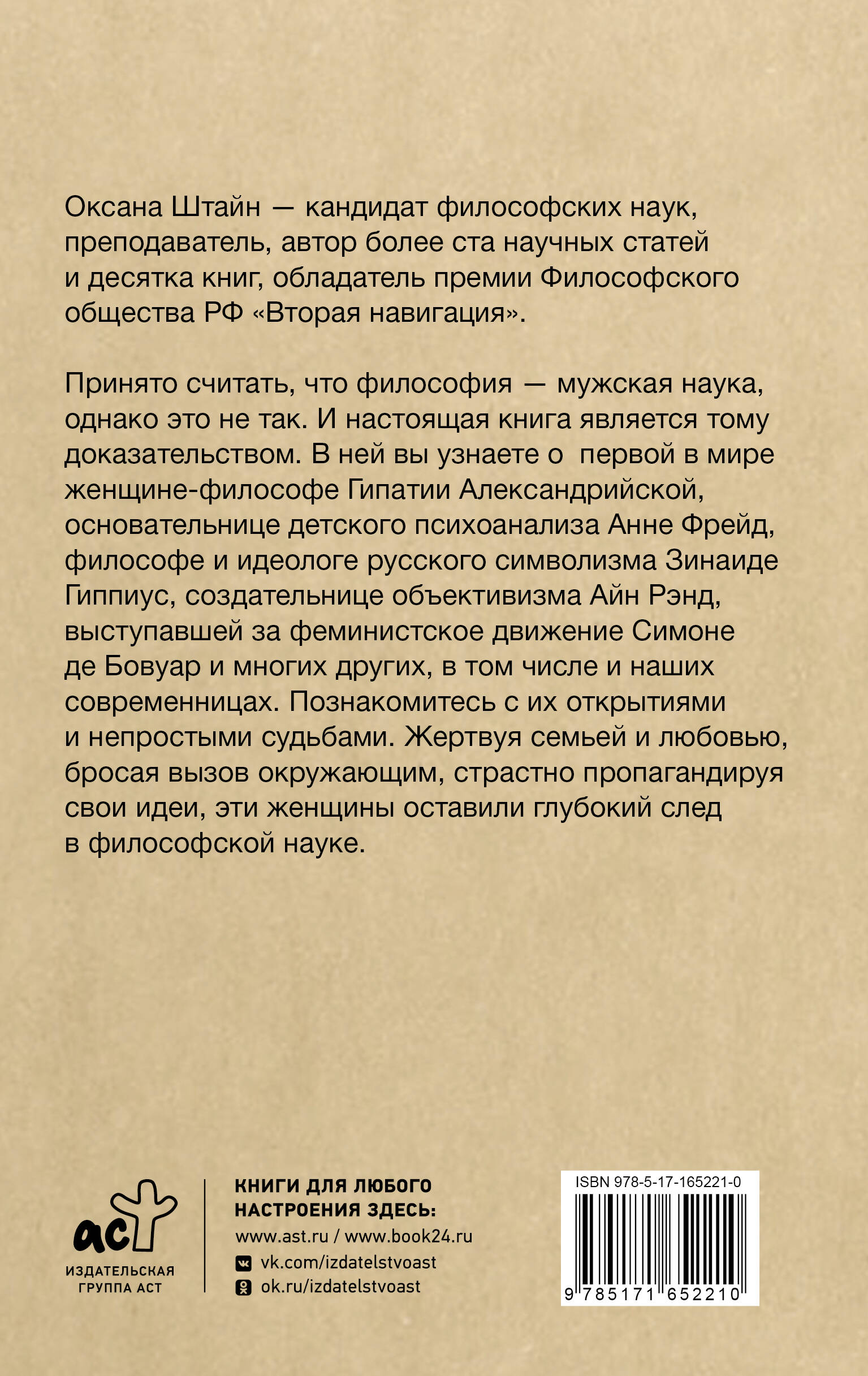 Оксана Штайн - кандидат философских наук, преподаватель, автор более ста научных статей и десятка книг, обладатель премии Философского общества РФ "Вторая навигация". Принято считать, что философия - мужская наука, однако это не так. И настоящая книга является тому доказательством. В ней вы узнаете о первой в мире женщине-философе Гипатии Александрийской, основательнице детского психоанализа Анне Фрейд, философе и идеологе русского символизма Зинаиде Гиппиус, создательнице объективизма Айн Рэнд, выступавшей за феминистское движение Симоне де Бовуар и многих других, в том числе и наших современницах. Познакомитесь с их открытиями и непростыми судьбами. Жертвуя семьей и любовью, бросая вызов окружающим, страстно пропагандируя свои идеи, эти женщины оставили глубокий след в философской науке.| Издательство | Издательство "АСТ" |