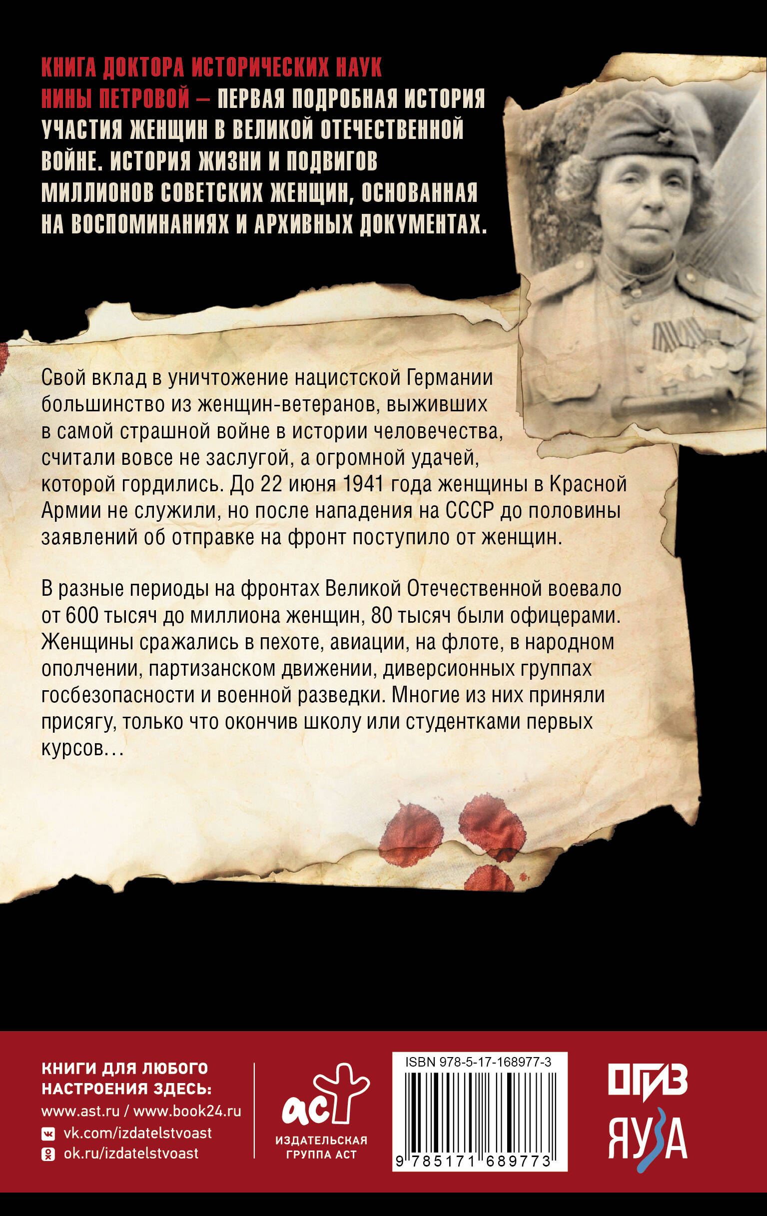 "Напрасно дочек умоляют дома, уж не властен материнский взгляд - у райвоенкоматов и райкомов тургеневские девушки стоят". На фронтах Великой Отечественной войны в разные периоды сражалось от 600 тысяч до миллиона женщин, 80 тысяч были офицерами. В армию многие ушли только закончив школу или студентками первых курсов… До Великой Отечественной женщины в Красной Армии не служили, но после 22 июня 1941 года среди добровольцев, подавших заявления об отправке в действующую армию, до половины ходатайств было от женщин. Кроме того, женщины вступали в народное ополчение, участвовали в партизанском движении, сражались в диверсионных группах госбезопасности и военной разведки. Всего за подвиги в годы войны 90 женщин были удостоены звания Героя Советского Союза (больше половины - посмертно). Вклад в уничтожение Третьего Рейха большинство из них, тех кто выжил в самой страшной войне в истории человечества, считало не своей заслугой, а огромной удачей, которой они гордились. Книга доктора исторических наук Нины Петровой - это первая подробная история участия советских женщин в Великой Отечественной войне. История жизни и подвигов миллионов советских женщин, основанная на воспоминаниях и архивных документах, долгие годы закрытых для историков.| Издательство | Издательство "АСТ" |