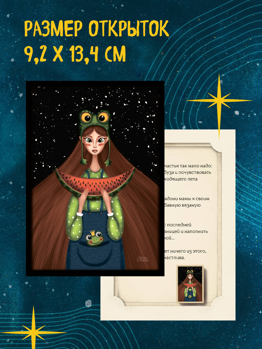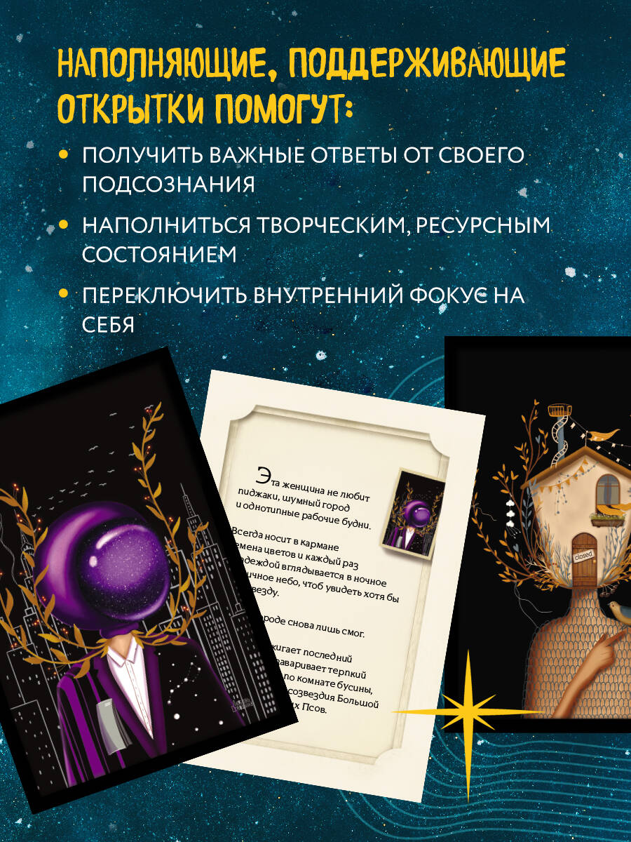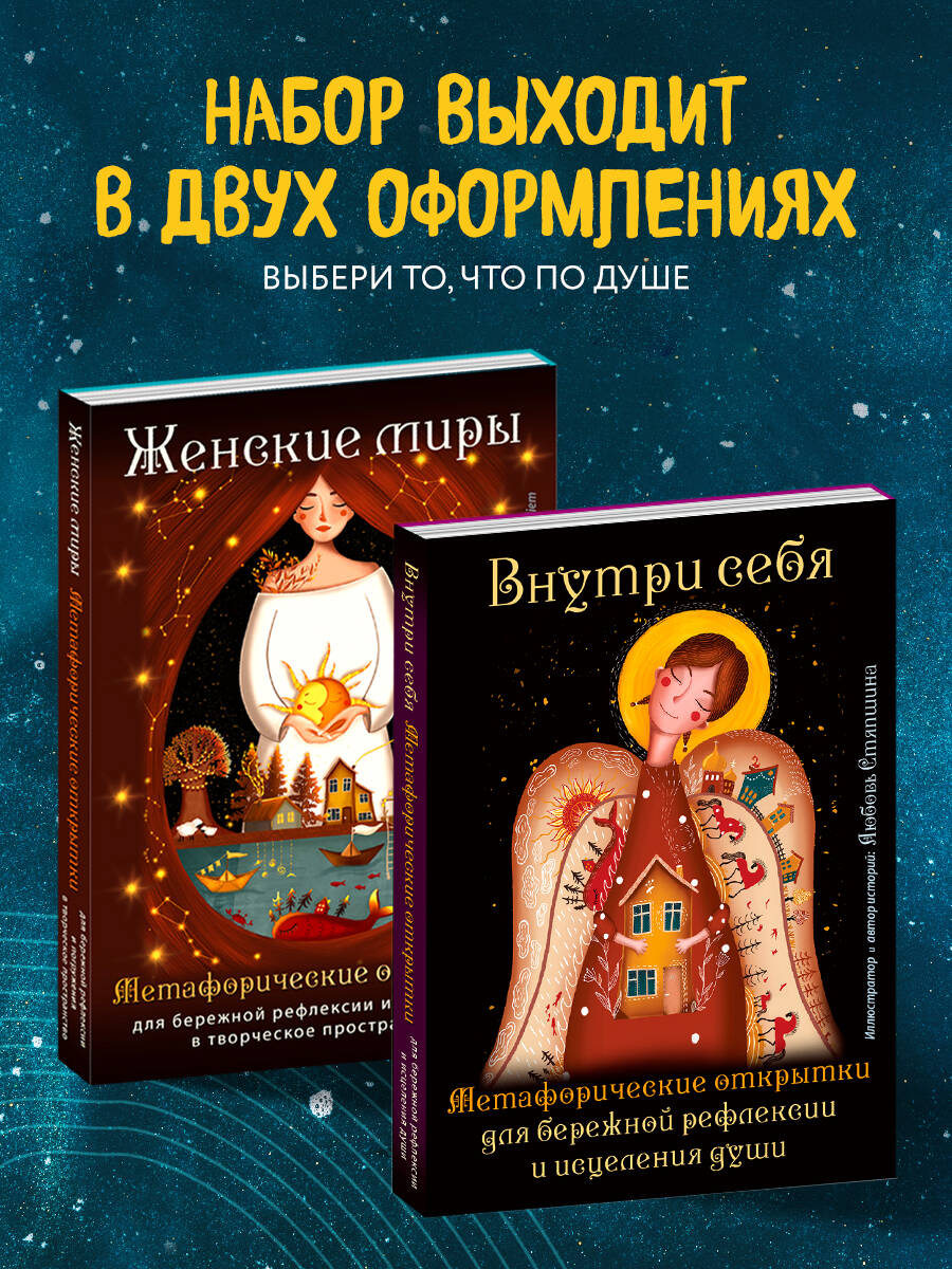 «Женские миры» - набор из 20 наполняющих метафорических открыток и посланий для женщин от автора бестселлера «Прикоснись к себе» Любови Стяпшиной. «В моменты, когда западный ветер, путешествуя со стаей перелетных птиц, разносит тревожные вести, эта женщина нежно обнимает мир, стараясь не пропустить ни одного дома. В такие дни каждый может почувствовать ее любовь и присутствие», - тексты на открытках, словно древние песни - бережно баюкают и обнимают, шепчут слова поддержки и помогают окунуться в целительное творческое пространство. Глубокие и насыщенные цвета иллюстраций, контраст, которым пропитаны все изображения, позволяет находить в жизни множество индивидуально значимых нюансов. Автор соединяет в одной картине совершенно несочетаемые истории, бережно ведя нас за руку из одного мира - в другой. Из грусти - в радость. От чашки крепкого чая - к путешествию по просторам вселенной. То черничное небо, то ласковый океан, то ночь оплетают наши сердца ветром и прохладой. Обещая счастье. С каких планет прилетели ко мне все волшебные девушки и как могут помочь в решении моей проблемы? Почему на многих иллюстрациях повторяется один и тот же мотив, прорастающих сквозь чашки, плечи и дома - ростков? На одних открытках у девушки есть лицо, а на других оно, словно специально, прикрыто каким-то необычным образом. Как мне это трактовать? Работа с метафорическими открытками - это не гадание, они не предсказывают будущее и не дают информацию ни о ком, кроме вас. То, что вы видите на изображении, и то, о чем читаете в истории, то, как вы себе объясняем увиденное, - и есть ключ к тем ответам, которые вы ищете. Берегите себя и будьте счастливы! Открытки можно использовать: - как профессиональный психологический инструмент в работе психологов, арт-терапевтов и специалистов других помогающих профессий; - как инструмент самопомощи для личного чтения.| Издательство | ООО "Издательство "Эксмо" |