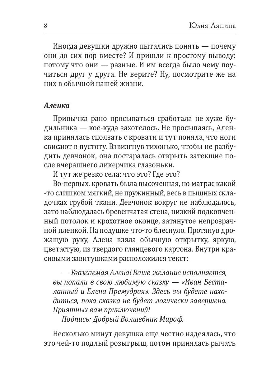 Пять хороших подруг попадают в любимые сказки, и все бы ничего - кто из нас не мечтал полетать на ковре-самолете или померить «жемчуга бурмицкие»? Да только не все так просто - для каждой любимая сказка становится испытанием душевных качеств, и каждой предстоит найти нет, не счастье, просто любовь. Прошло ни много ни мало три года… Теперь в сказки девушки попадут не в одиночестве. А уж что с ними там произойдет, и не только с ними… Семейная жизнь порой превращается в нелегкое испытание. Кажется, что брак вот-вот пошатнется и тогда на помощь приходят друзья и подруги, а еще немного сказочного волшебства!| Издательство | Т8 RUGRAM |