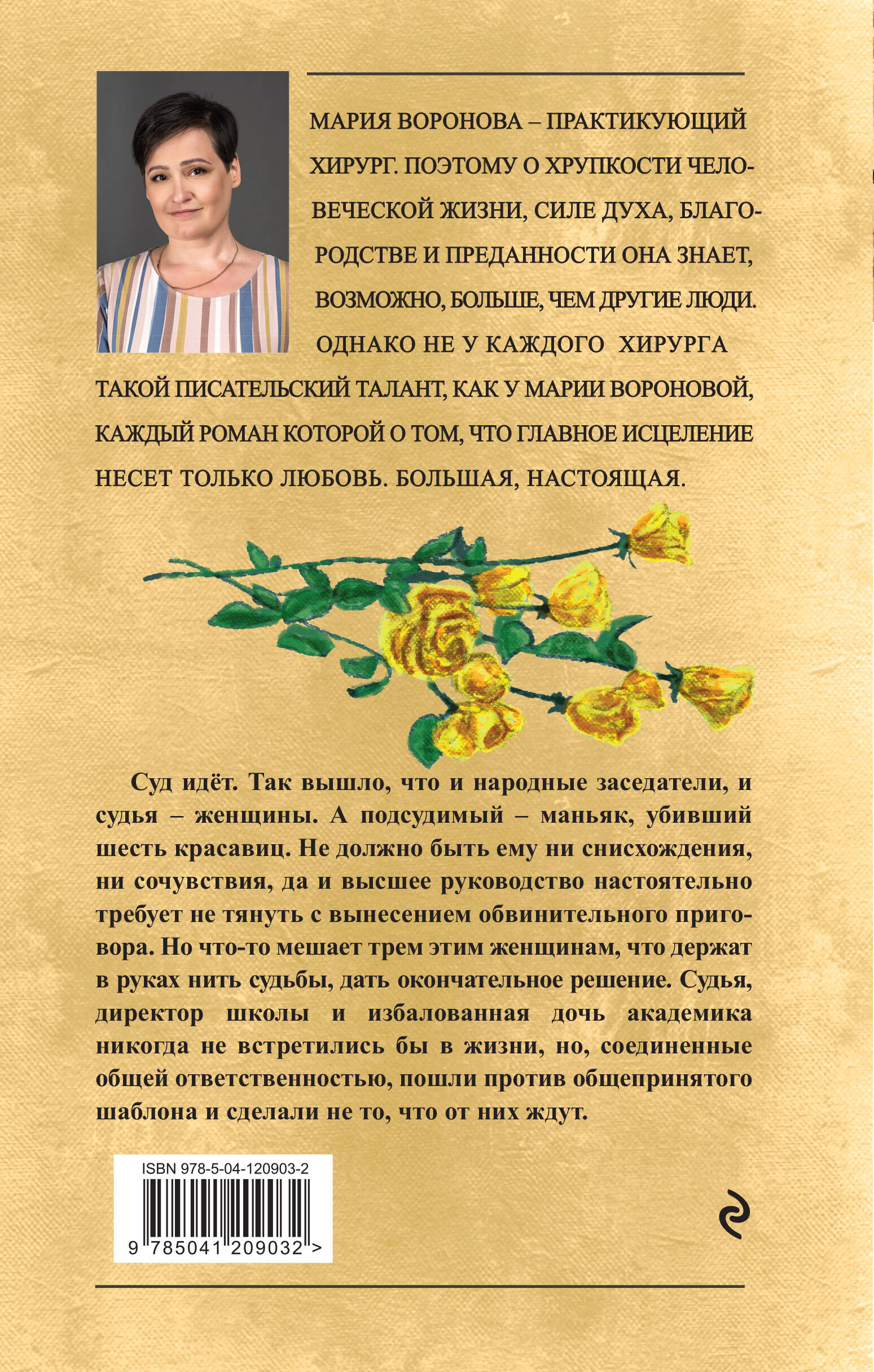 Мария Воронова давно известна среди читателей как автор женского романа и постепенно набирает популярность. Она практикующий хирург, ежедневно сталкивающийся с десятками человеческих судеб. Ее работа дает огромное количество жизненных сюжетов, которые получают воплощение на бумаге. Ее романы мудры, герои живые, а многие фразы становятся афоризмами. Первая книга об Ирине Поляковой. Молодой судье впервые приходится судить и приговорить к высшей мере наказания убийцу-маньяка, подпольного рок-музыканта Мостового. Она готова исполнить свой долг, но чем дальше слушается дело, тем больше сомнений возникает у нее в виновности подсудимого. Установить истину судье помогают народные заседатели, директор школы Надежда Георгиевна и аспирантка Наташа.| Издательство | ООО "Издательство "Эксмо" |