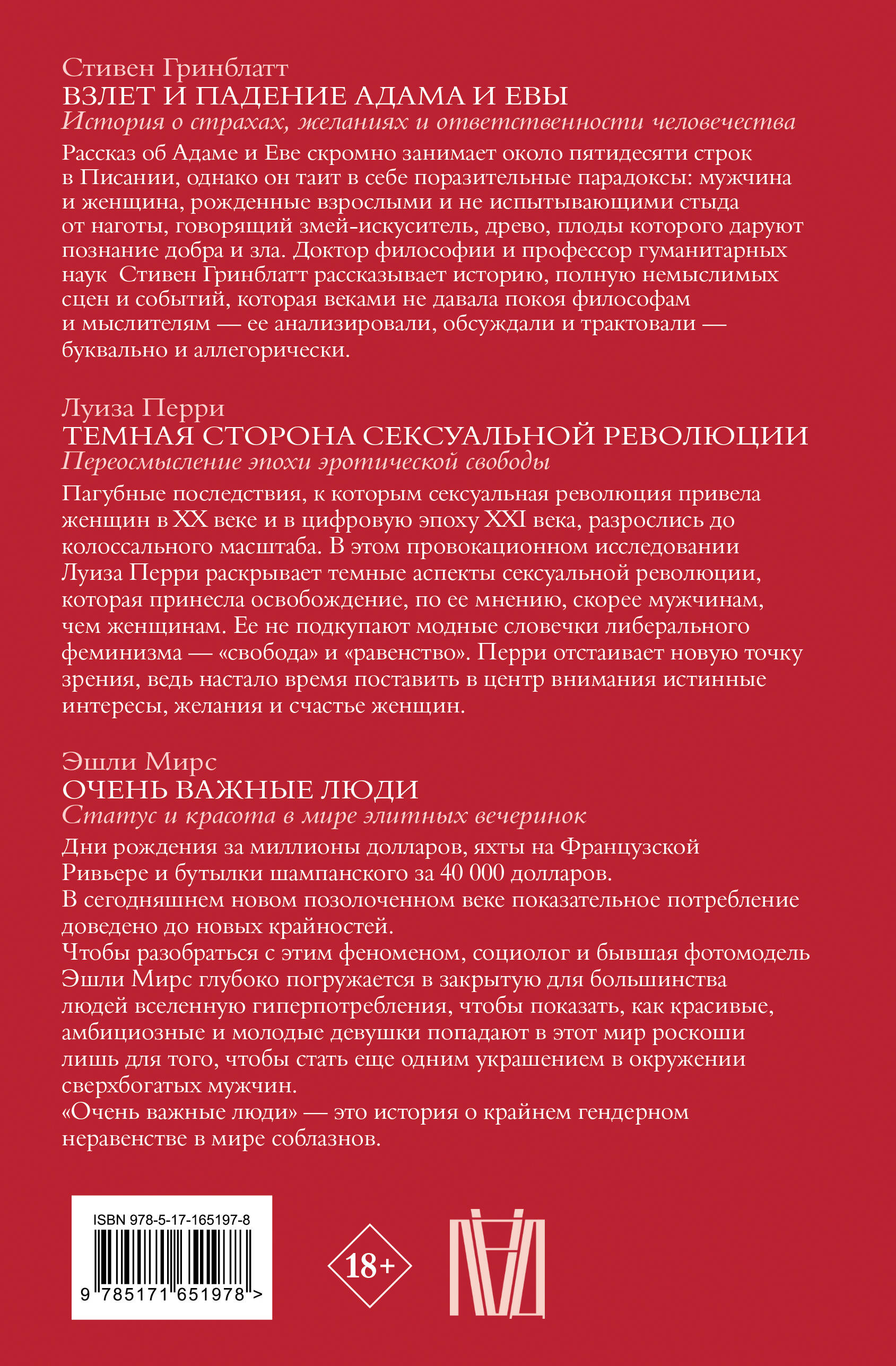 Взлет и падение Адама и Евы. История о страхах, желаниях и ответственности человечества. Рассказ об Адаме и Еве скромно занимает около пятидесяти строк в Писании, однако он таит в себе поразительные парадоксы: мужчина и женщина, рожденные взрослыми и не испытывающими стыда от наготы, говорящий змей-искуситель, древо, плоды которого даруют познание добра и зла. Доктор философии и профессор гуманитарных наук Стивен Гринблатт рассказывает историю, полную немыслимых сцен и событий, которая веками не давала покоя философам и мыслителям - ее анализировали, обсуждали и трактовали - буквально и аллегорически. Темная сторона сексуальной революции. Переосмысление эпохи эротической свободы. Пагубные последствия, к которым сексуальная революция привела женщин в XX веке и в цифровую эпоху XXI века, разрослись до колоссального масштаба. В этом провокционном исследовании Луиза Перри раскрывает темные аспекты сексуальной революции, которая принесла освобождение, по ее мнению, скорее мужчинам, чем женщинам. Ее не подкупают модные словечки либерального феминизма - "свобода" и "равенство". Перри отстаивает новую точку зрения, ведь настало время поставить в центр внимания истинные интересы, желания и счастье женщин. Очень важные люди. Статус и красота в мире элитных вечеринок. Дни рождения за миллионы долларов, яхты на Французской Ривьере и бутылки шампанского за 40 000 долларов. В сегодняшнем новом позолоченном веке показательное потребление доведено до новых крайностей. Чтобы разобраться с этим феноменом, социолог и бывшая фотомодель Эшли Мирс глубоко погружается в закрытую для большинства людей вселенную гиперпотребления, чтобы показать, как красивые, амбициозные и молодые девушки попадают в этот мир роскоши лишь для того, чтобы стать еще одним украшением в окружении сверхбогатых мужчин. "Очень важные люди" - это история о крайнем гендерном неравенстве в мире соблазнов.