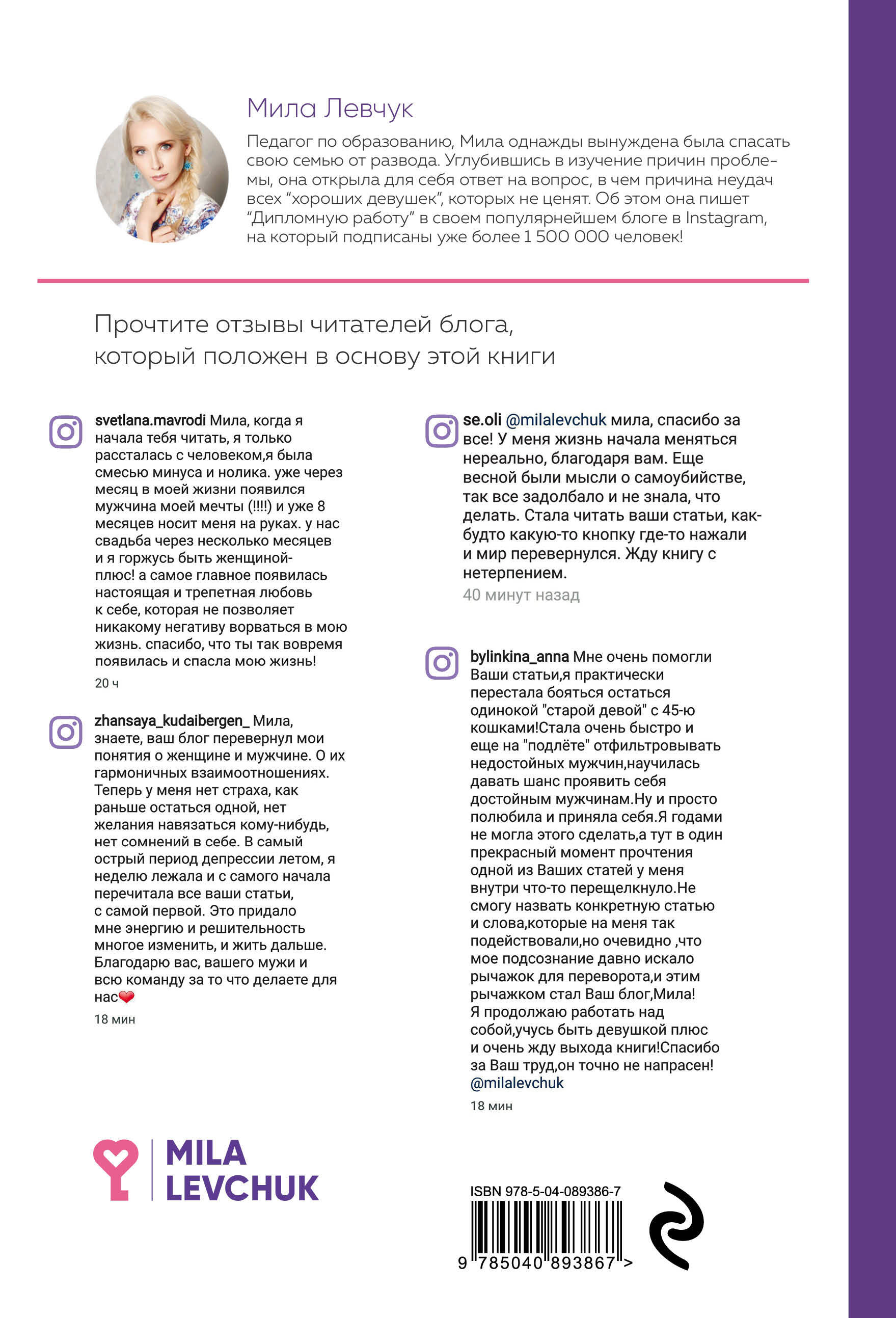 Для кого эта книга Эта книга для девушек, которые находятся в поиске своего любимого и единственного, и для тех, кому надоело страдать в отношениях, кто мечтает стать той, которую ценят и носят на руках. Фишки книги 1) Только проверенные на практике знания - Мила была настоящей «неудачницей» в отношениях, дошло даже до развода. Но она смогла спасти свои отношения. 2) Уникальный стиль - с юмором, просто, как будто в разговоре с подругами, Мила рассказывает истории, описывает техники и даёт домашние задания. 3) Уникальный контент - в этой книге собрано и структурировано множество статей из блога Милы в «Инстаграме», но также в неё добавлены главы, которые ранее нигде не публиковались, а ещё имеется практика, которой нет даже на её онлайн-курсе. 4) Гарантия пользы - прочтите и убедитесь! Никакой воды, только аргументы и пошаговые техники. Вы точно полюбите себя и измените жизнь к лучшему! 5) Легко учиться - чаще всего Миле говорят, что она как никто умеет разложить всё по полочкам и «включить свет в темной комнате». 6) Живые отзывы - прямо в тексте вы сможете увидеть скриншоты из социальных сетей, где пользователи оставляли свои отзывы о том, как та или иная техника сработала в их ситуации. Это вдохновляет и вселяет веру в то, что и у вас всё получится! Об авторе Мила Левчук - эксперт в вопросе отношений мужчины и женщины, популярный блогер, тренер. Когда ее брак оказался на грани краха, она не сдалась и взялась разбираться, почему ничего не получается. Она спасла свою семью и нашла для себя ответ на вопрос, в чем причина неудач всех «хороших» девушек, которых не ценят. Об этом она пишет «Дипломную работу» в своём популярнейшем блоге в Instagram, на который подписаны уже более 1,5 млн человек!| Издательство | ООО "Издательство "Эксмо" |
