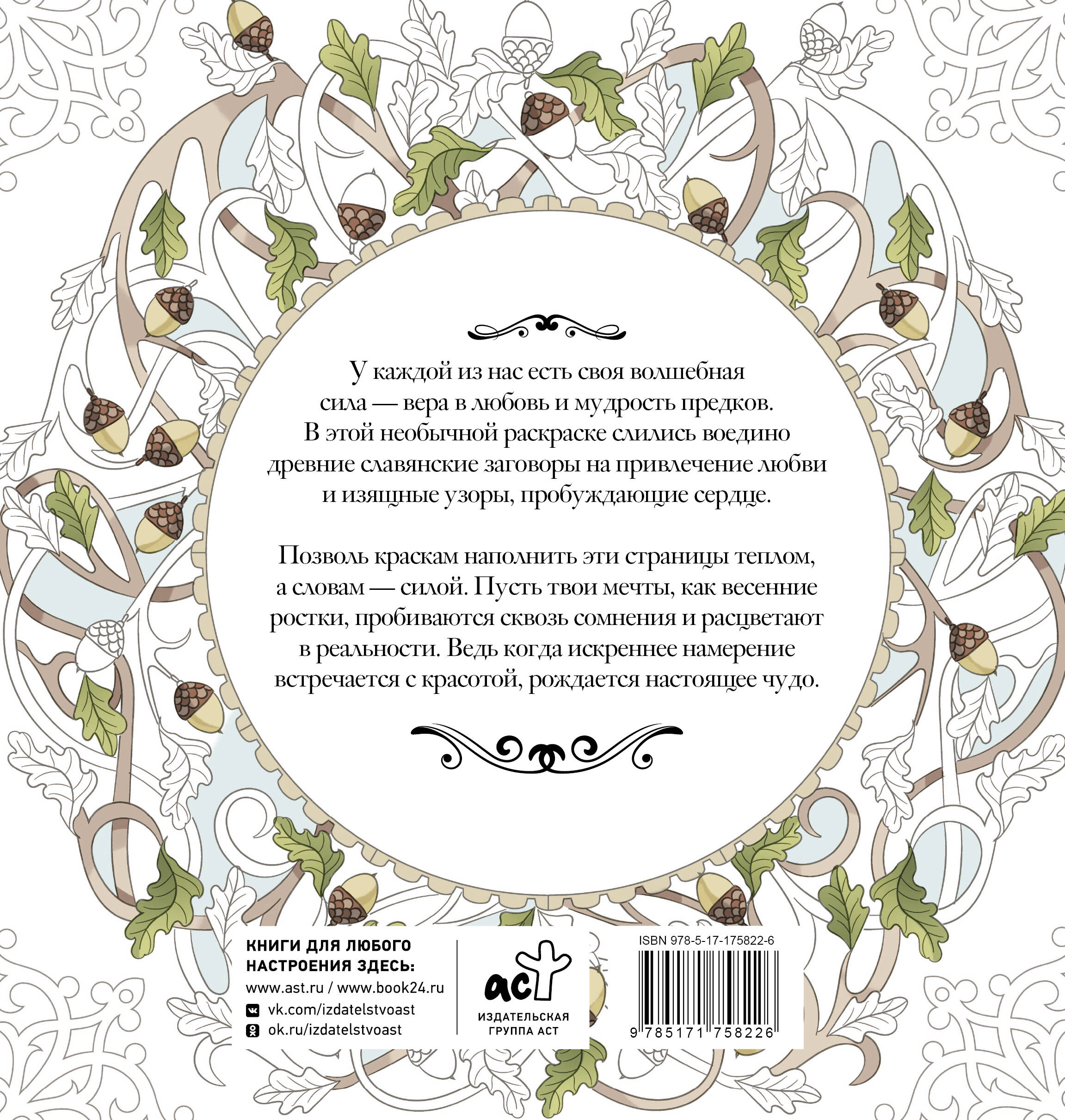 У каждой из нас есть своя волшебная сила - вера в любовь и мудрость предков. В этой необычной раскраске слились воедино древние славянские заговоры на привлечение любви и изящные узоры, пробуждающие сердце. Позволь краскам наполнить эти страницы теплом, а словам - силой. Пусть твои мечты, как весенние ростки, пробиваются сквозь сомнения и расцветают в реальности. Ведь когда искреннее намерение встречается с красотой, рождается настоящее чудо.| Издательство | Издательство "АСТ" |