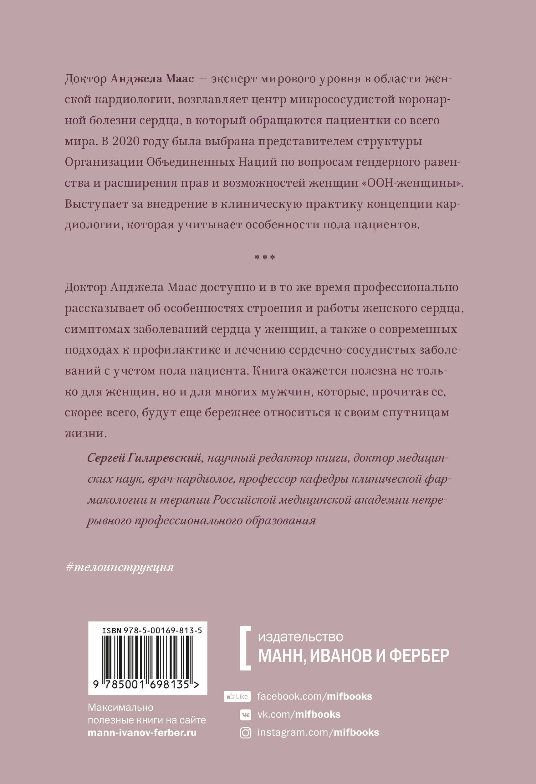 Современный подход к лечению заболеваний сердца, учитывающий пол пациента, от всемирно признанного эксперта в области женской кардиологии. В начале этого века сердечно-сосудистые заболевания стали одной из основных причин смертности у женщин во всем мире. При этом врачи практически не уделяют внимание различиям мужского и женского организмов, и все подходы к терапии остаются, как исторически сложилось, ориентированными на мужчин. Между тем, кардиология - та область медицины, в которой эти различия проявляются наиболее ярко и действительно имеют значение. Доказано, что у женщин и мужчин неодинаково протекают процессы старения сердца, по-разному происходит развитие атеросклероза и аритмий, инфаркты имеют разную симптоматику. Профессор Анджела Маас, пионер в области в области исследований здоровья женского сердца и руководитель центра микрососудистой коронарной болезни сердца, в который обращаются пациентки со всего мира, рассказывает о девяти традиционных факторах риска развития заболеваний сердца. А также о том, какие характерные для женщин факторы могут подсказать, что у них повышен риск развития осложнений сердечно-сосудистых заболеваний: симптомы менопаузы; нарушения менструального цикла; приступы мигрени; эмоциональный стресс; хронические воспалительные заболевания. Результаты научных исследований доктор Маас сопровождает описанием случаев из клинической практики. Вы узнаете, как позаботиться о себе и своих близких, на какие факторы риска обращать внимание, чтобы предотвратить проблемы со здоровьем. Вы поймете, какие вопросы задавать врачу и как с ним общаться, чтобы он мог быстро поставить точный диагноз и назначить правильное лечение. Книга будет интересна и представителям профессионального сообщества, так как она поднимает важный для медицины вопрос о том, что пол пациента нельзя игнорировать, и необходимо перенести это понимание в клиническую практику. Для кого книга: Для тех, кто хочет понять, как устроено сердце, в частности, женское Для тех, кто хочет научиться лучше заботиться о себе и своих близких Для профессионалов, которые следят за передовыми исследованиями и совершенствуют свои навыки От автора: В 1991 году были опубликованы результаты первых исследований, изменившие представления о подходах к терапии сердечных приступов (инфаркта миокарда), и с тех пор мне не дает покоя вопрос о необходимости учитывать пол пациента при выборе тактики его лечения. Достижения последних десятилетий в области интервенционной кардиологии и визуализирующих исследований сердца не оставляют никаких сомнений: пол больного оказывает влияние на выраженность и характер проявлений коронарной болезни сердца. Атеросклероз и старение миокарда у мужчин и женщин происходит по-разному, поэтому для постановки верного диагноза необходимо искать другие подходы, а для лечения - другие варианты. Несмотря на большой прогресс в области знаний о сердце женщины, их практическое применение сильно отстает. В 2000 году я участвовала в первой международной конференции по болезням сердца у женщин, которая проходила в канадском городе Виктория. Там я осознала необходимость более пристального исследования этой темы и изменения подходов к терапии, ориентированных на мужчин. В 2003 году я открыла первый в Нидерландах диагностический к