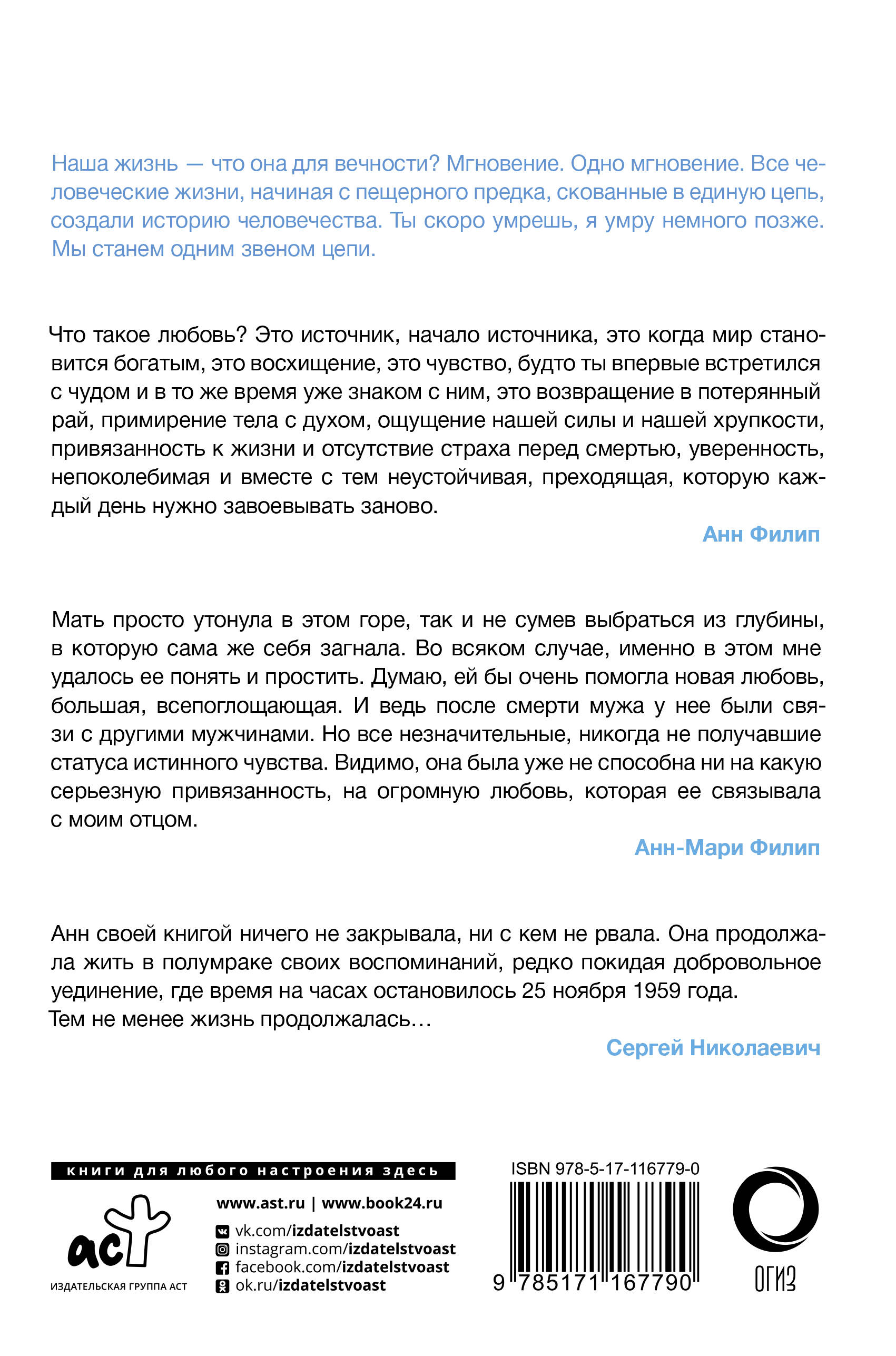 Книга "Одно мгновение" написана Анн Филип, вдовой извест- ного актера, иконы послевоенного французского кинематографа - Жерара Филипа. Его жизнь оборвалась в тридцать семь лет в самом зените славы. Судьбой им была уготована недолгая, но зато очень яркая и счастливая совместная жизнь. Анн Филип пережила своего мужа на тридцать лет, сохранив до конца верность их всепоглощающей любви. "Одно мгновение" - бесконечный монолог женщины, обра- щенный к умершему мужу, к тому, кого она бесконечно любила при жизни и продолжала любить после его смерти. Эта история глубоко исповедальна. В ней переплетены два рассказа, два разных взгляда - жены и дочери великого актера.| Издательство | ИЗДАТЕЛЬСТВО "АСТ" |
