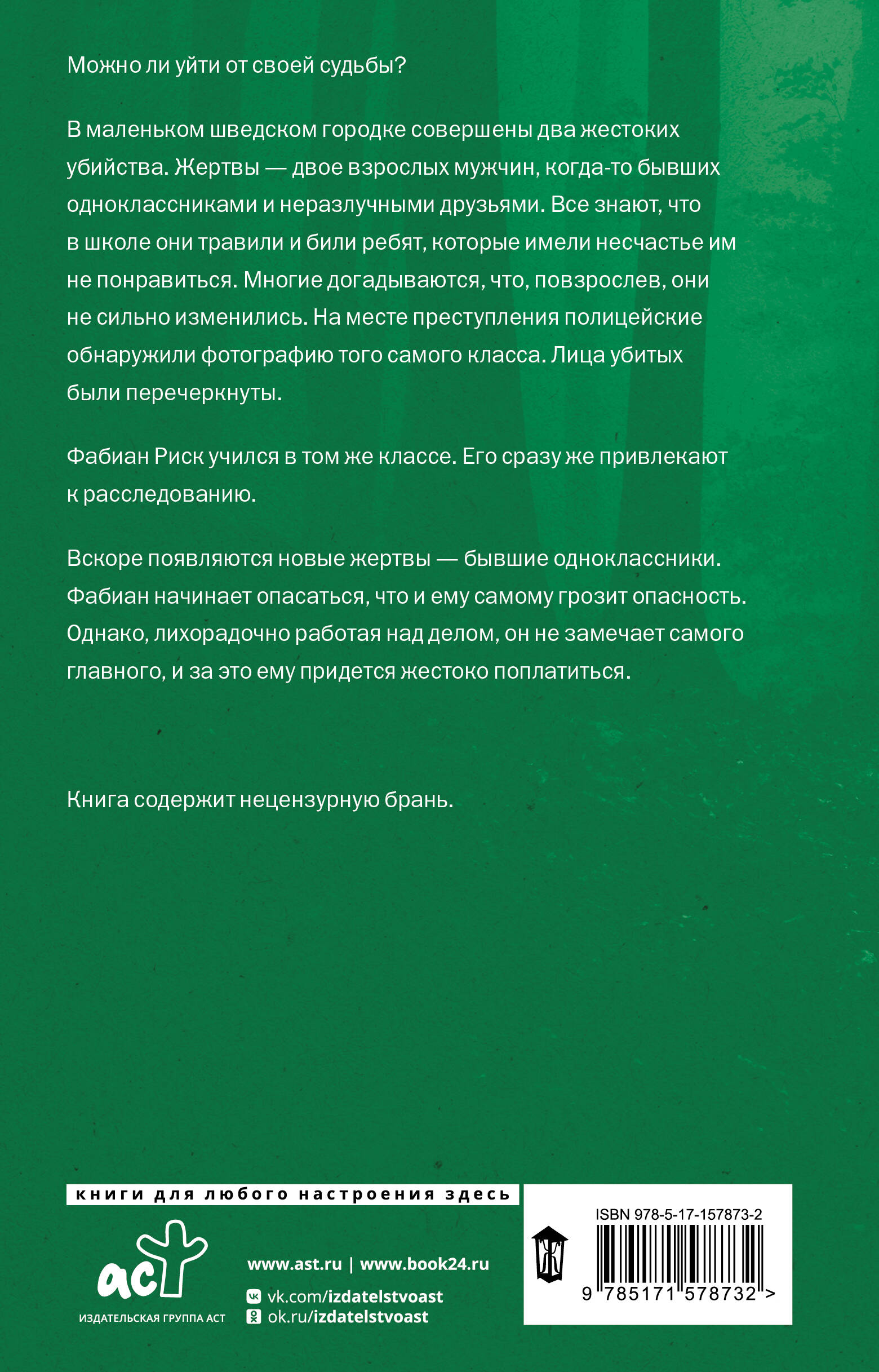 Можно ли уйти от своей судьбы? В маленьком шведском городке совершены два жестоких убийства. Жертвы - двое взрослых мужчин, когда-то бывших одноклассниками и неразлучными друзьями. Все знают, что в школе они травили и били ребят, которые имели несчастье им не понравиться. Многие догадываются, что, повзрослев, они не сильно изменились. На месте преступления полицейские обнаружили фотографию того самого класса. Лица убитых были перечеркнуты. Фабиан Риск учился в том же классе. Его сразу же привлекают к расследованию. Вскоре появляются новые жертвы - бывшие одноклассники. Фабиан начинает опасаться, что и ему самому грозит опасность. Однако, лихорадочно работая над делом, он не замечает самого главного, и за это ему придется жестоко поплатиться.| Издательство | ИЗДАТЕЛЬСТВО "АСТ" |