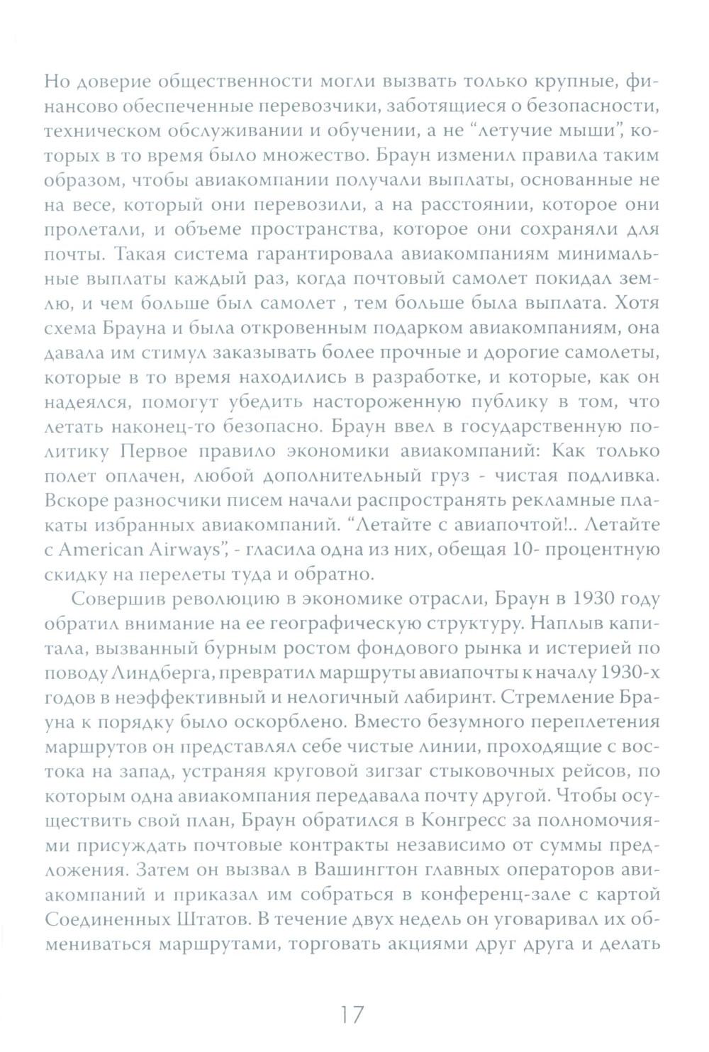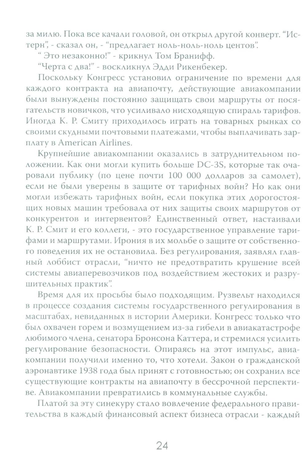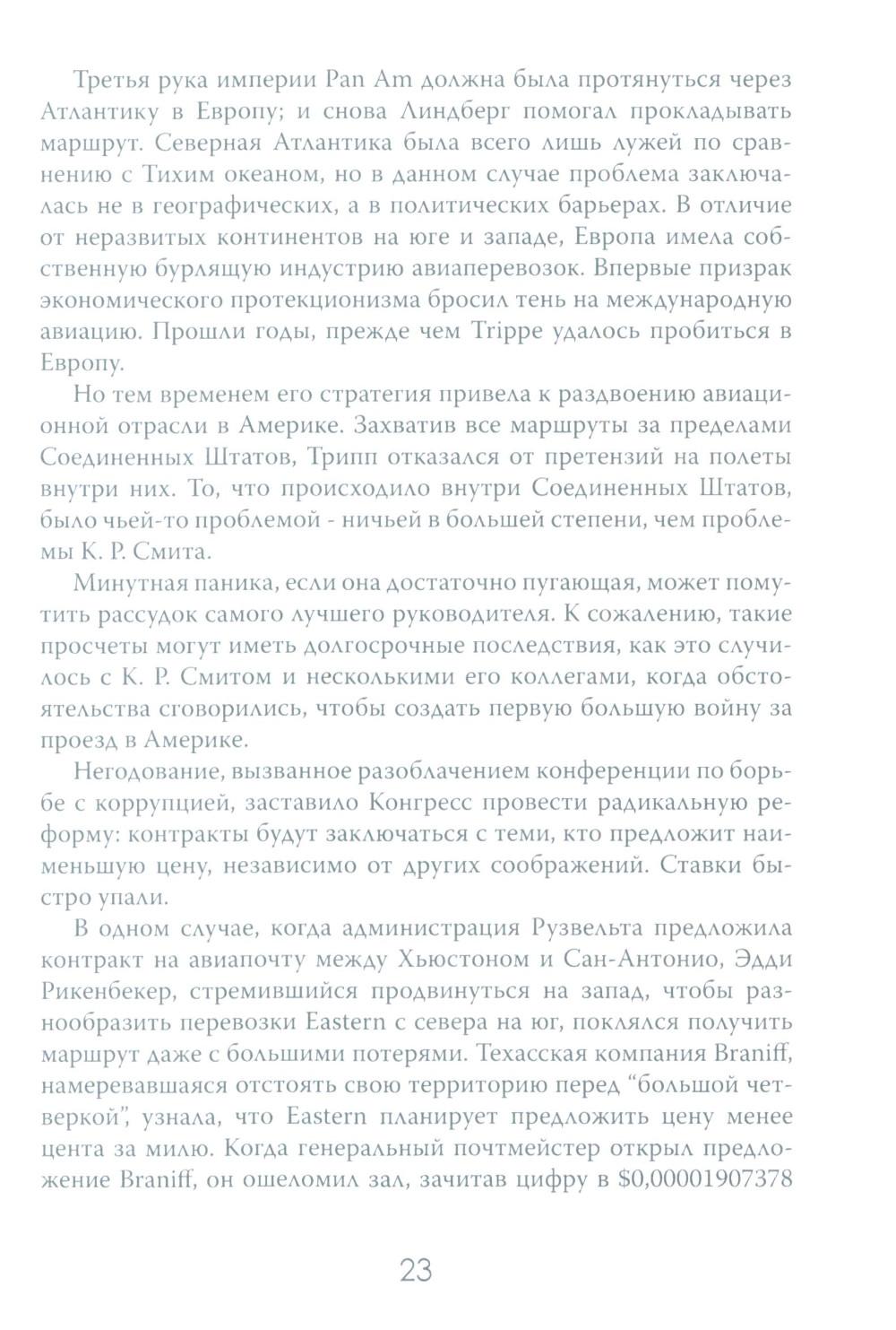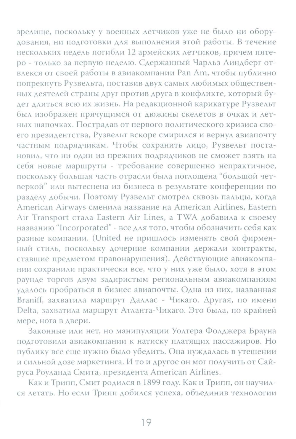 Авиаперелёты уже давно стали обыденной частью человеческой жизни. Ежедневно в небо взмывает множество "железных птиц", перевозя на борту пассажиров в разные части света. Для людей важны удобство и комфорт, и мало кто задумывается о том, как устроены эти огромные корпорации, на чём стоит бизнес авиакомпаний. Данное издание представляет собой увлекательный экскурс в авиаотрасль США на примере крупнейших авиационных компаний. По утверждению автора, американские (и некоторые зарубежные) авиакомпании представляют собой необычайно ясное окно, через которое можно наблюдать за социальными и экономическими потрясениями, охватившими весь мир. Читателю даётся возможность заглянуть в это окно и увидеть все тонкости закулисного авиационного бизнеса, познакомиться с ключевыми игроками этого рынка и проследить истории успеха и ошибок, выяснить механизмы борьбы за власть и за прибыль.| Издательство | Картина мира |