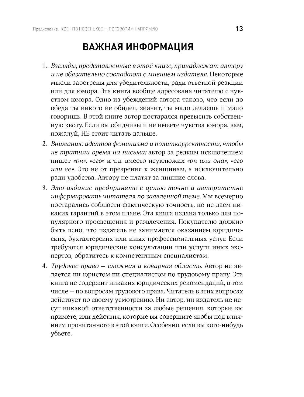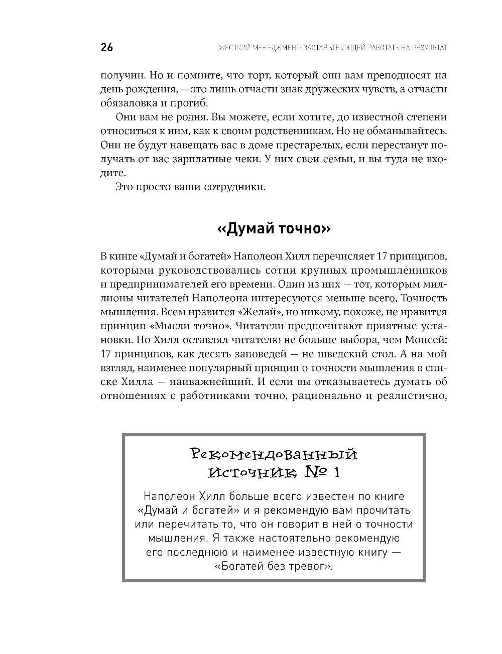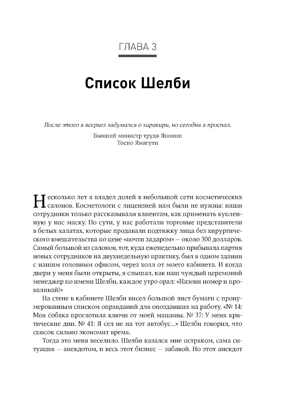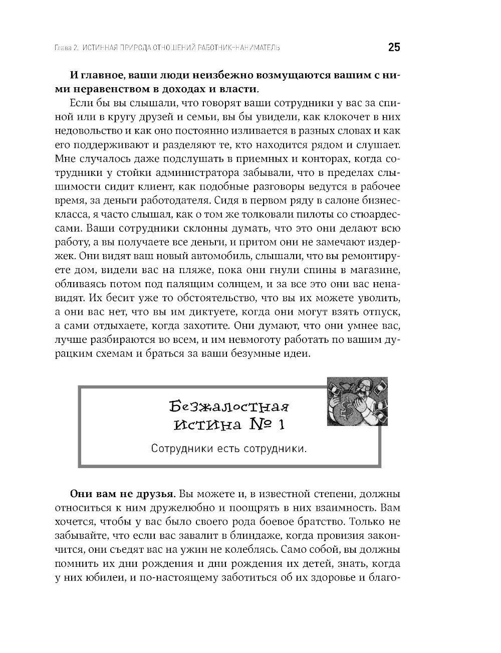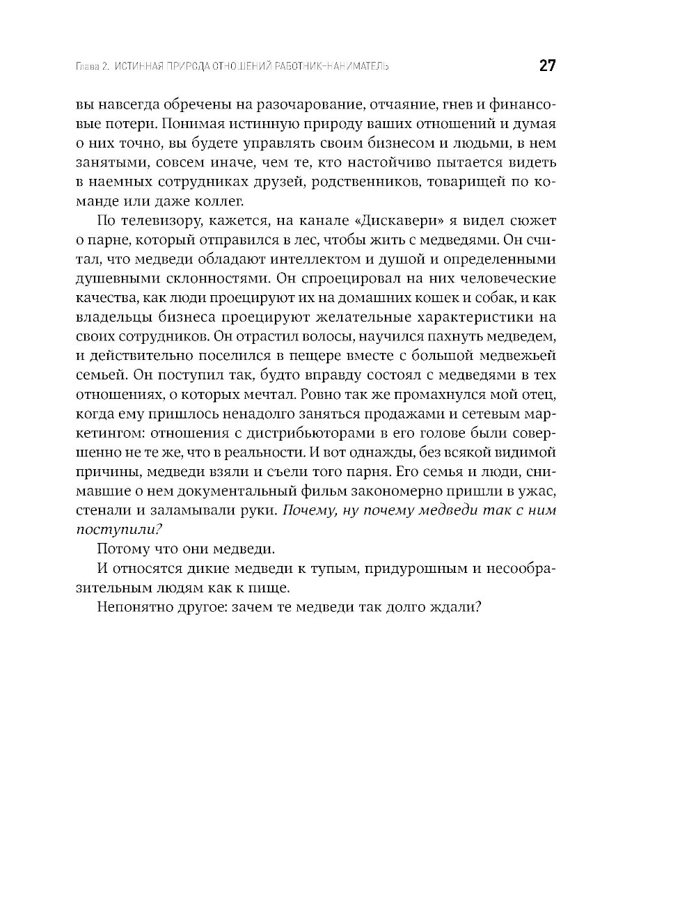 С подчиненными нужно твердо выдерживать курс. Здесь нет места никакой жалости. Никто не будет относиться к вашему бизнесу, как вы, и никто не будет столько в него вкладывать: если дело пойдет прахом, наемные работники пойдут и найдут новое место, но вы-то здесь на крючке. Конечно, в чем-то можно дать послабление, но тем, и только тем, кто этого стоит. Без конца опаздывающий, некомпетентный, попросту нечестный и недобросовестный сотрудник милости не заслуживает. От такого нужно избавляться в пожарном порядке, как от раковой опухоли. Думаете, что сможете перевоспитать людей? Замотивировать? Нет. Но вы можете создать четкие правила, твердо следуя которым заработаете гораздо больше, чем надеялись, и выстроите стабильный бизнес.| Издательство | Альпина Паблишер |