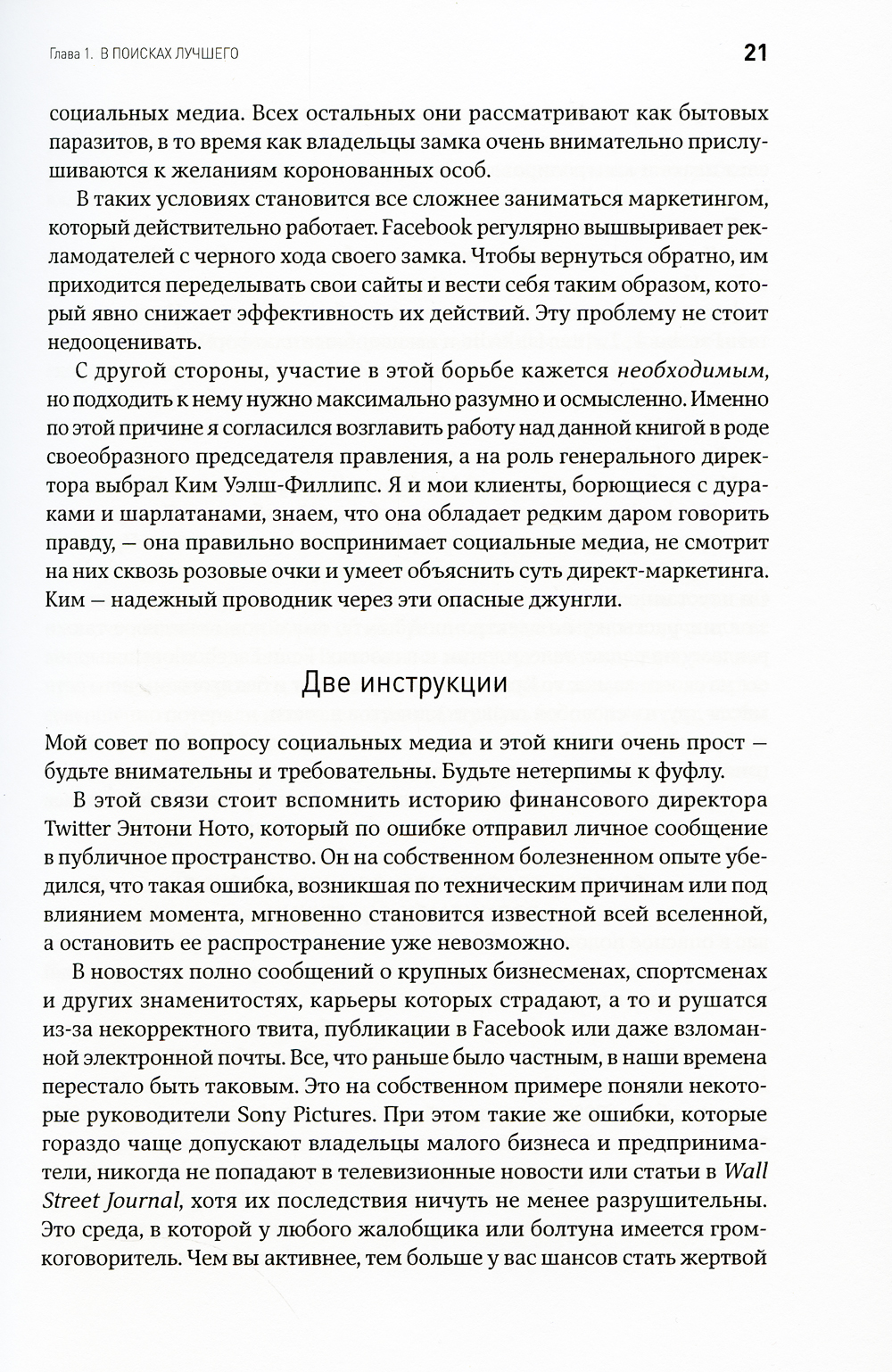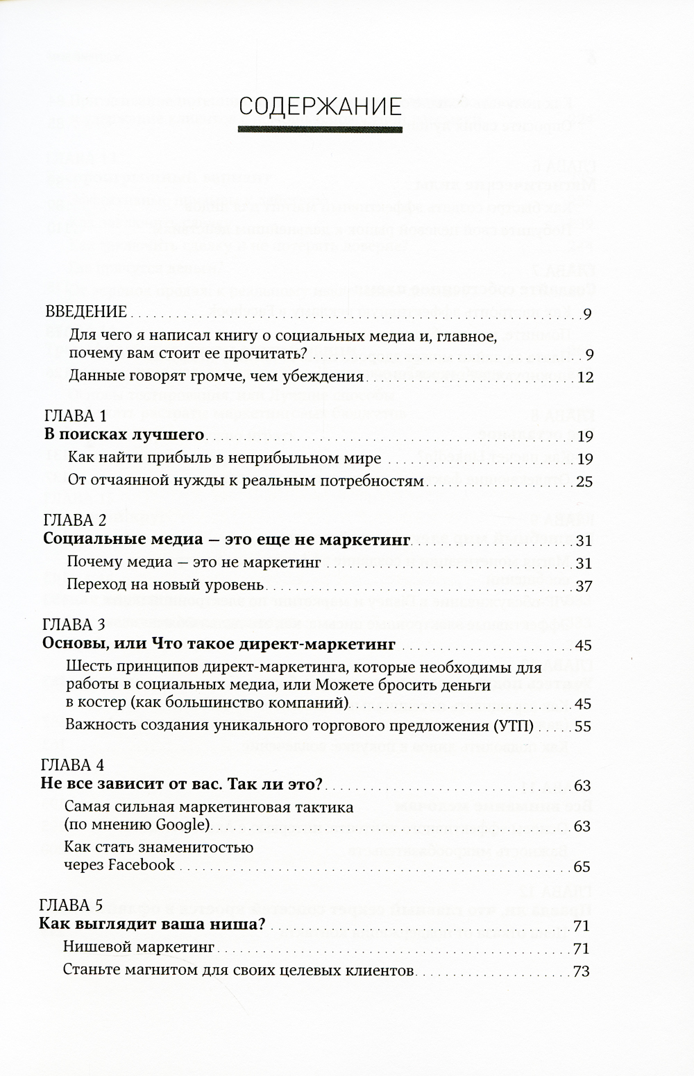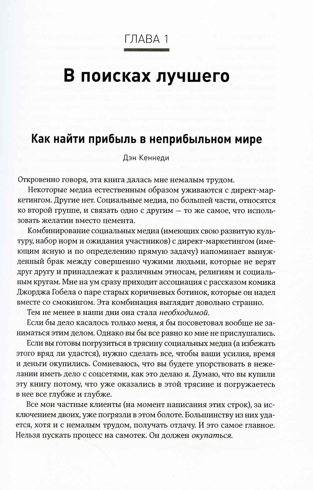Чем отличается качественный SMM от того, чем занимаются 99% компаний? Главным образом тем, что здесь нет места бахвальству размером своей компании, ориентации на количество лайков и прочим «тщеславным» метрикам. Дэн Кеннеди, предприниматель-мультимиллионер, автор бестселлера «Жесткий менеджмент», и Ким Уэлш (владелица крупного SMM-агентства) говорят о том, что качественный SMM - это всегда про деньги. Необходимо наконец научиться зарабатывать реальные деньги с помощью социальных сетей. Из книги вы узнаете, как переключить ваш SMM с заурядного производства лайков в режим активного инструмента конверсии; как перестать топить соцсети деньгами и при этом расширить аудиторию вашей компании; как создать идеальный магнит для лидов и превратить холодный трафик в реальных клиентов и, самое главное, как адекватно собирать и анализировать результаты вашей маркетинговой активности. Это необходимое чтение для всех владельцев и менеджеров компаний, кто хочет получать реальную отдачу от работы в соцсетях.| Издательство | Альпина Паблишер |